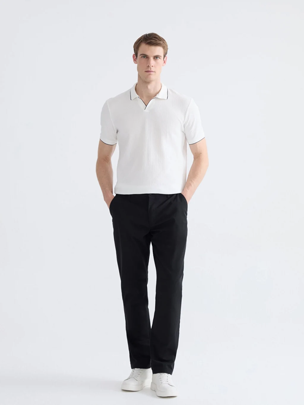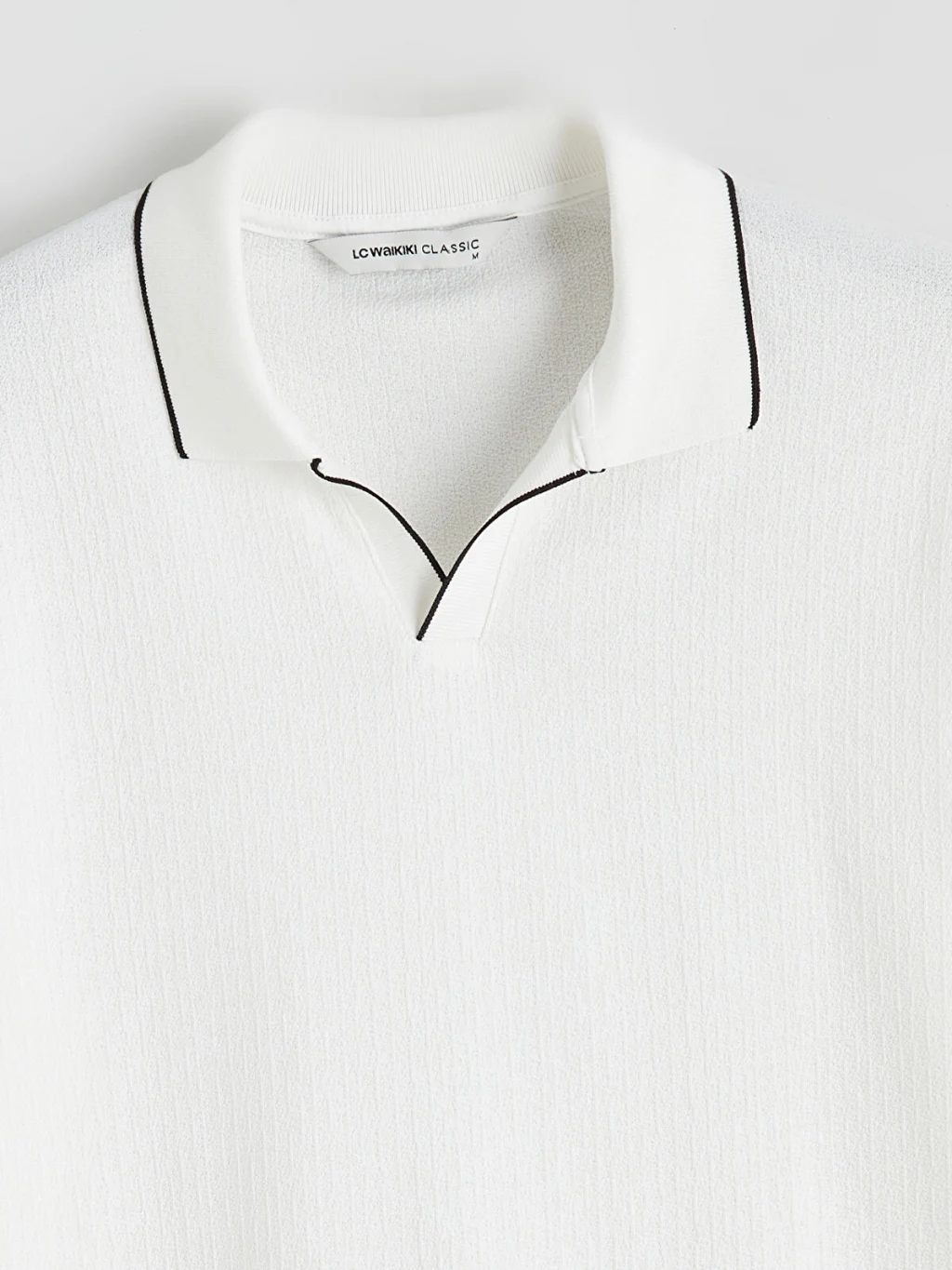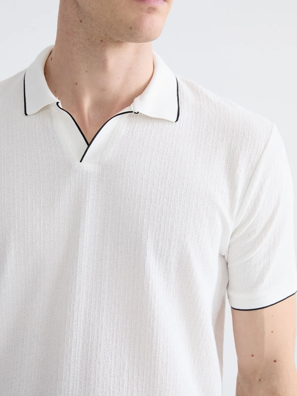 Standart kalıp, polo yakalı erkek tişört, %100 pamuklu strüktürlü kumaştan üretilmiştir. Kısa kollu olup, yaka ve kol ucu kenarları biyelidir.