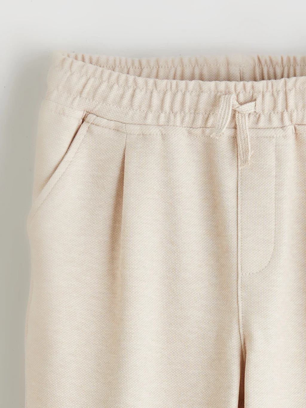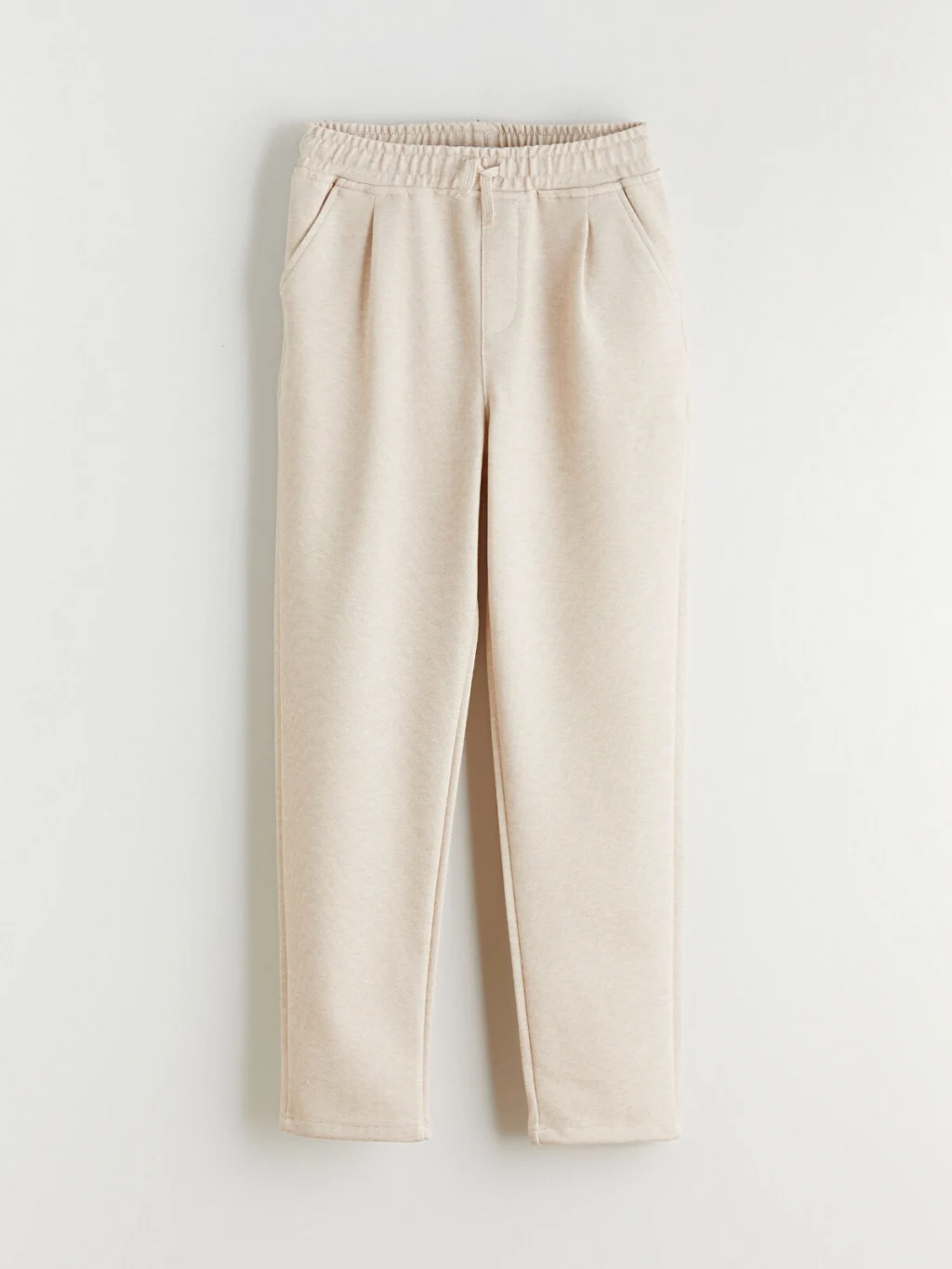Standart kalıp, beli lastikli ve düz paça kesimli erkek çocuk pantolon, poliviskon kumaştan üretilmiştir. Yan cepleri ve önü penslidir.