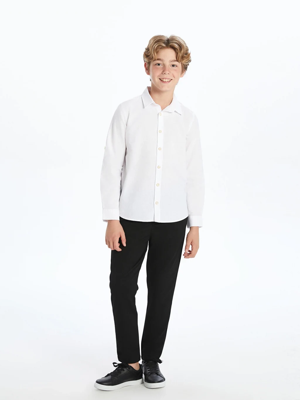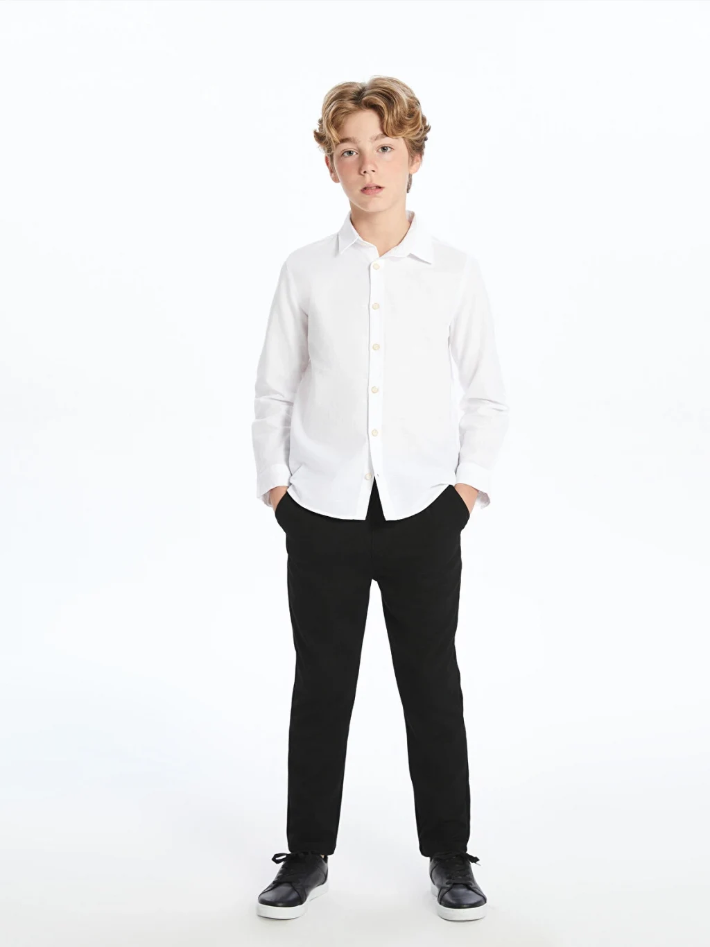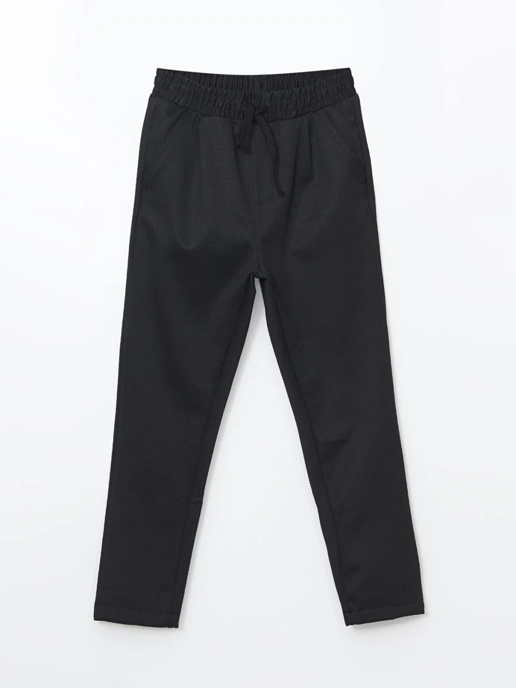 Standart kalıplı erkek çocuk pantolon, poliviskon kumaştan üretilmiştir. Beli lastikli, ayarlanabilir bağcıklı, yan cepli ve düz paçalıdır.