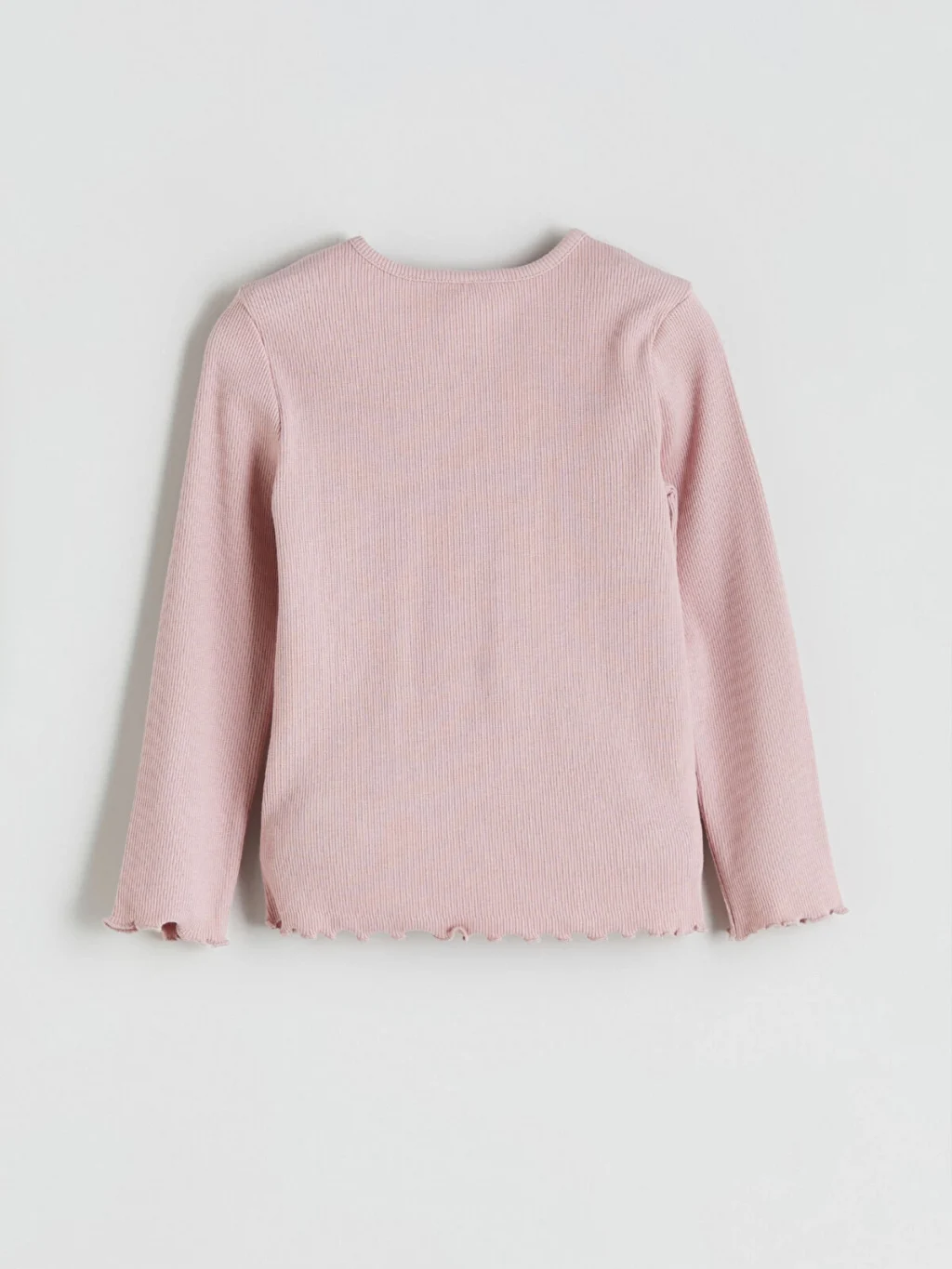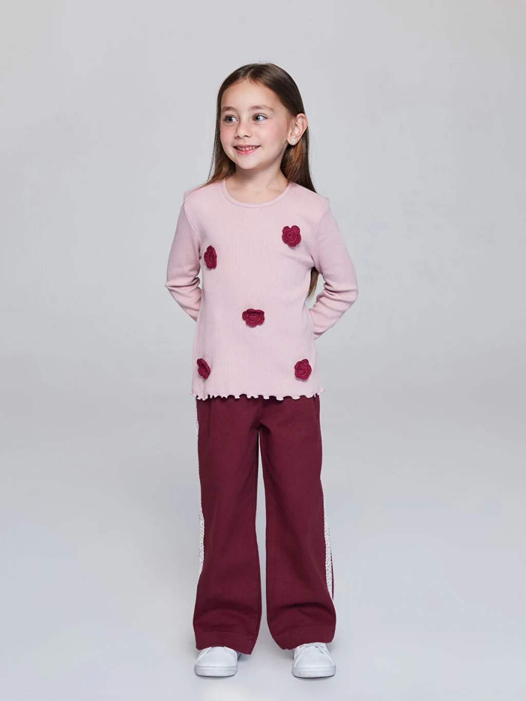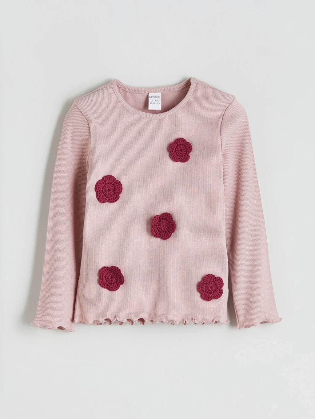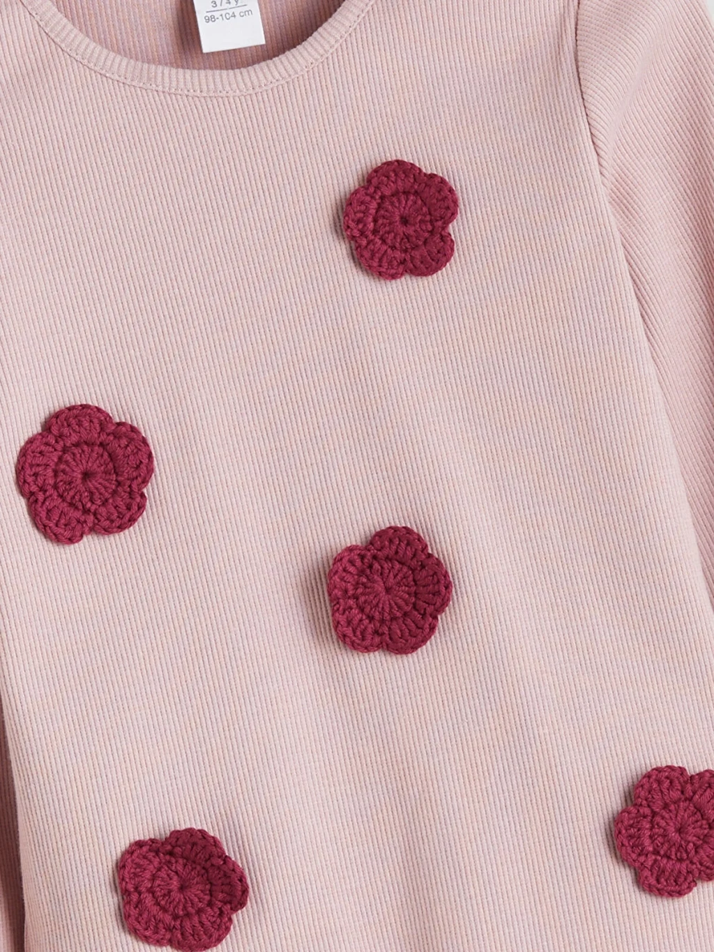 Dar kalıplı kız çocuk bluz, bisiklet yakalı ve uzun kolludur. Kaşkorse kumaşlı ürünün önünde örgü çiçek aplikeleri bulunur.