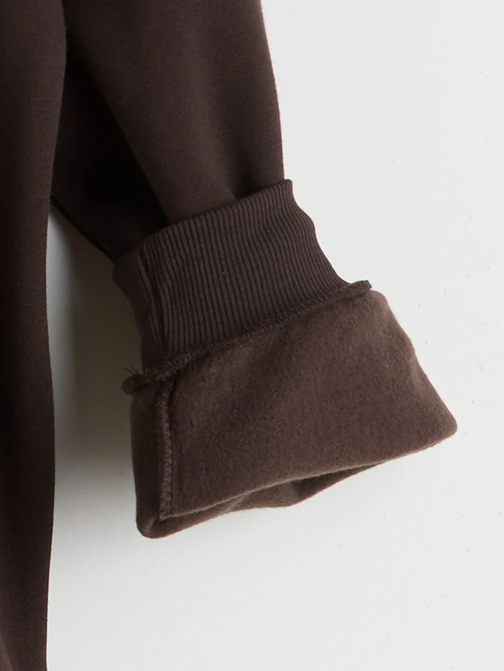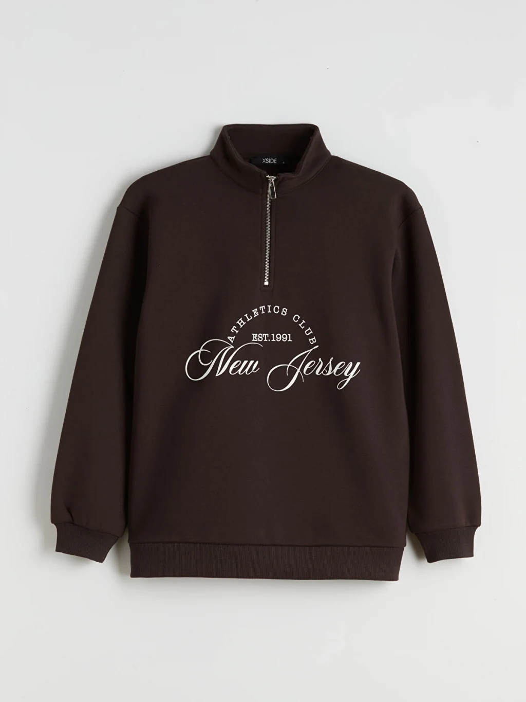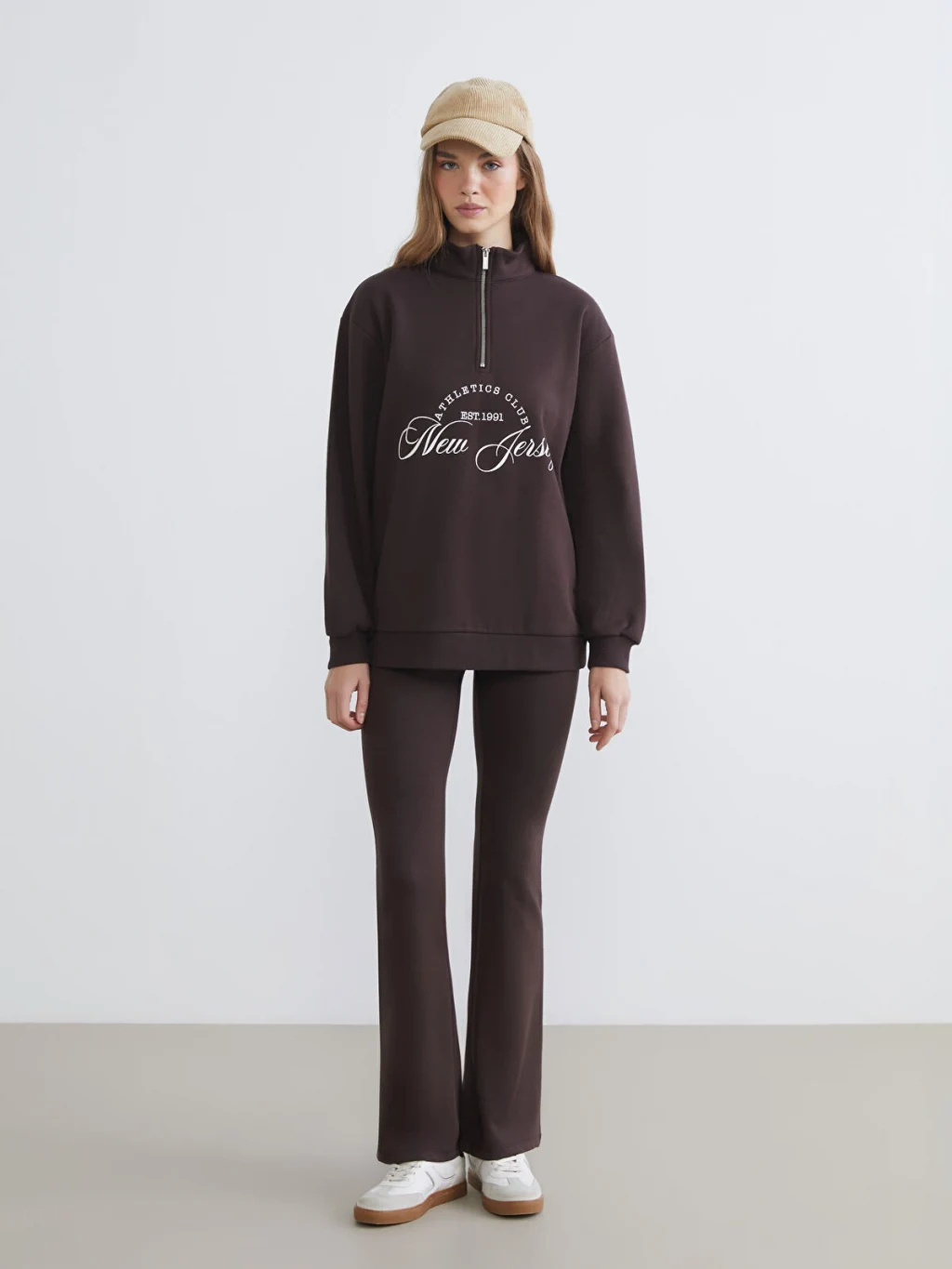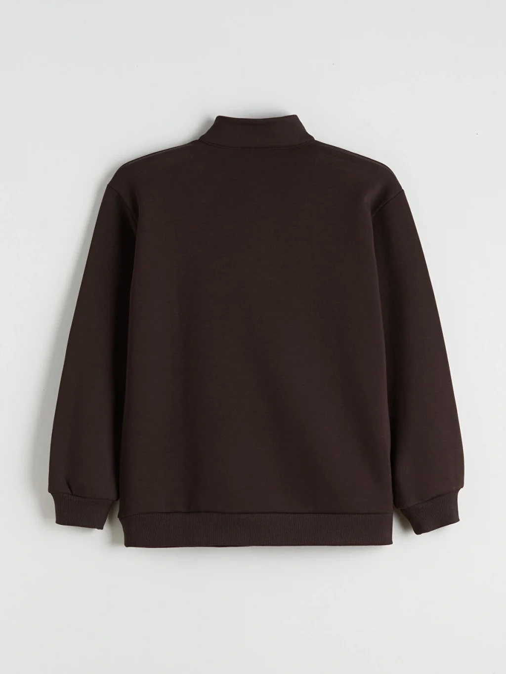 Dik yaka uzun kollu kadın sweatshirt, 3 iplik şardonlu kumaştan üretilmiştir. Yakası fermuarlı, bilekleri ve alt kısmı ribanalıdır.