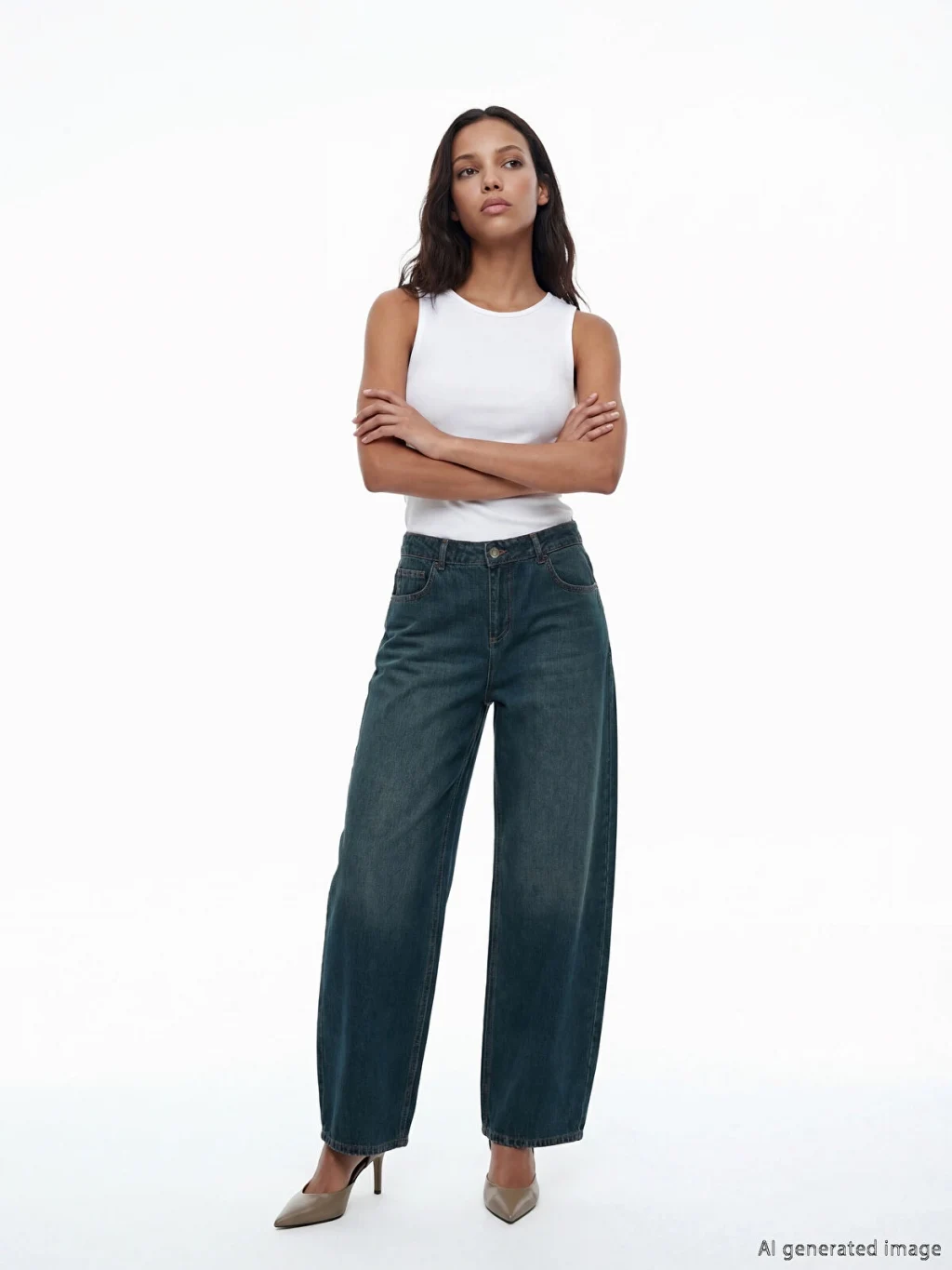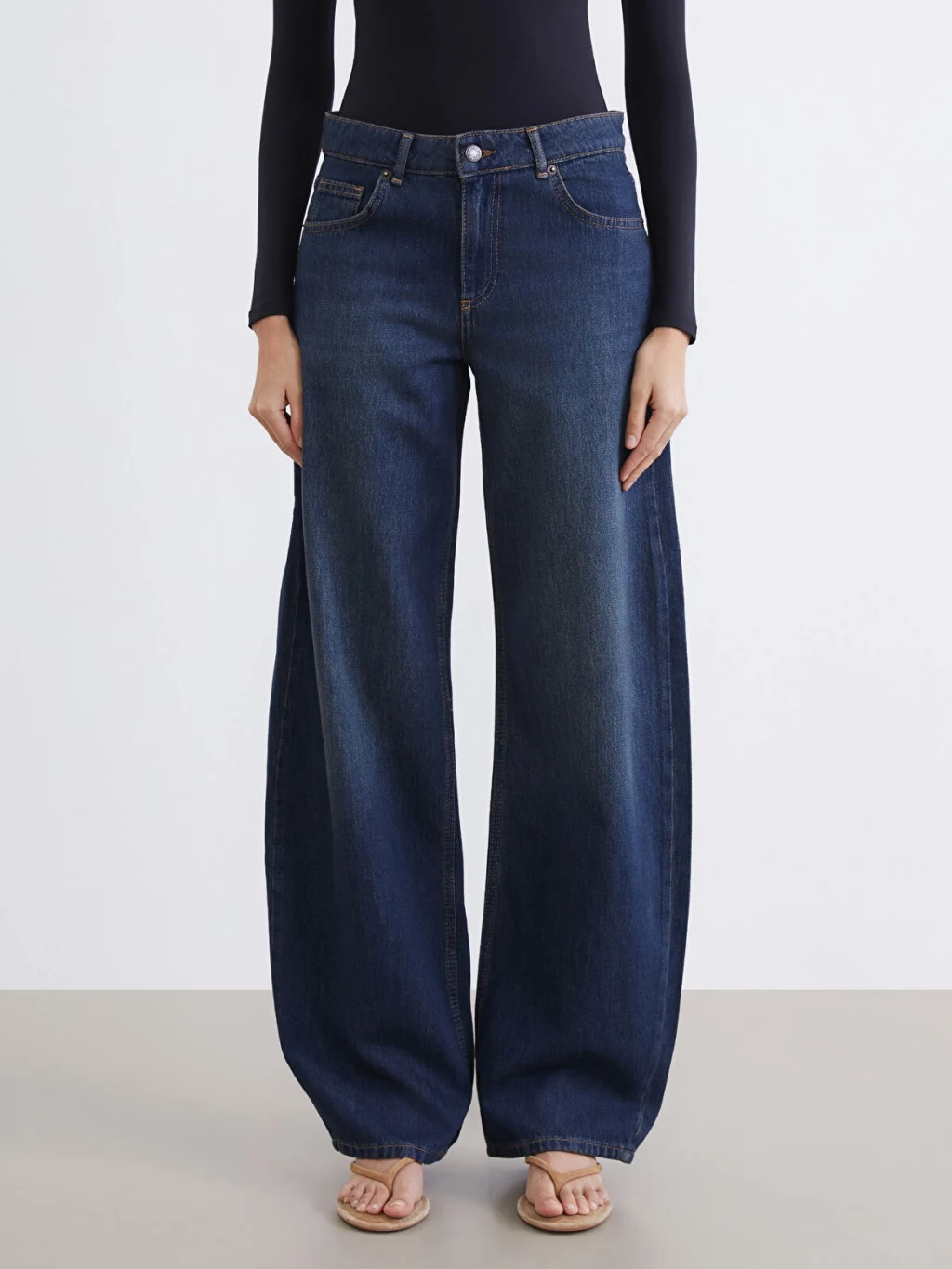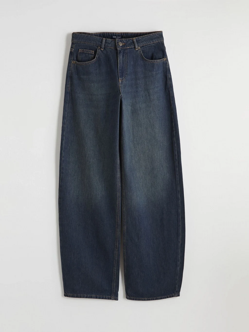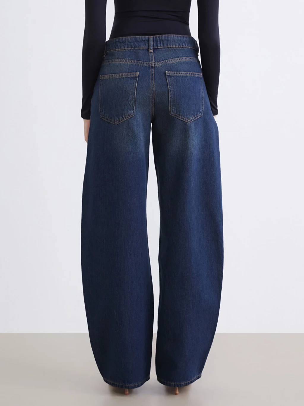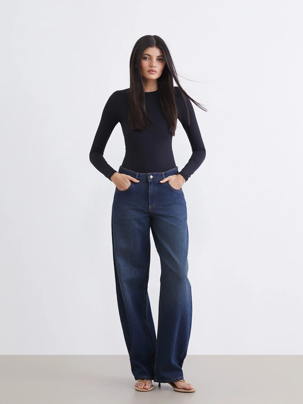 Balloon fit kadın jean pantolon, pamuklu denim kumaştan üretilmiştir. Beş cepli tasarıma sahip olup fermuar ve düğme kapamalıdır.