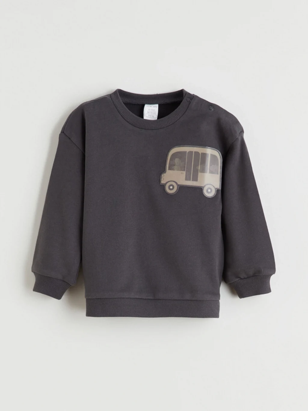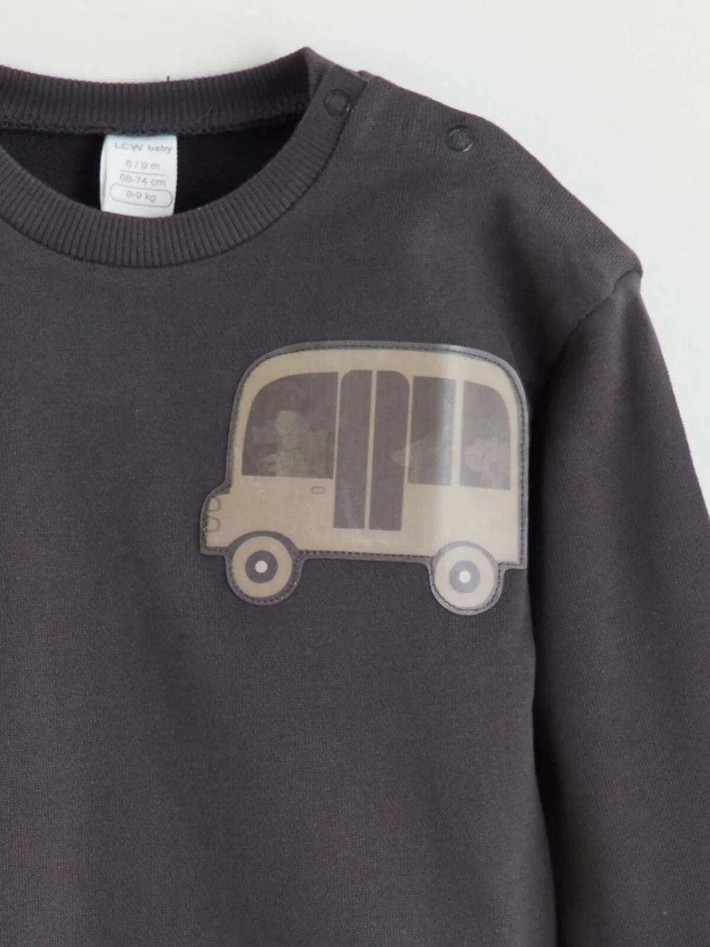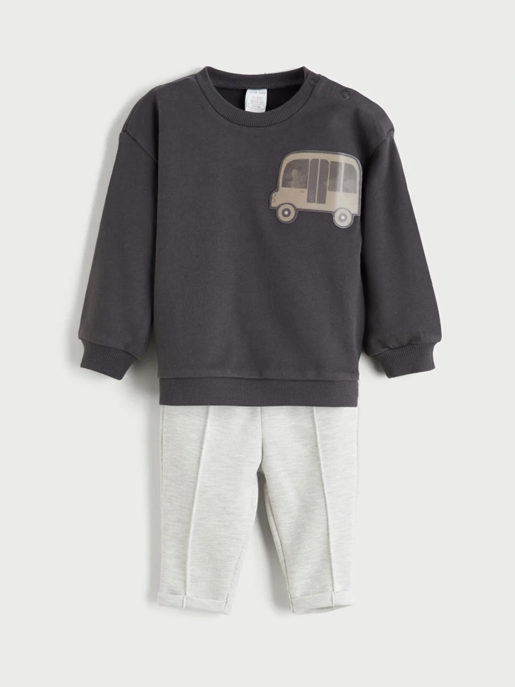 Erkek bebek takım, bisiklet yaka, uzun kollu, omuzdan çıtçıt kapamalı ve aplike detaylı üst ile paçaları kıvrık pantolondan oluşur.