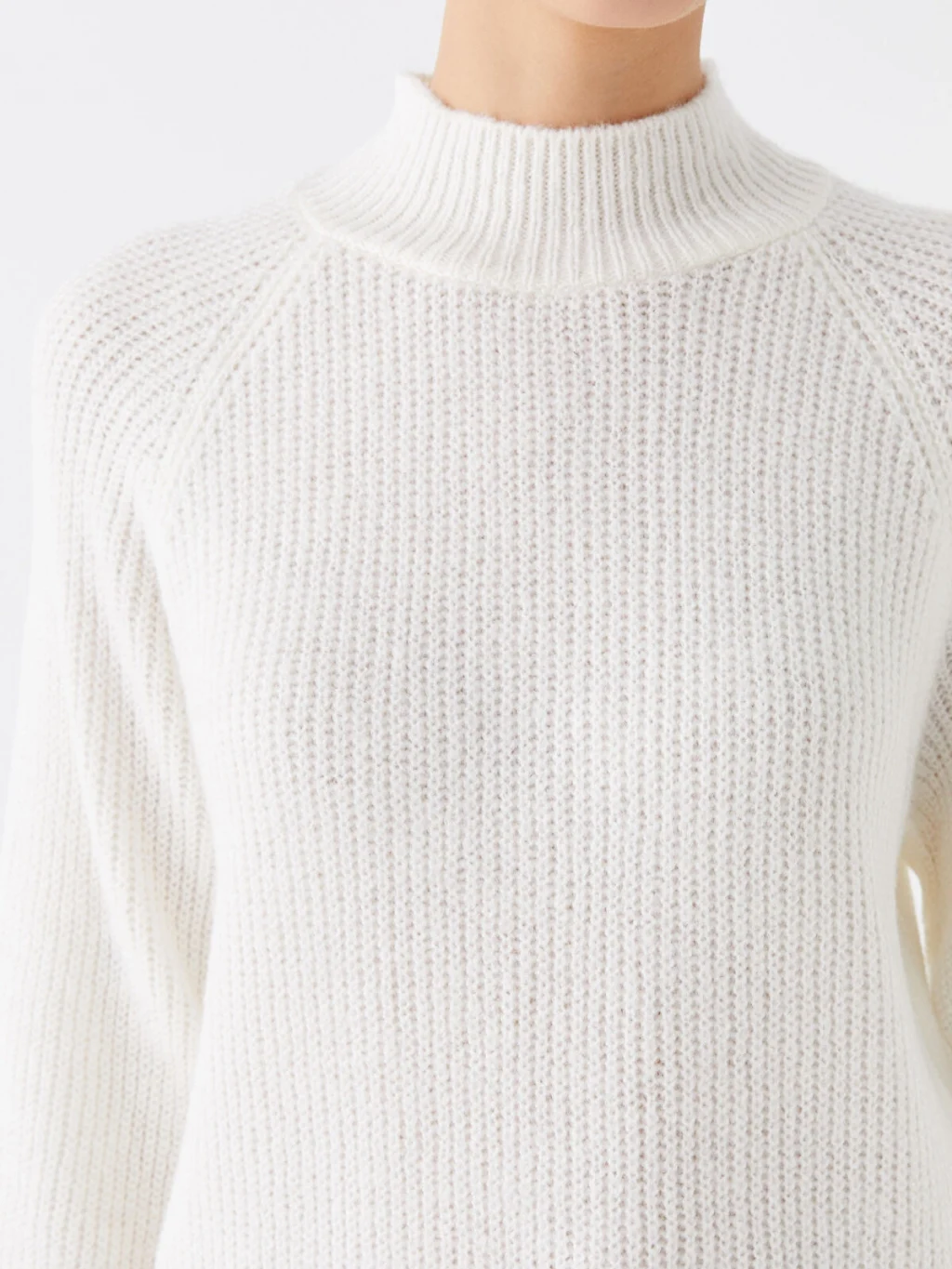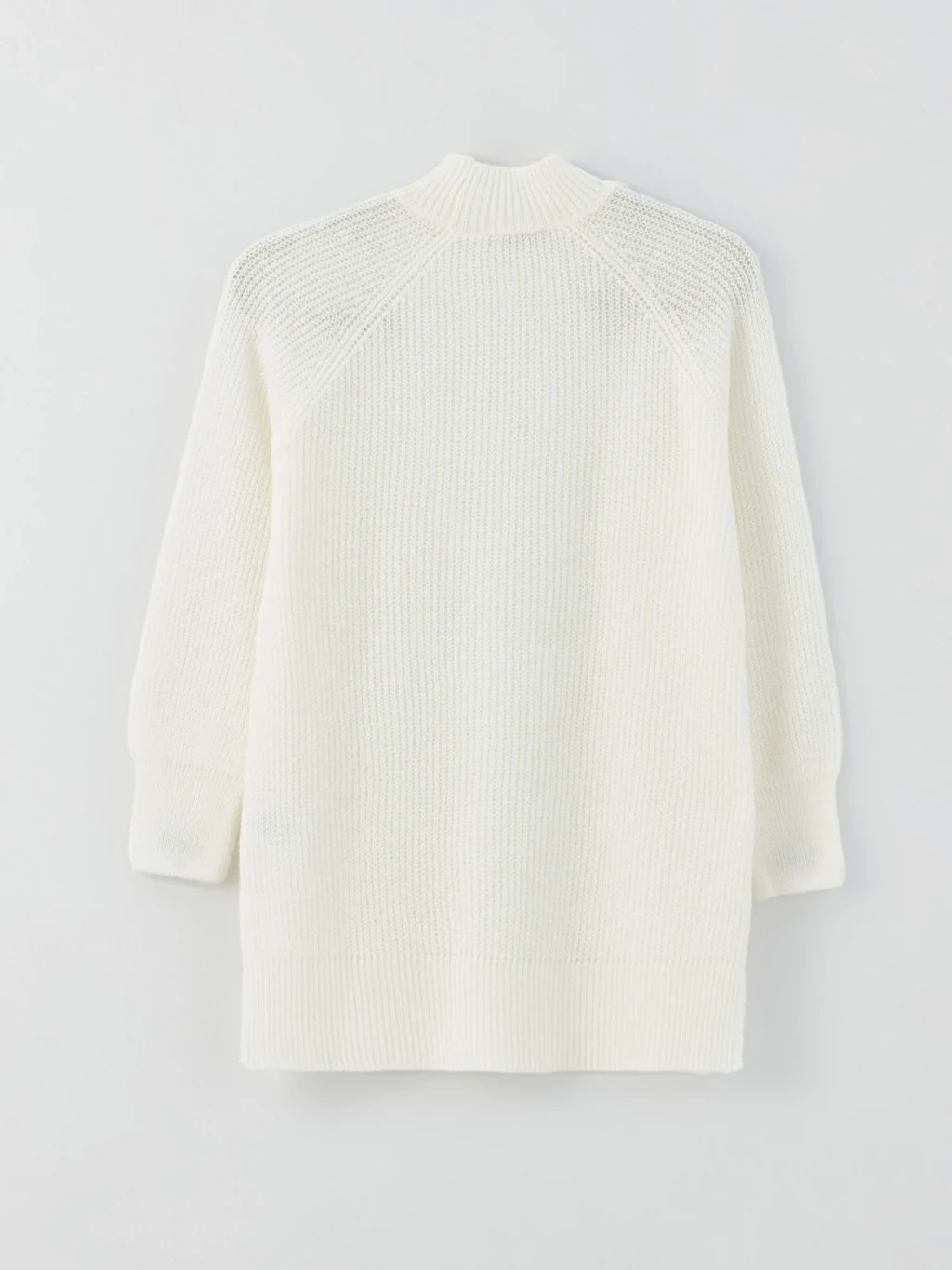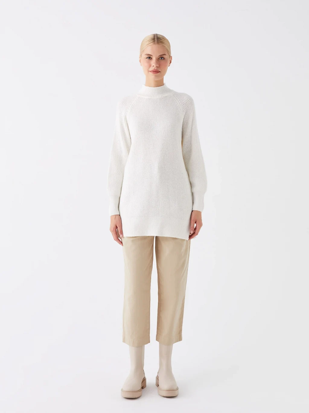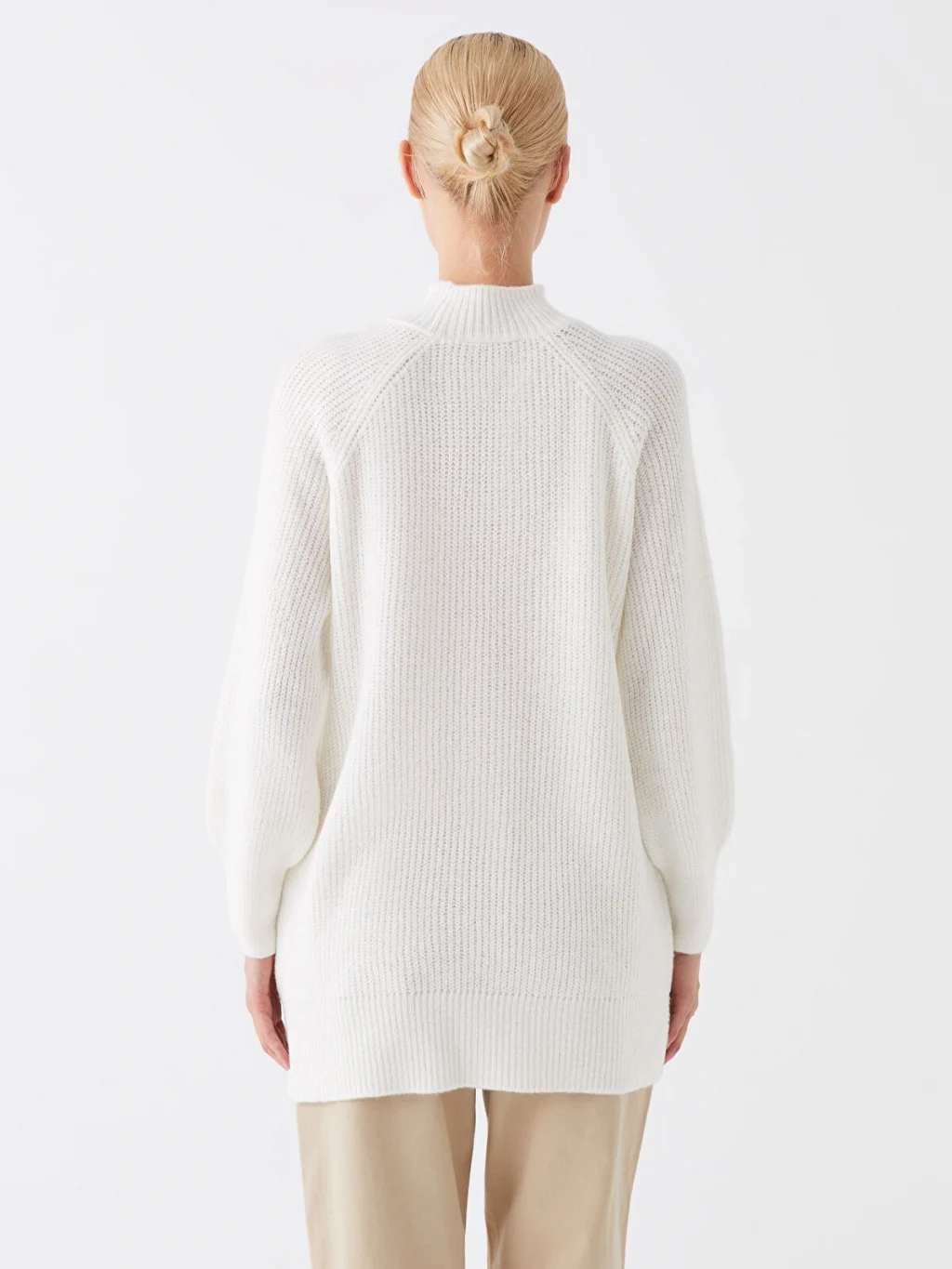 Yarım balıkçı yakalı ve uzun reglan kollu kadın triko tunik, basen boyu kesime ve yanları yırtmaçlı etek ucuna sahiptir.