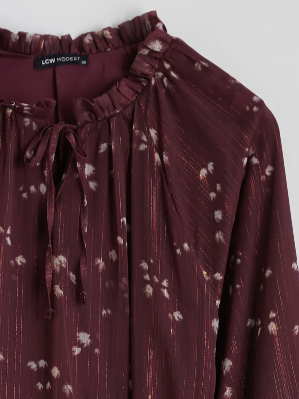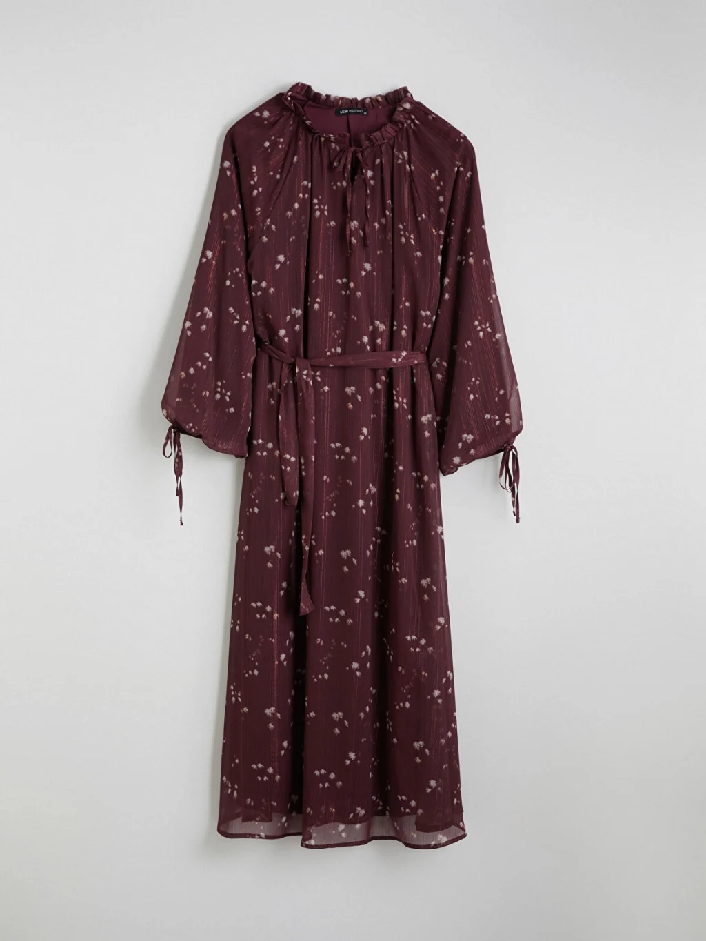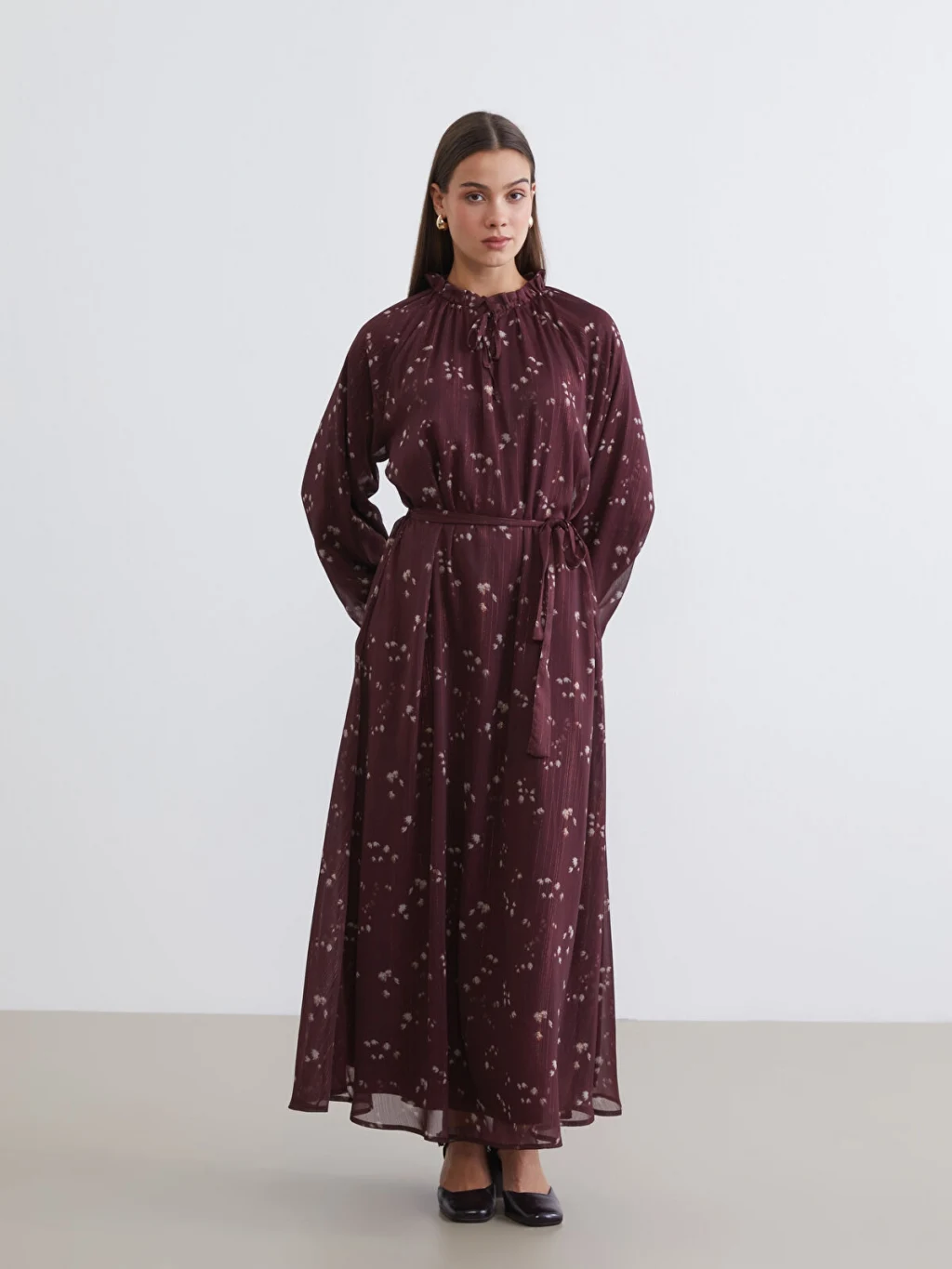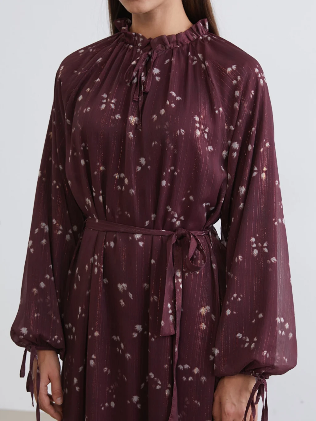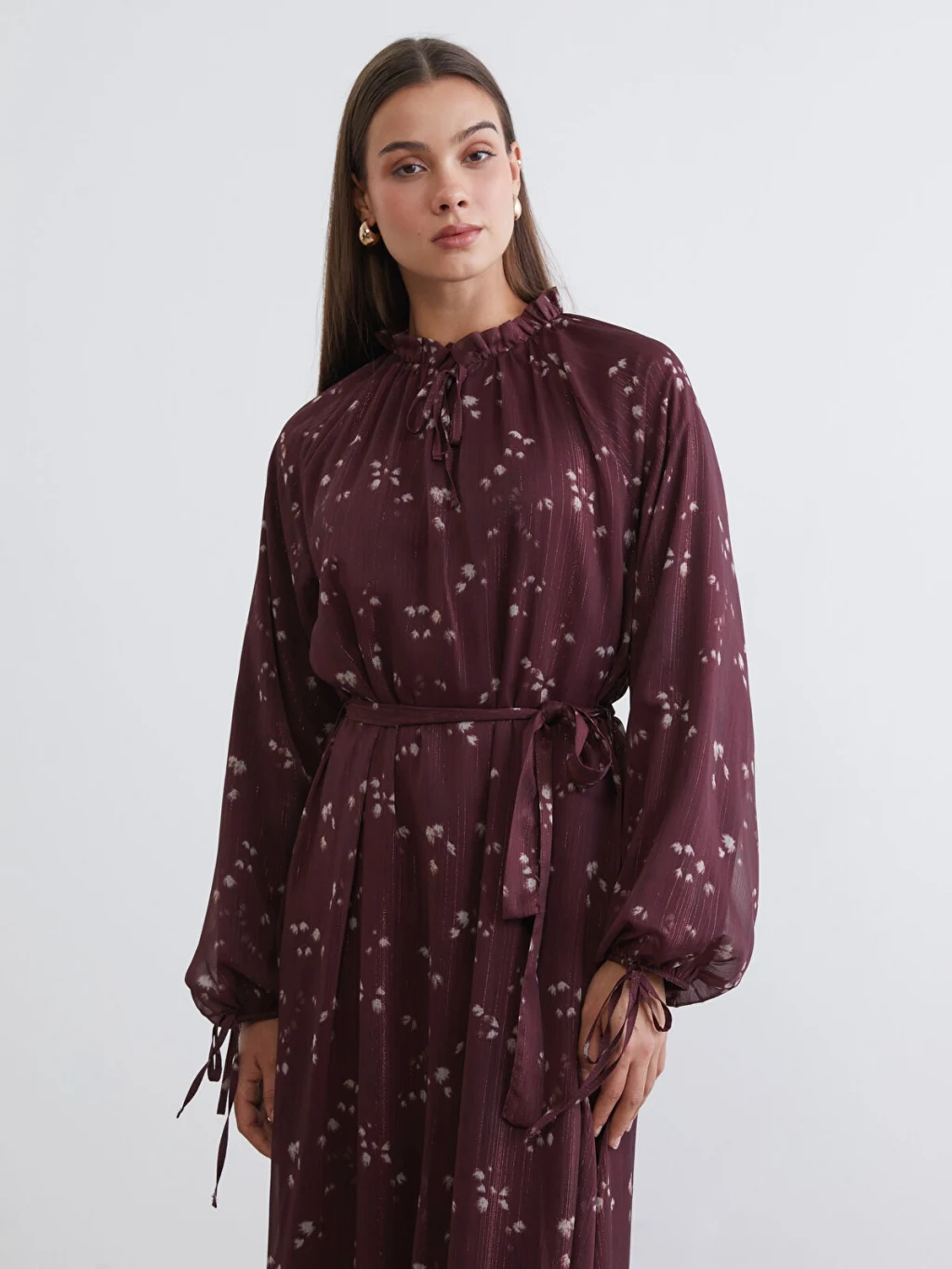Fırfırlı bağlamalı yakalı kadın elbise, desenli kumaşa sahiptir. Uzun kolludur, kol uçları bağlamalıdır ve beli kuşaklıdır.