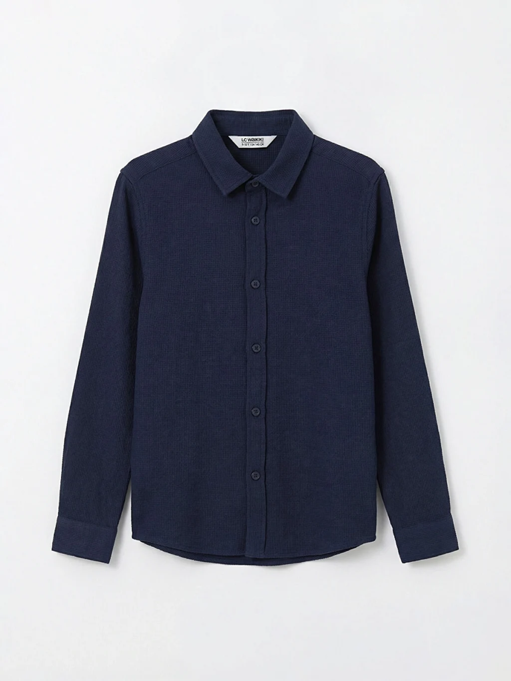 Erkek çocuk gömlek, armürlü kumaştan üretilmiştir. Uzun kollu tasarıma sahip olup önden düğme kapamalıdır.