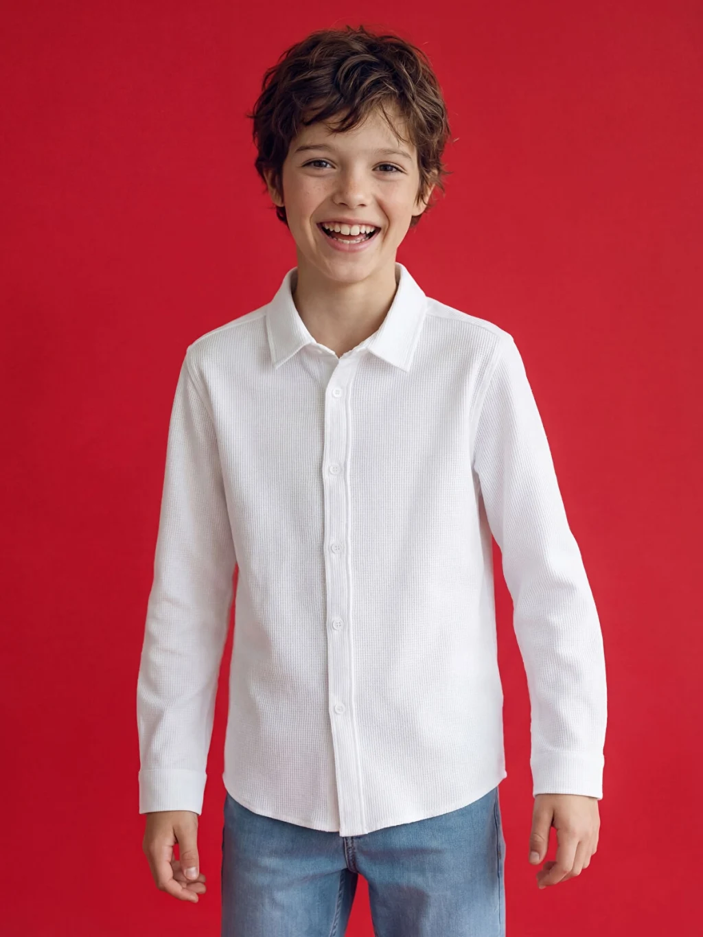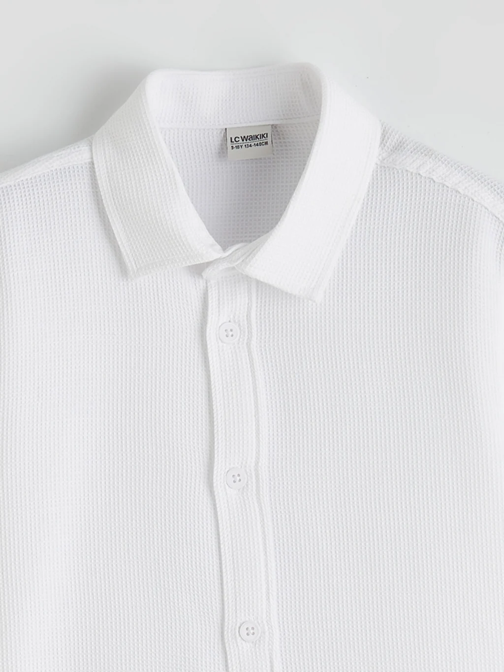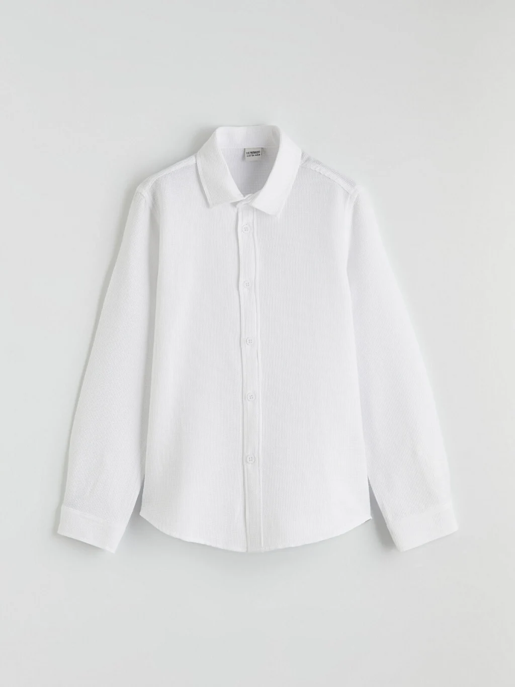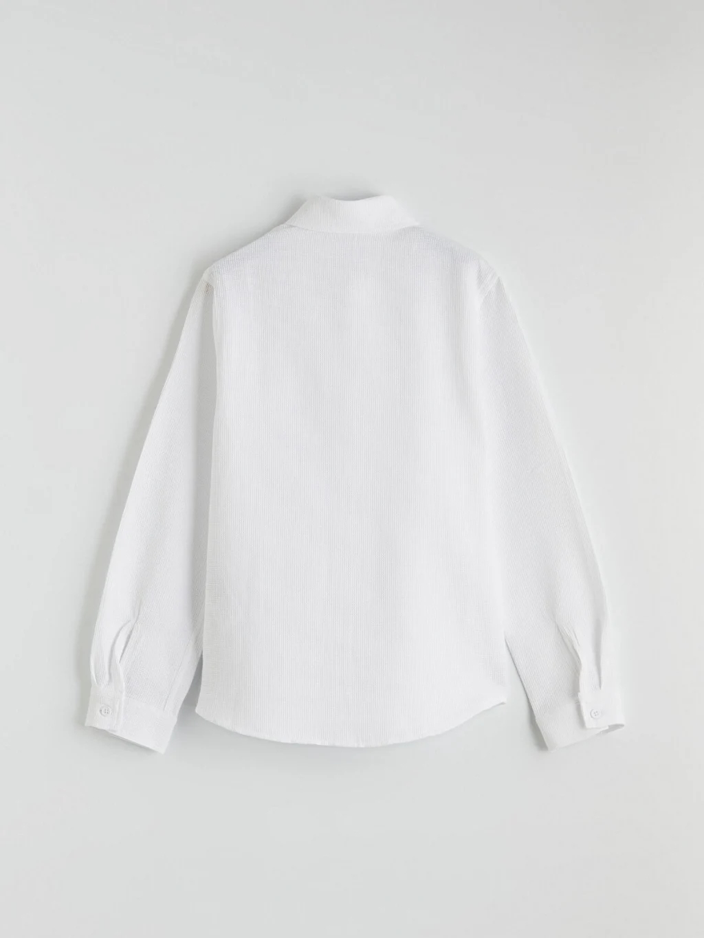 Armürlü kumaştan üretilmiş erkek çocuk gömlek, uzun kollu ve önden düğme kapamalı bir tasarıma sahiptir.