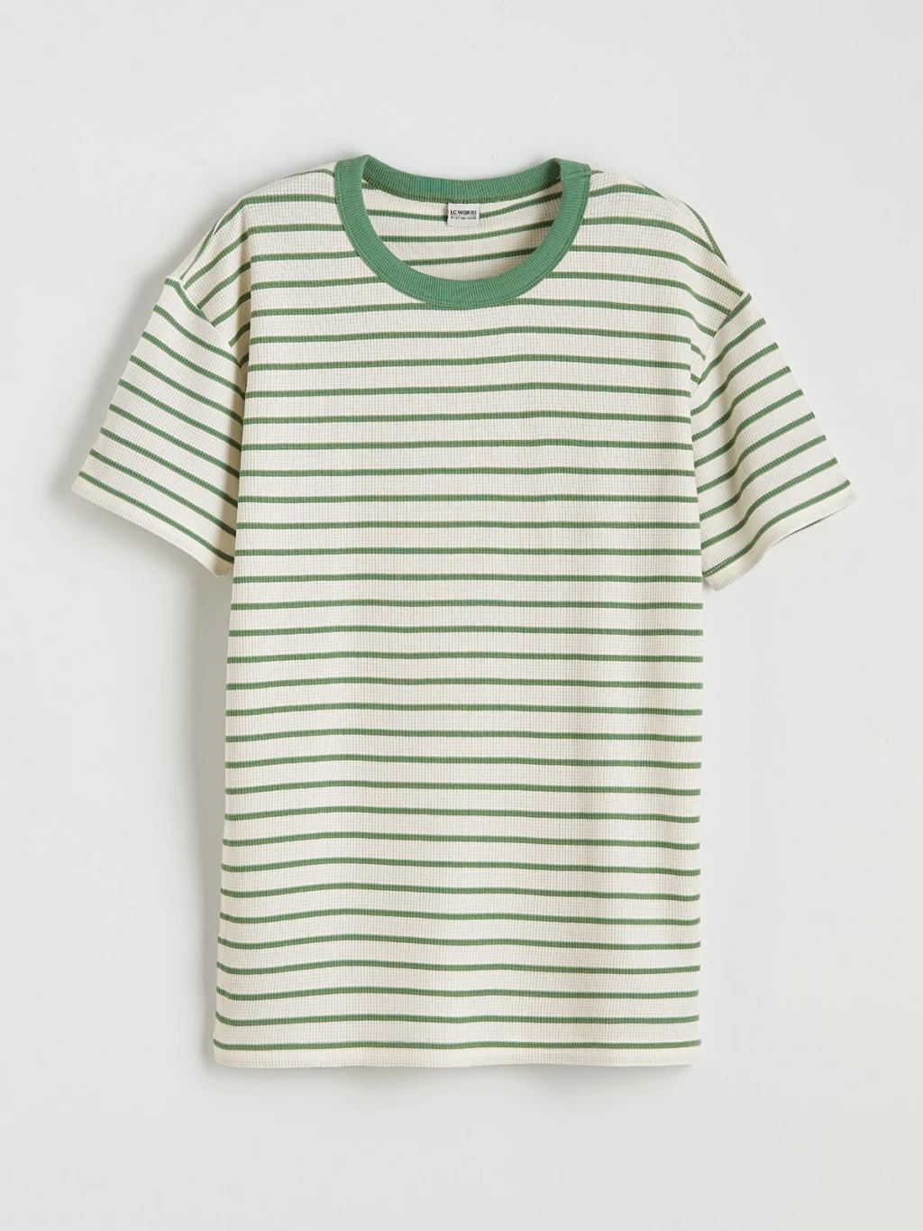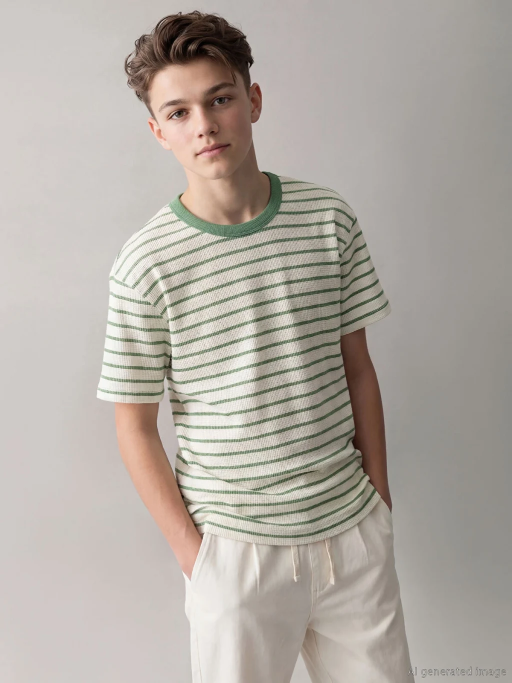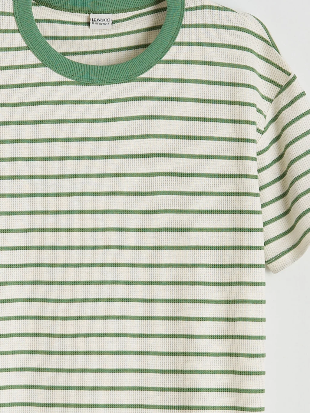 Bisiklet yaka ve kısa kollu erkek çocuk tişört, standart kalıptır. Çizgili desenli waffle kumaştan üretilmiştir ve %100 Pamuk içeriğe sahiptir.