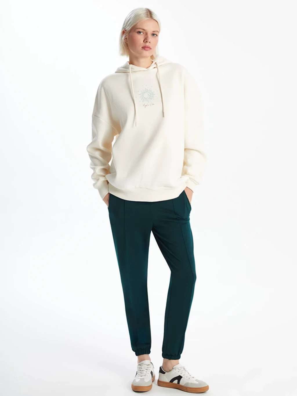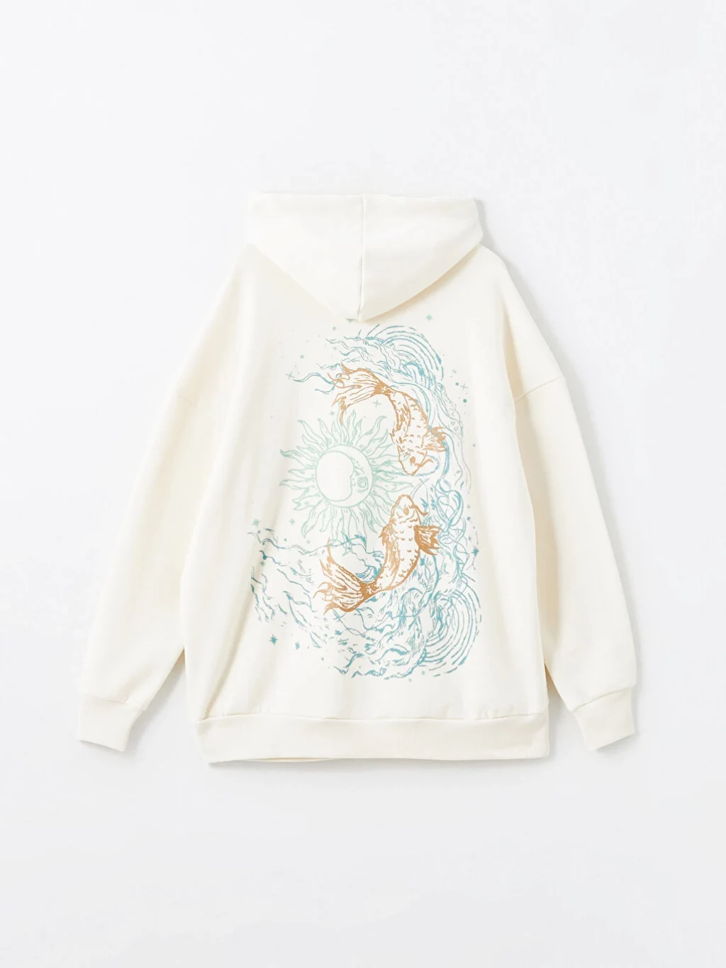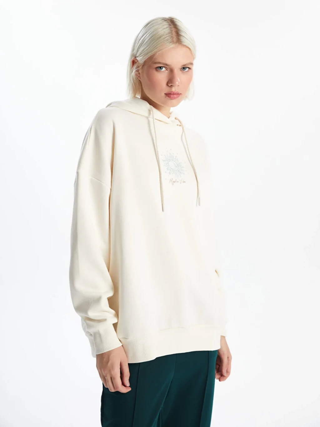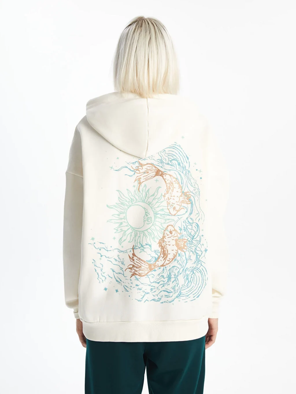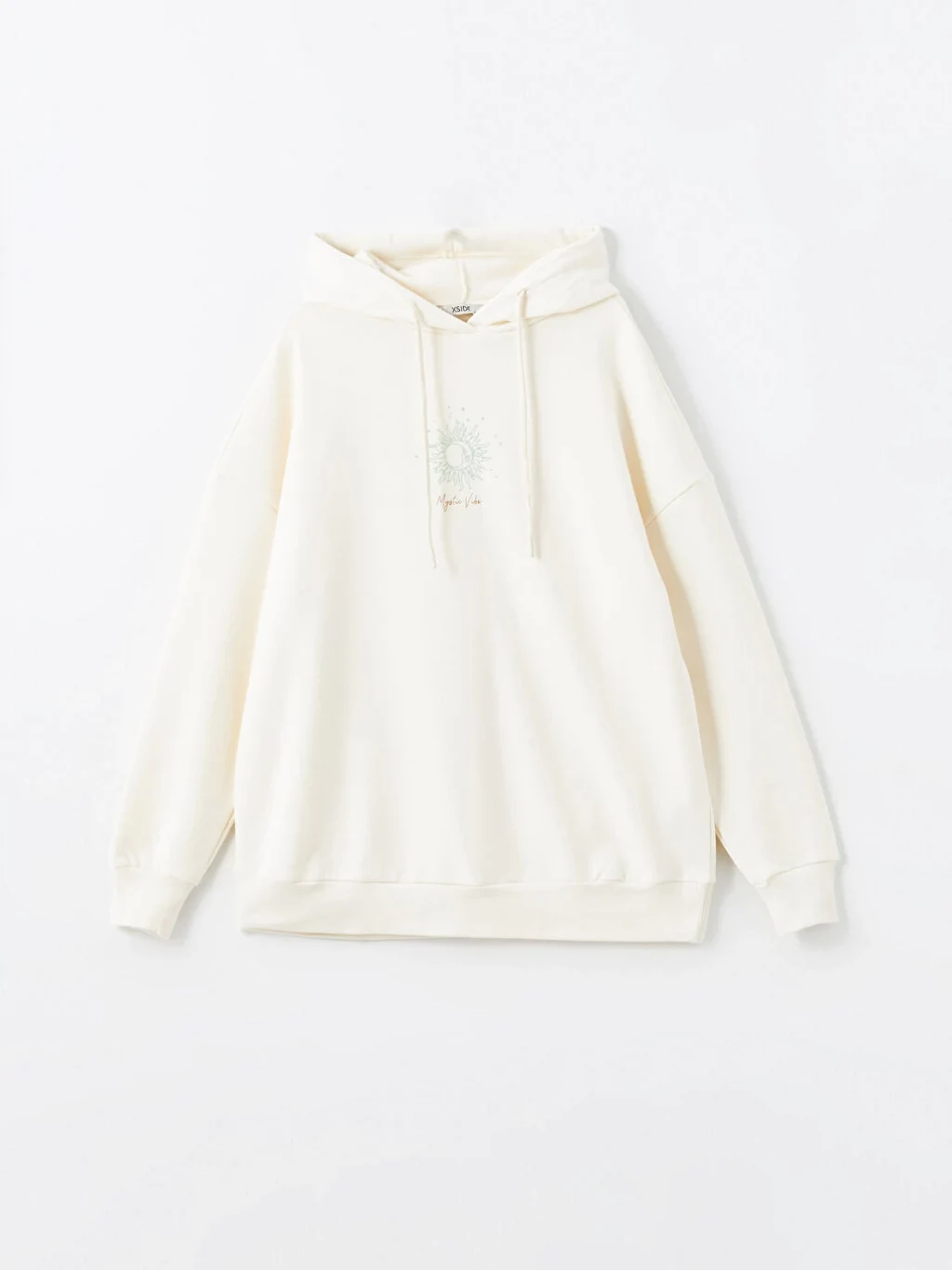 Baskılı oversize kadın hoodie, 3 iplik kumaştan üretilmiştir. İçi yumuşak tüylü olan kapüşonlu sweatshirt, konforlu bir giyim deneyimi sunar. Bilek ve alt kısmındaki ribana detayları sayesinde vücuda tam oturur.