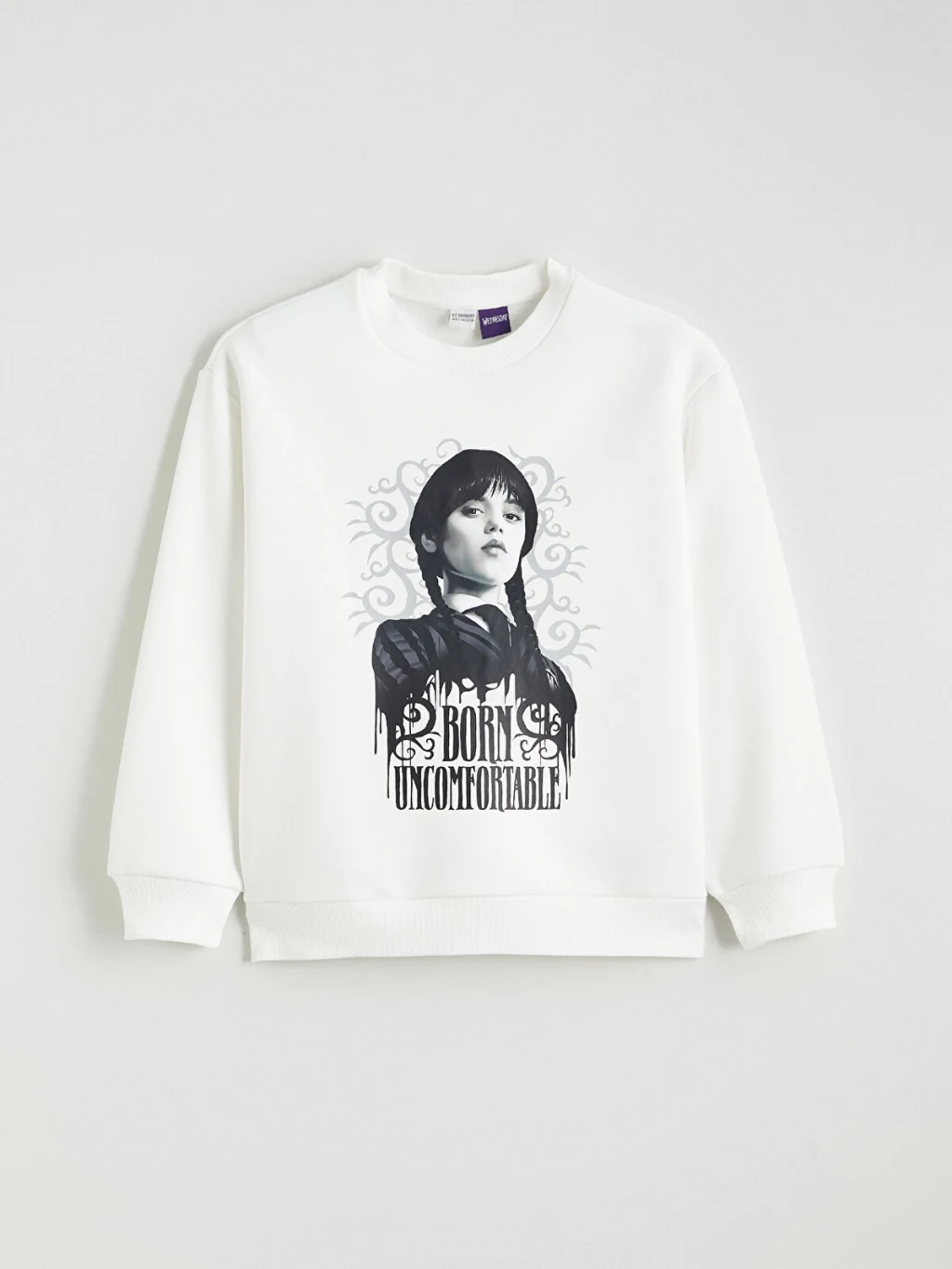 Wednesday lisanslı kız çocuk sweatshirt, bisiklet yakalı ve uzun kolludur. Kalın, 3 iplik şardonlu kumaştan üretilmiştir.