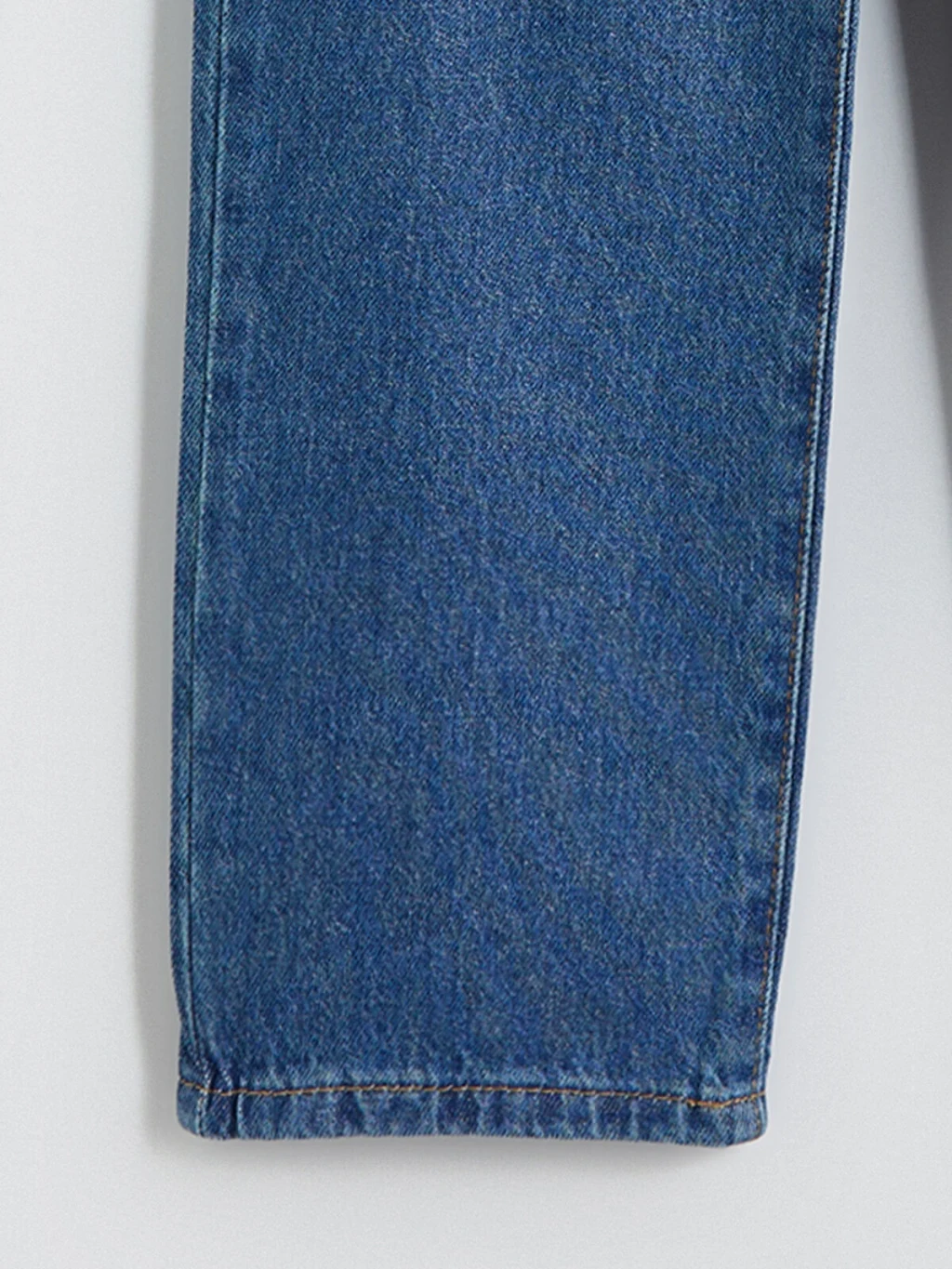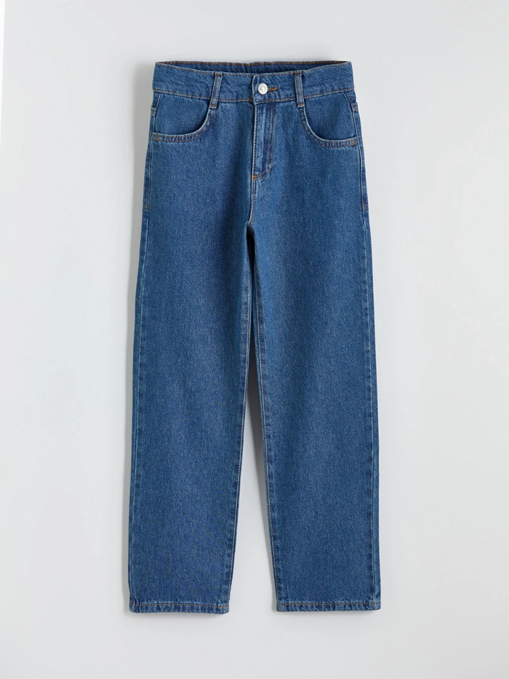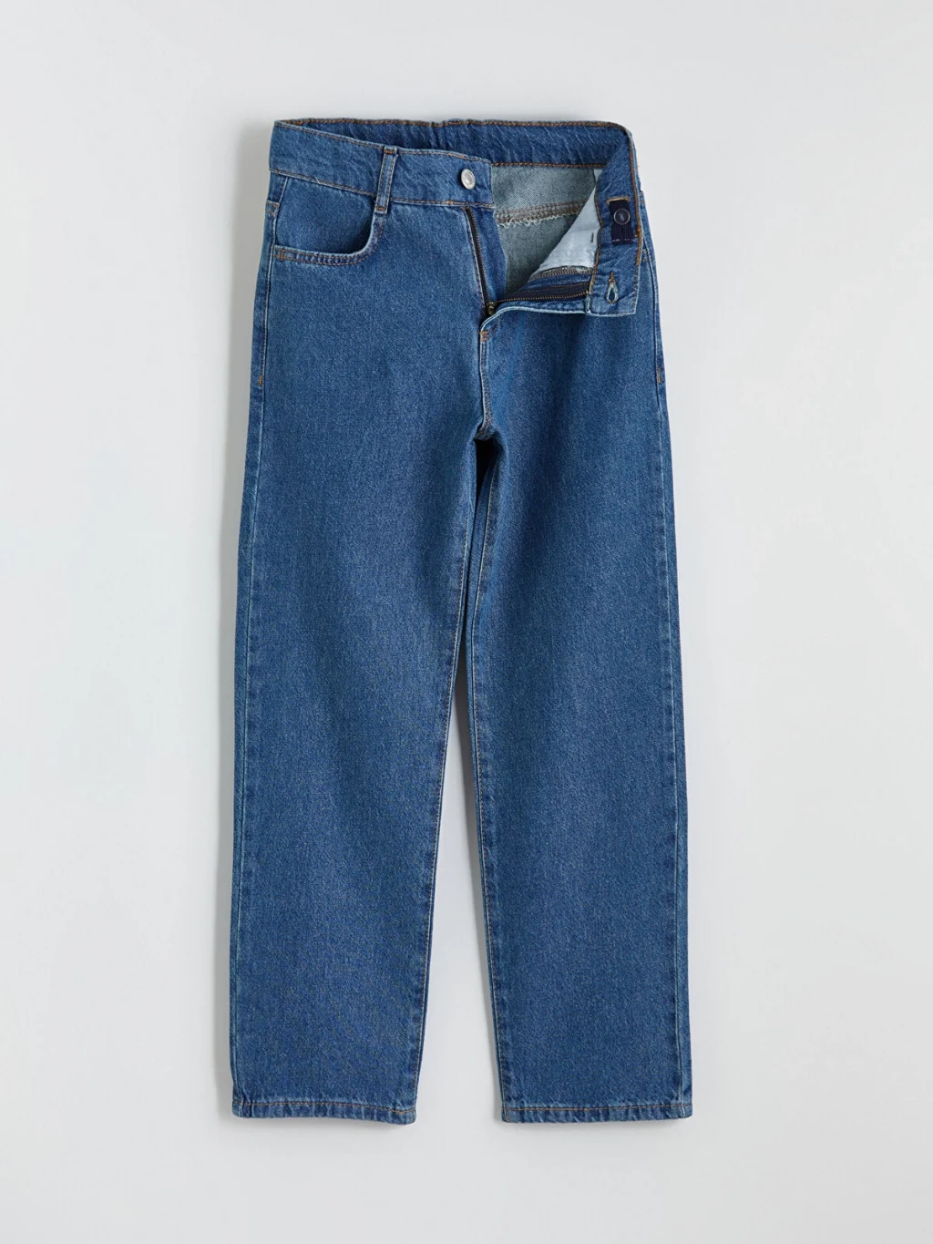 Bol kesimli erkek çocuk jean pantolon, pamuklu denim kumaştan üretilmiştir. Beş cepli tasarıma sahip olup fermuar ve düğme kapamalıdır.