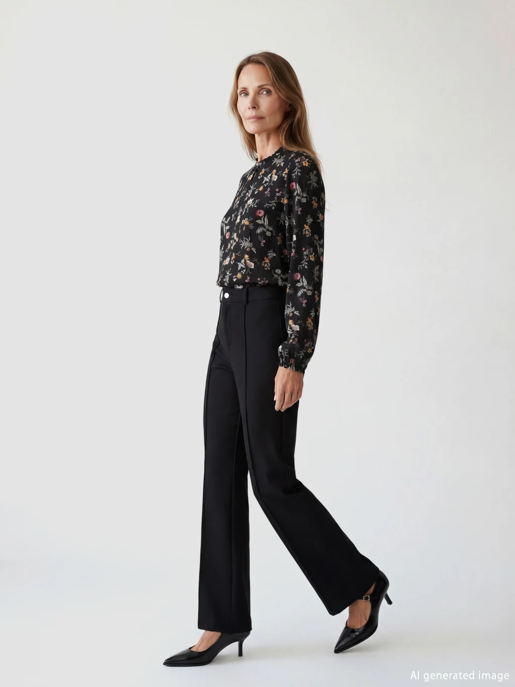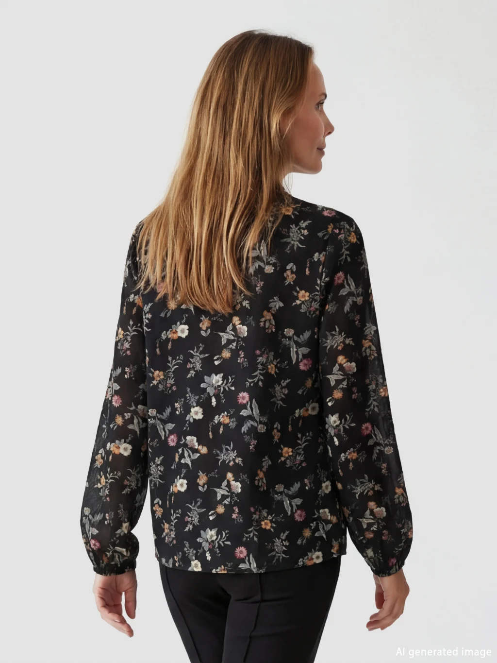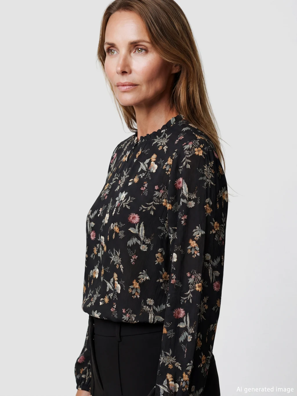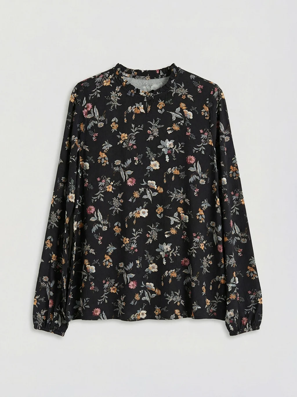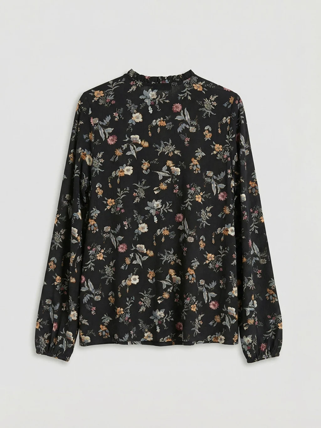 Standart kalıp, çiçekli kadın bluz. Fırfırlı dik yakalı, uzun kollu ve kol uçları lastiklidir. Yakası düğme kapamalıdır.