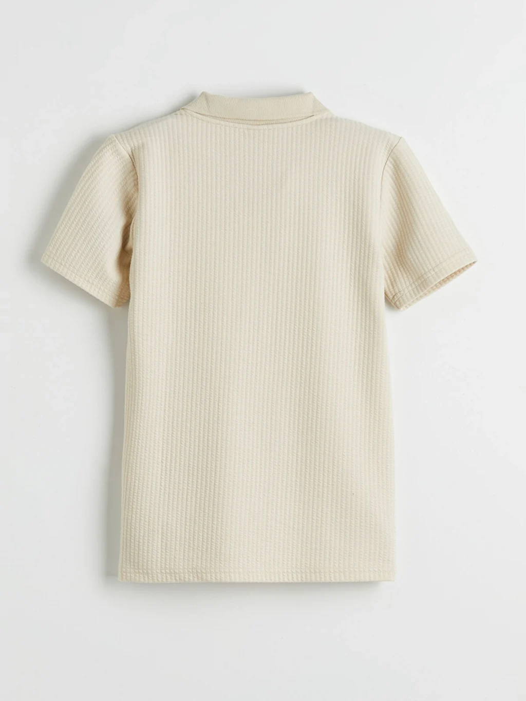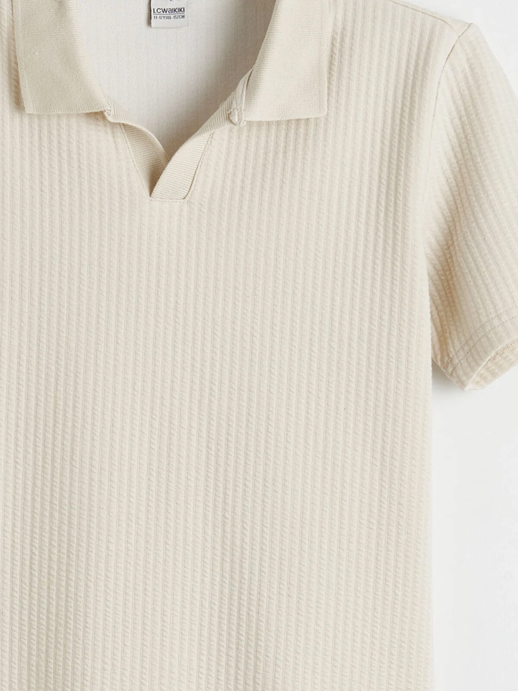 Polo yakalı ve kısa kollu erkek çocuk tişört, dokulu kumaştan üretilmiştir.