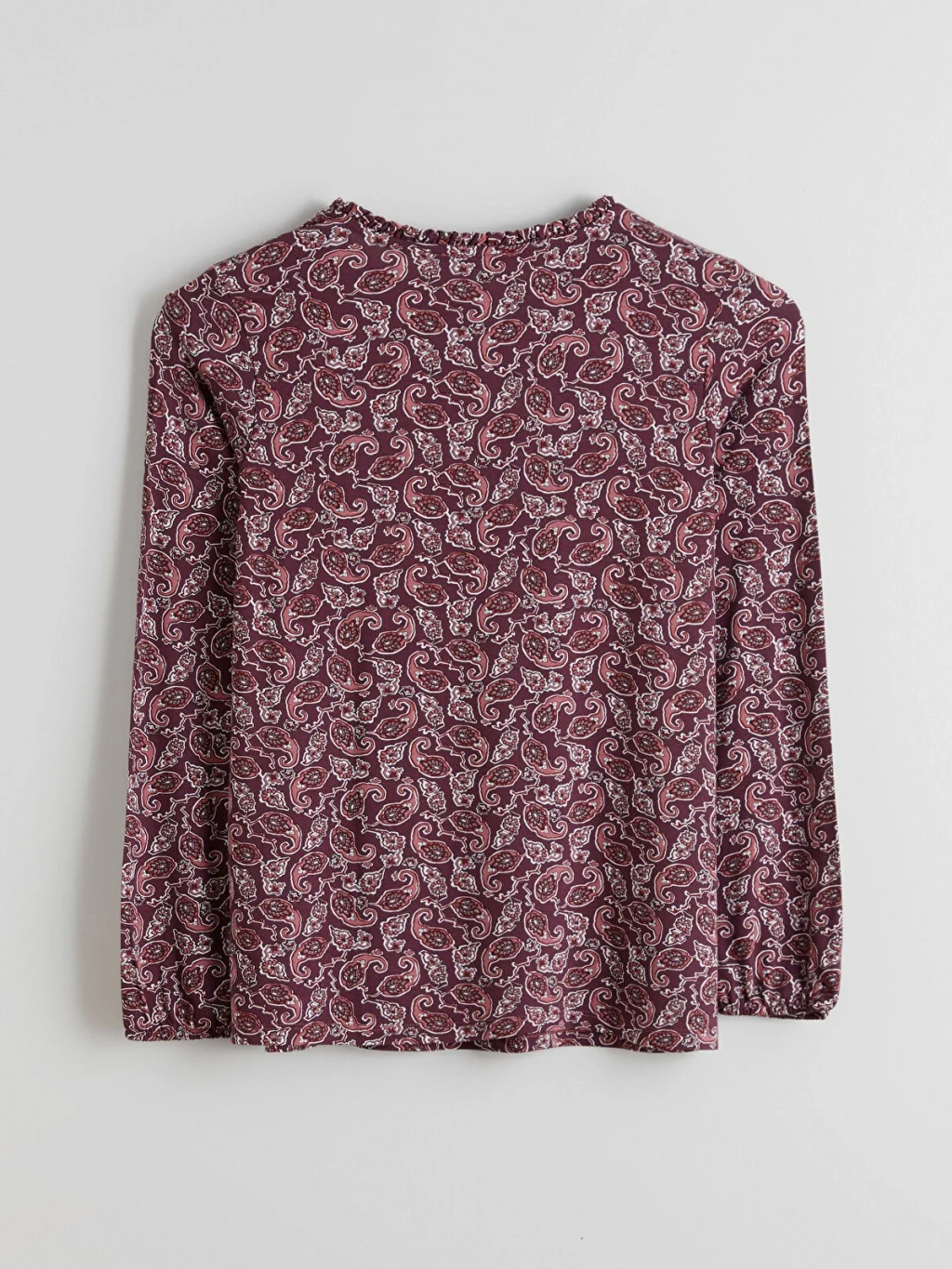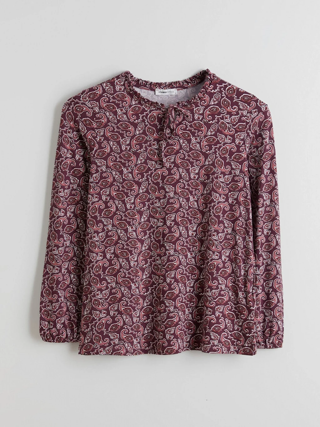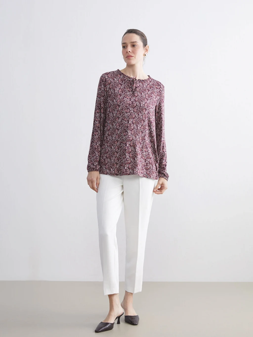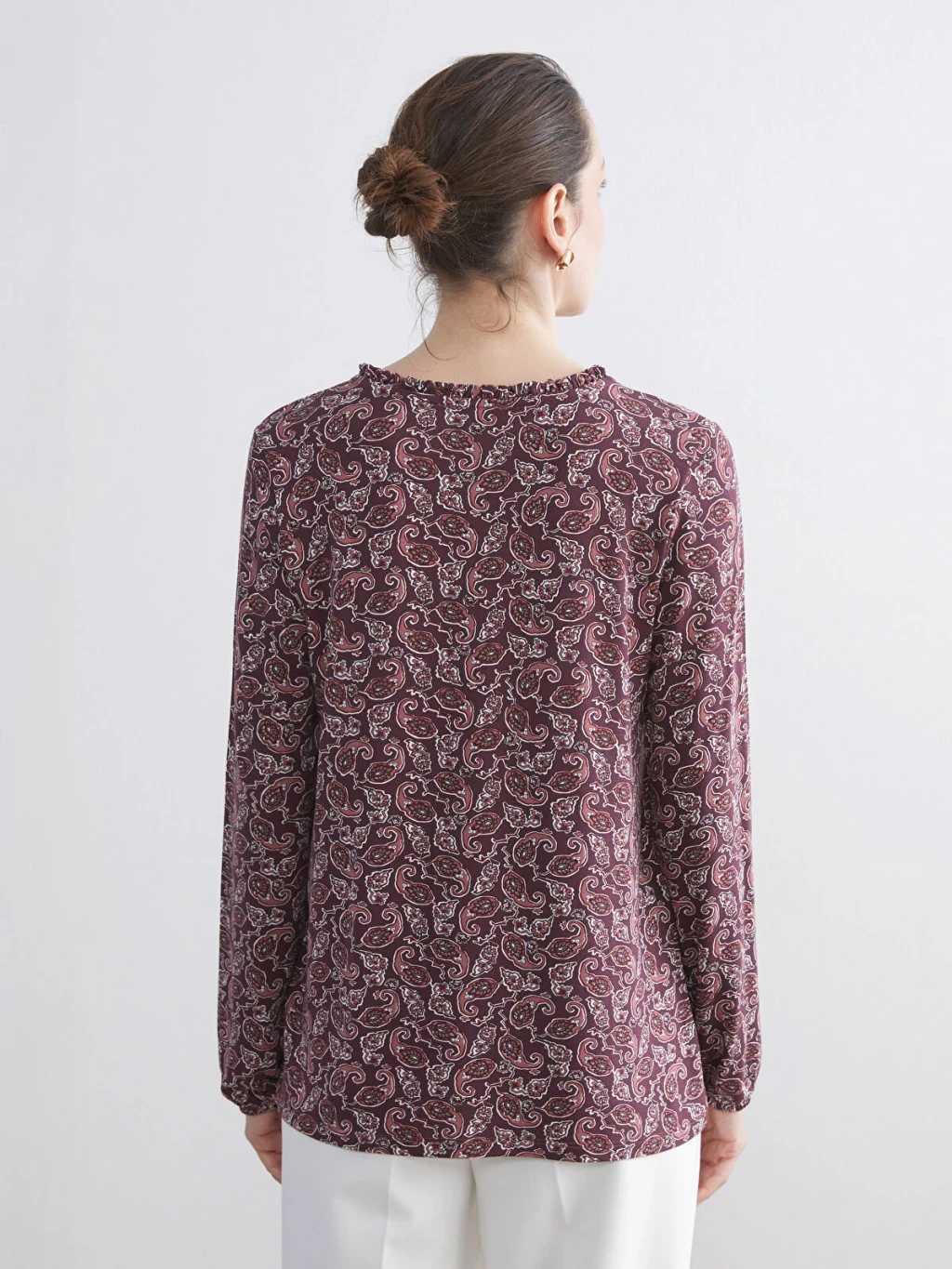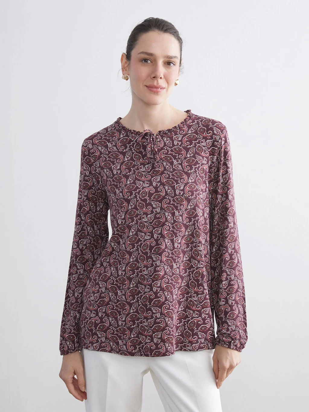 Desenli, fırfırlı bağlamalı yaka, uzun kollu kadın bluz, penye kumaştan üretilmiştir.