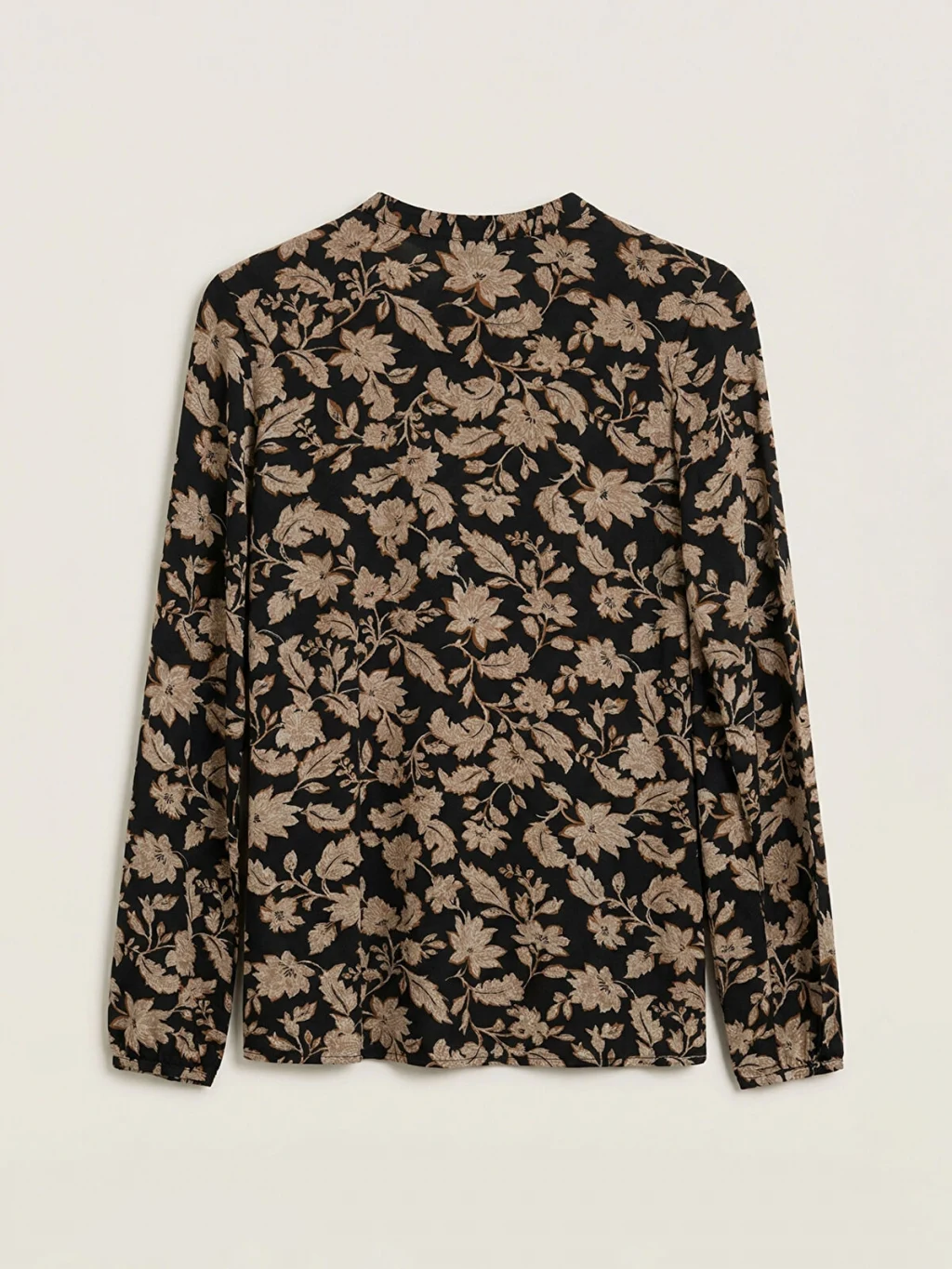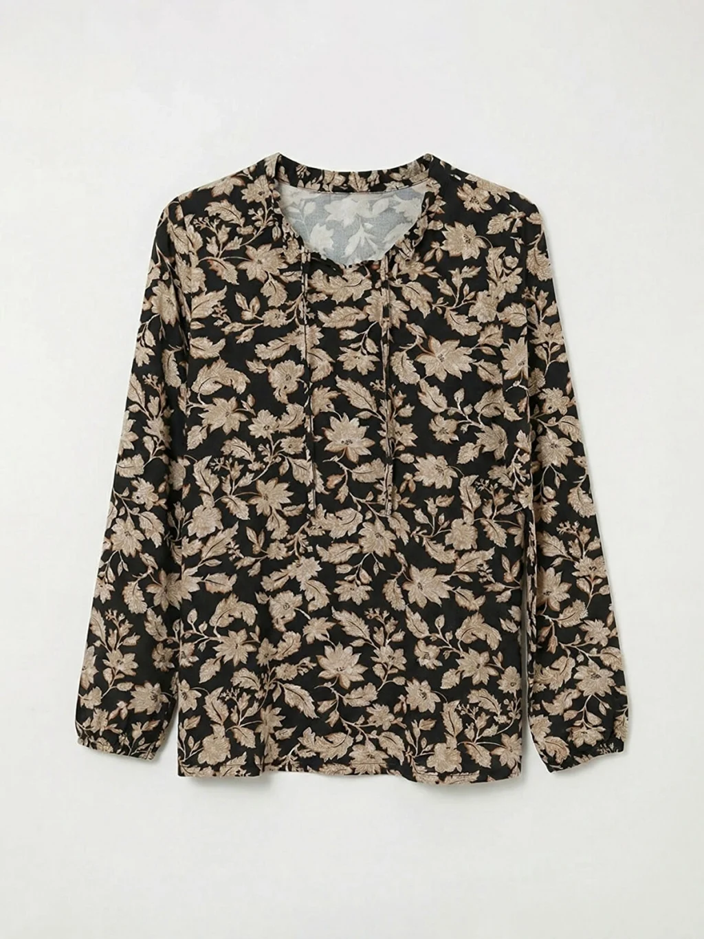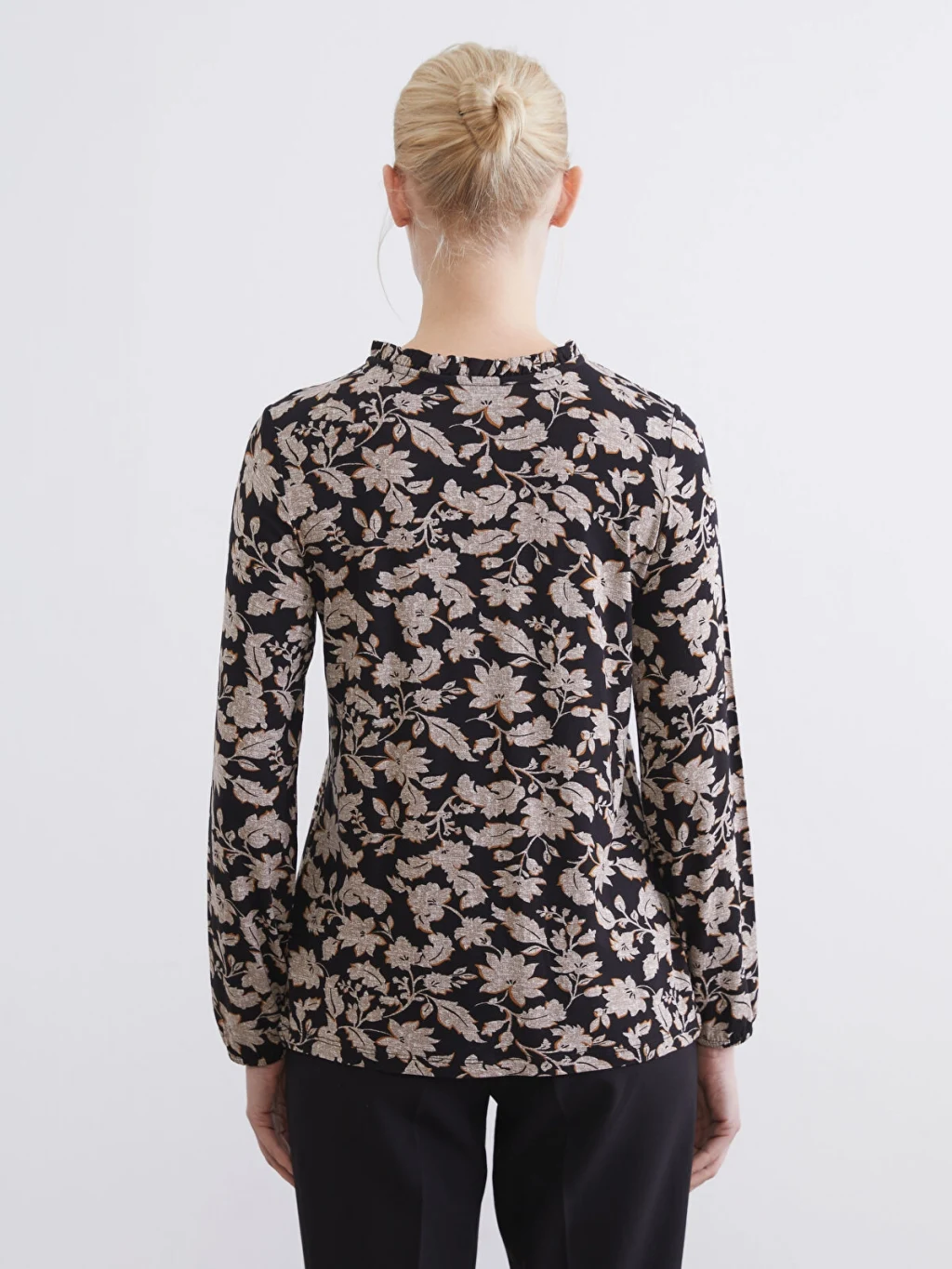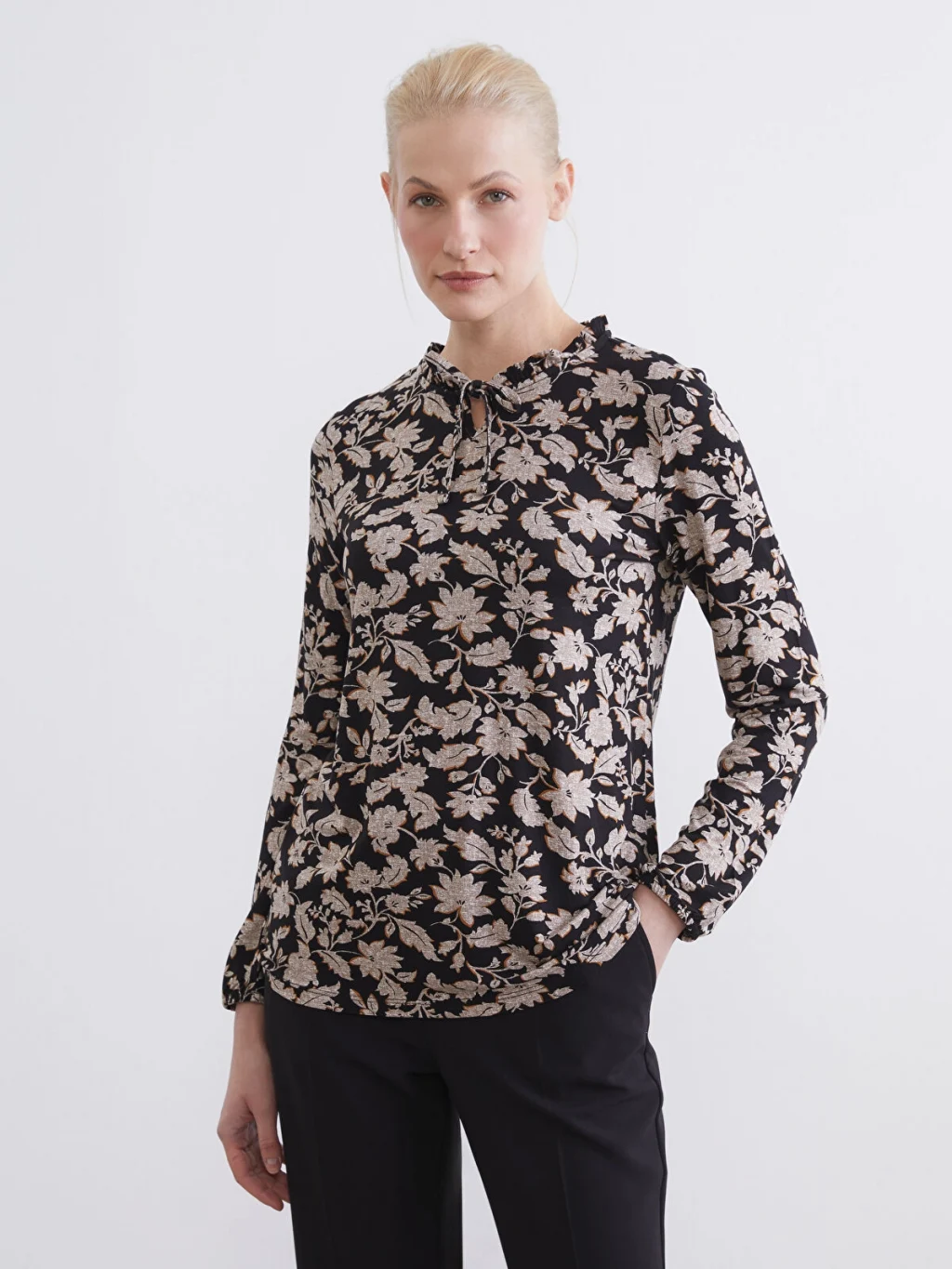 Bağlamalı yakalı ve uzun kollu kadın bluz, çiçekli penye kumaştan üretilmiştir ve manşetleri lastiklidir.