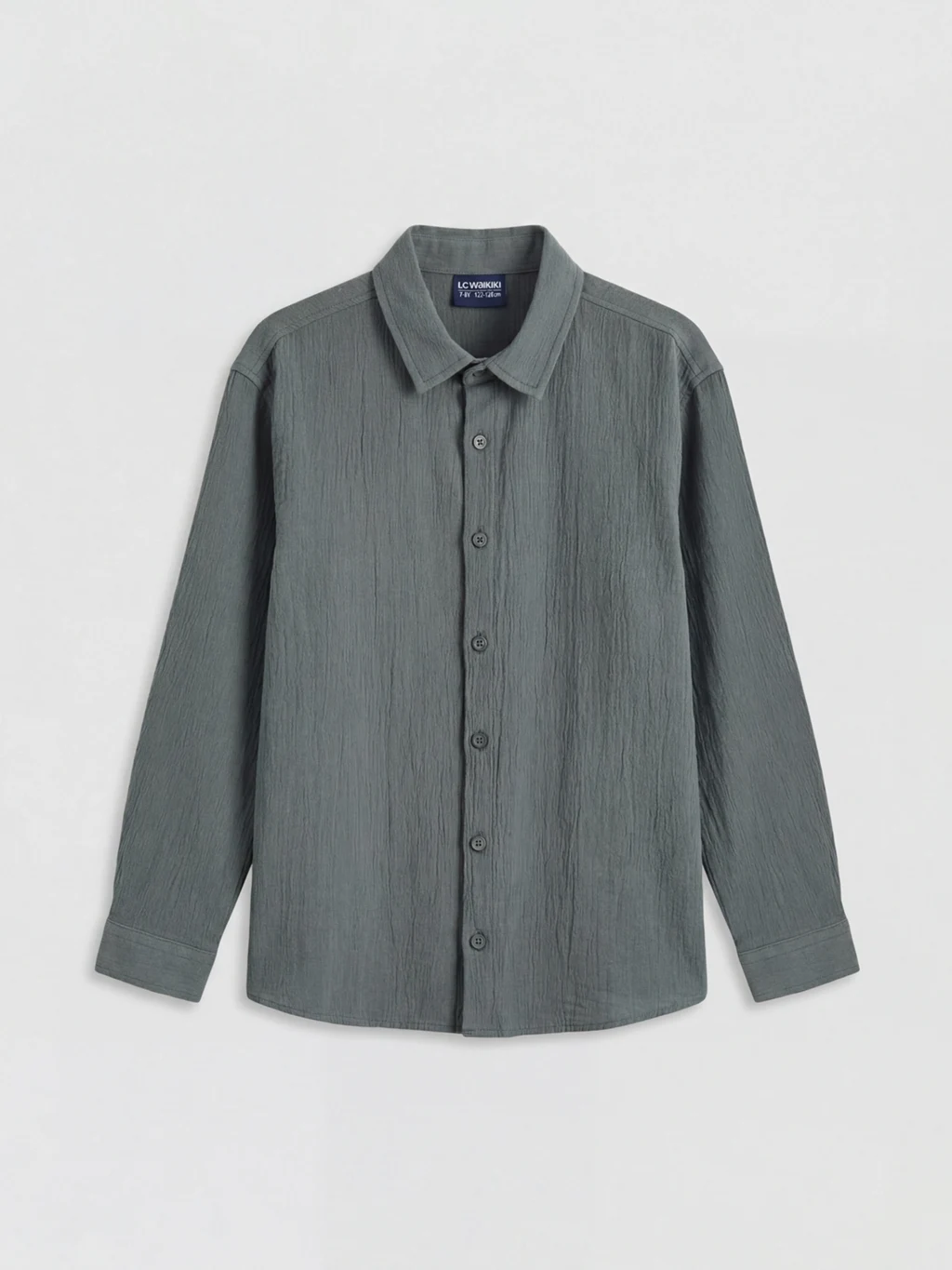 Erkek çocuk gömlek, %100 pamuk poplin kumaştan üretilmiştir. Uzun kollu ve önden düğme kapamalıdır.
