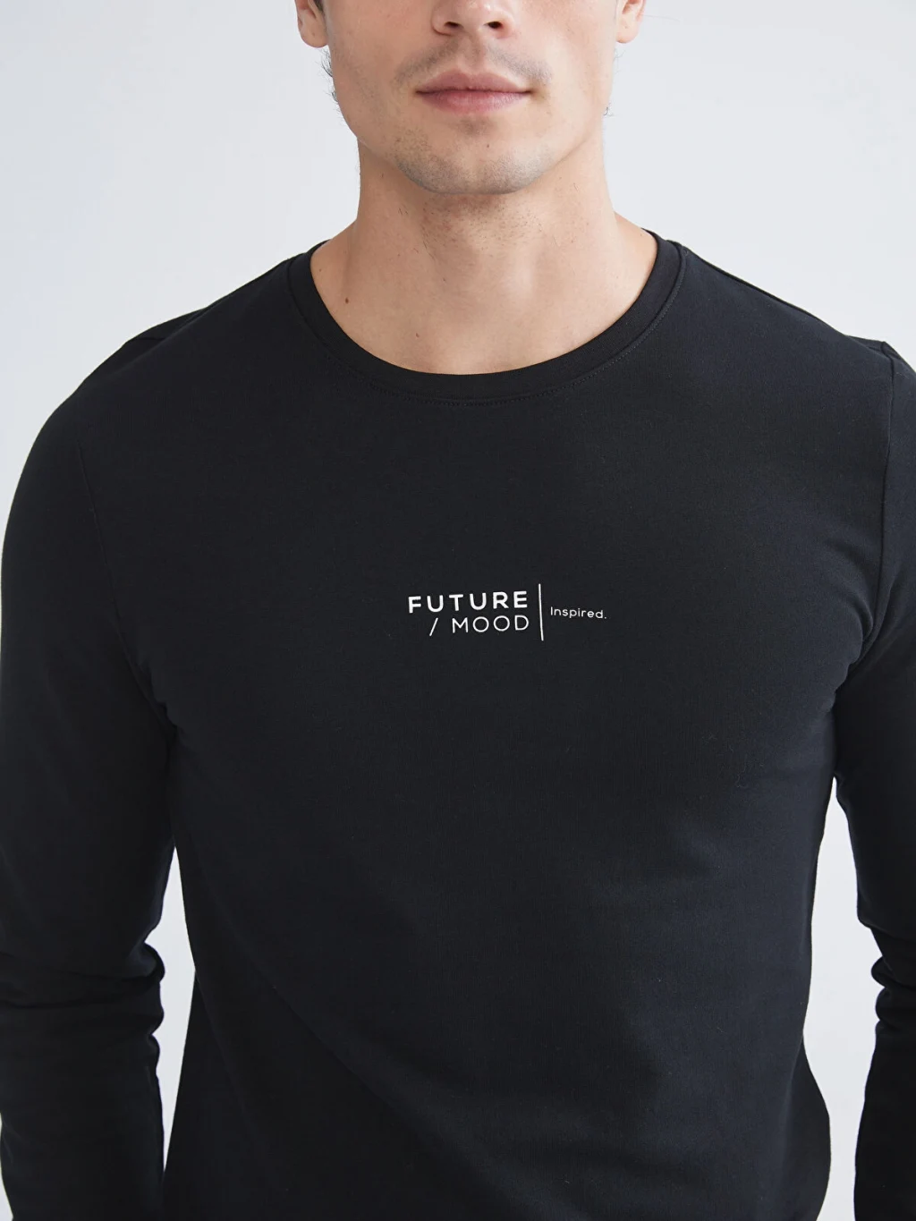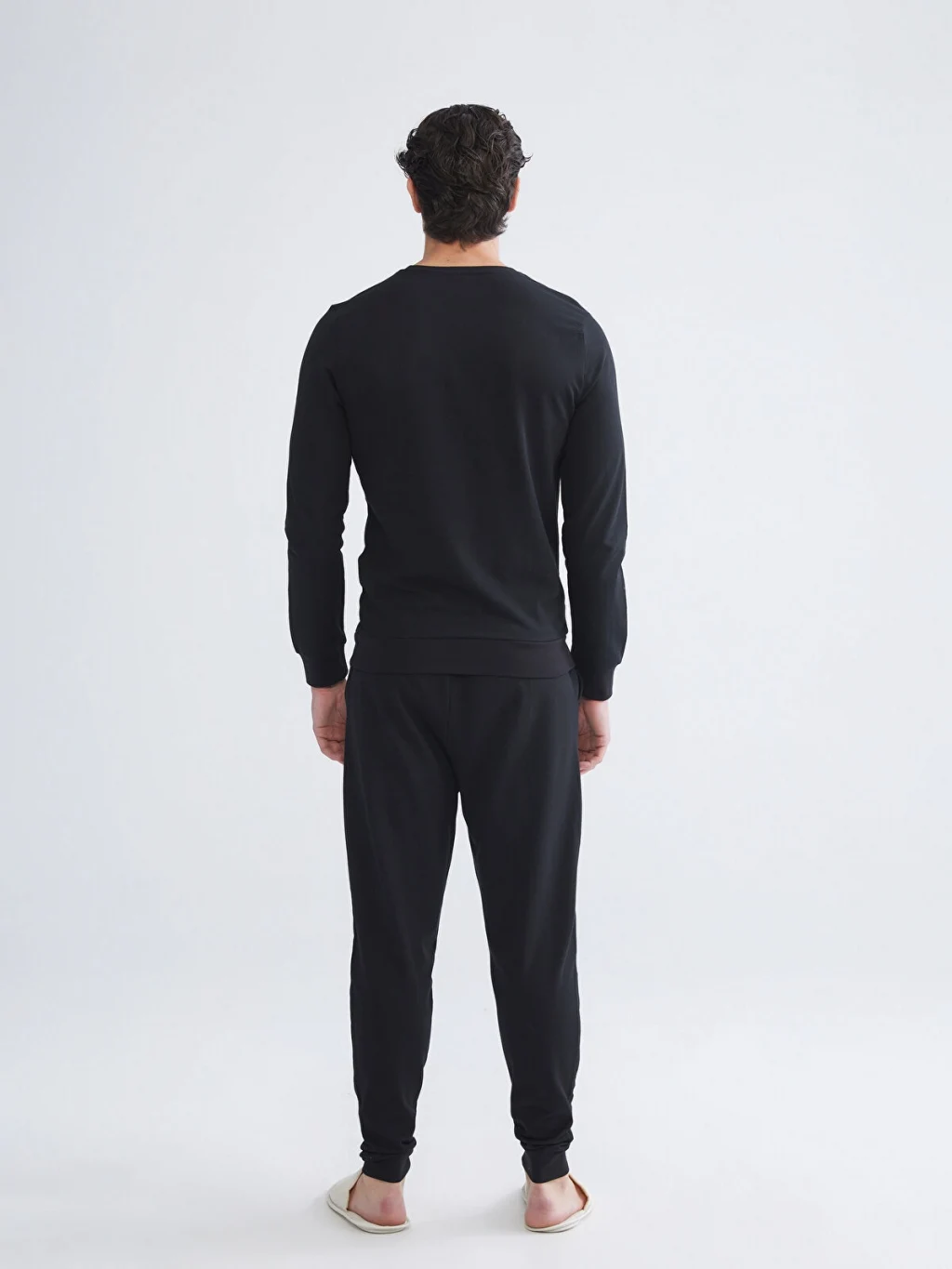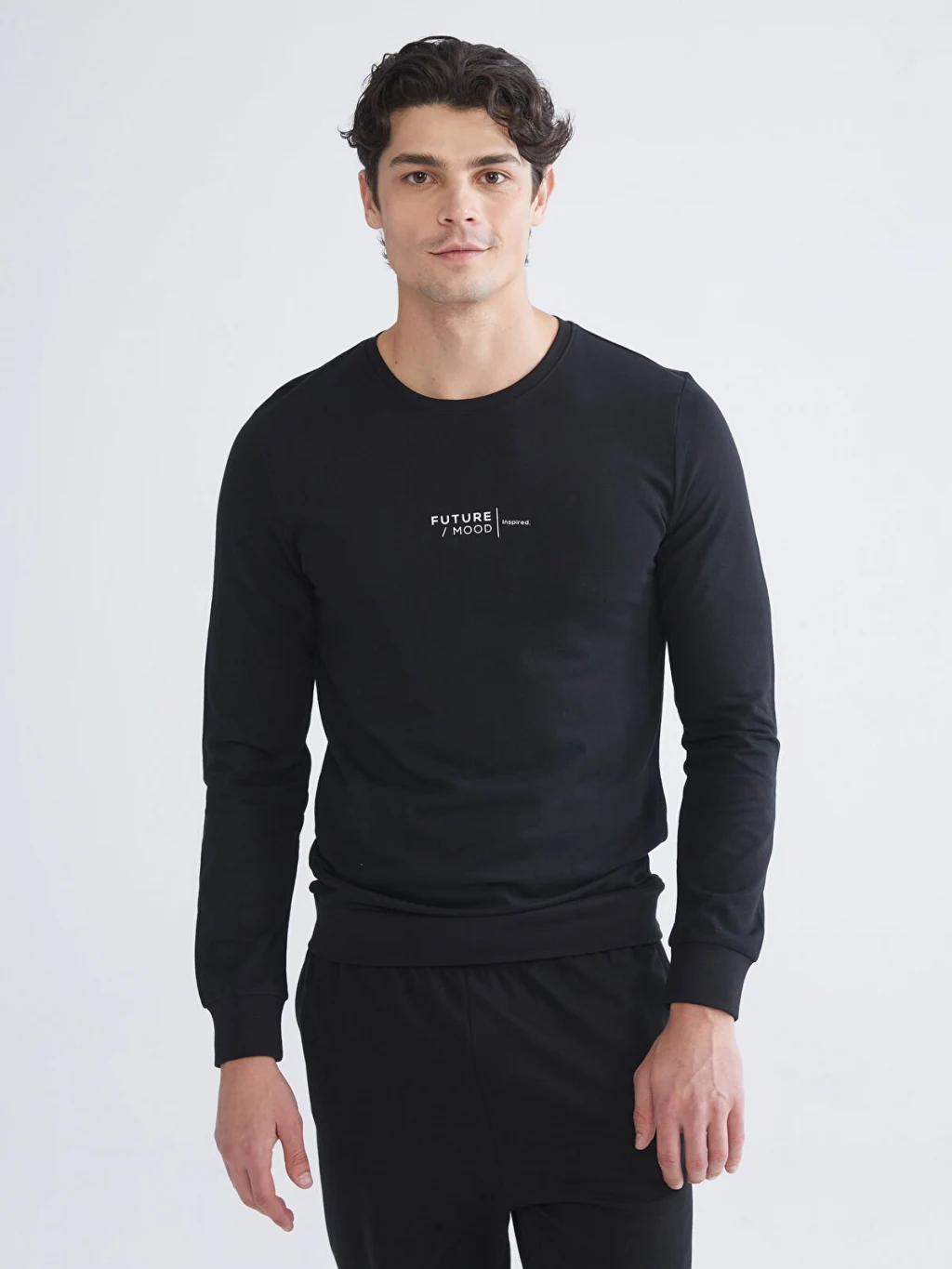 2 iplik kumaştan üretilen erkek pijama takımı, bisiklet yaka, uzun kollu, göğsü yazı baskılı üst ve paçası ribanalı uzun alttan oluşur.