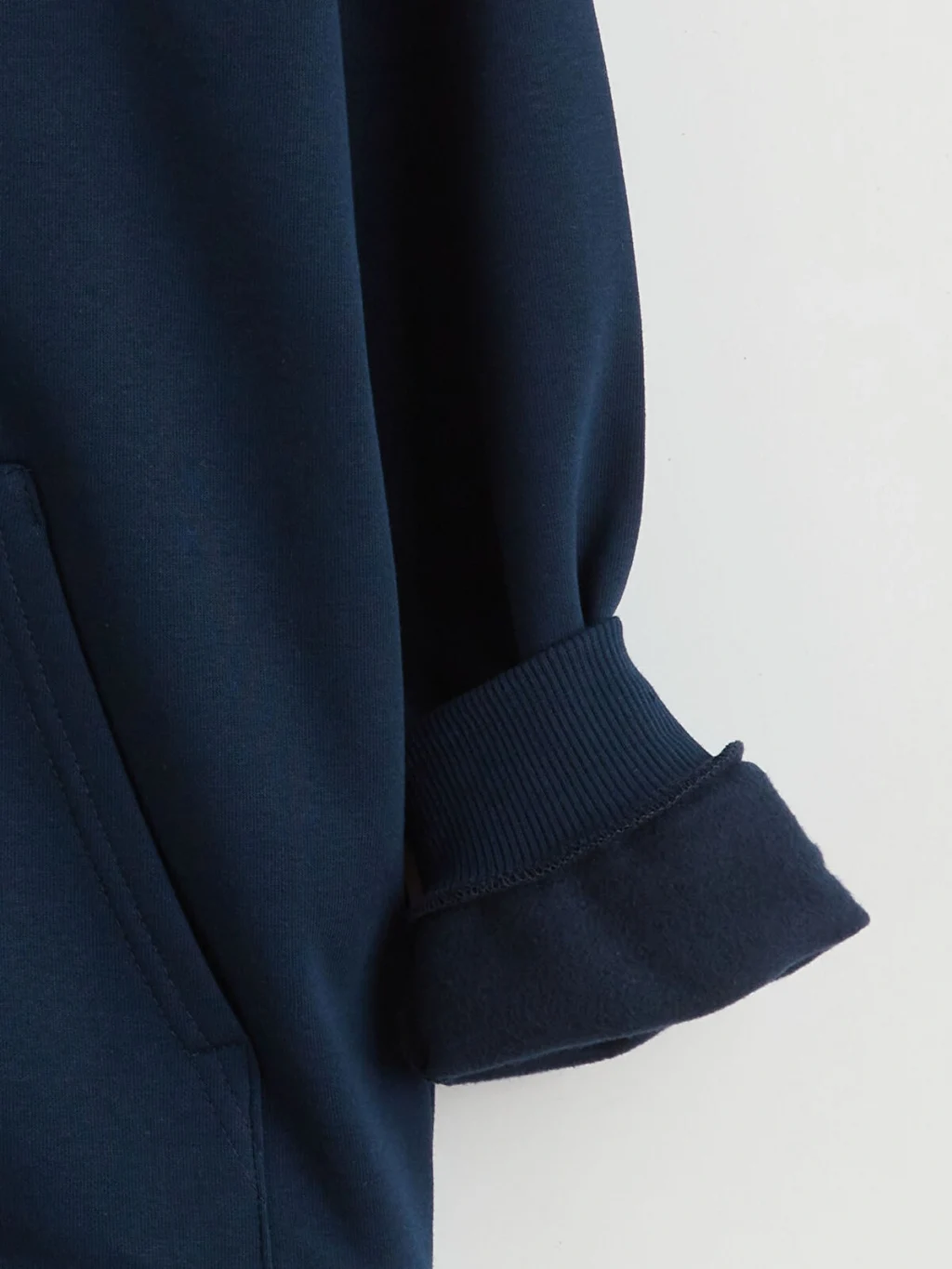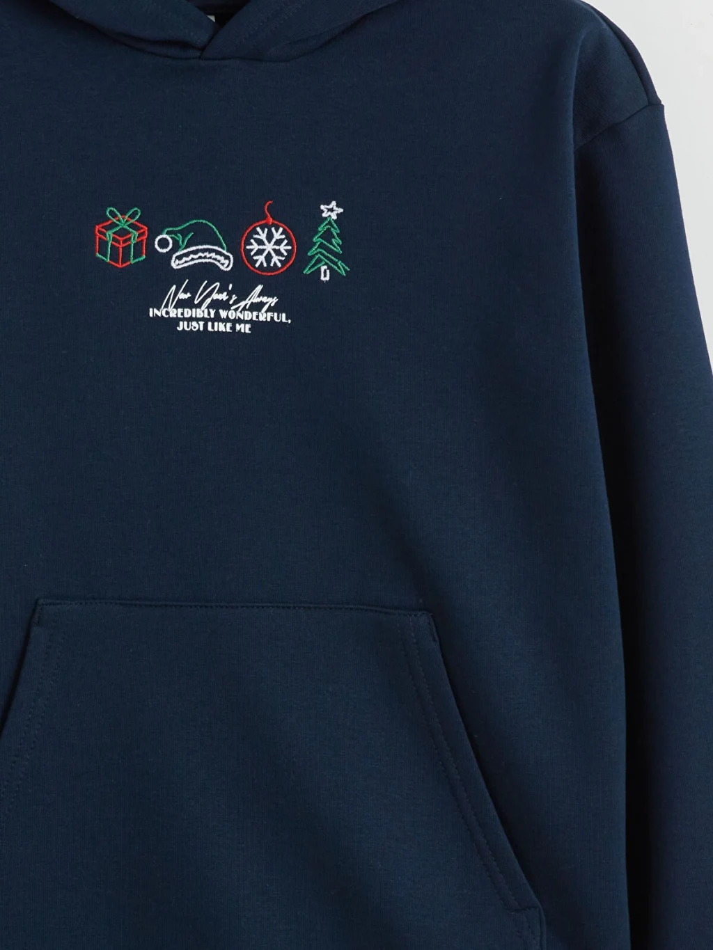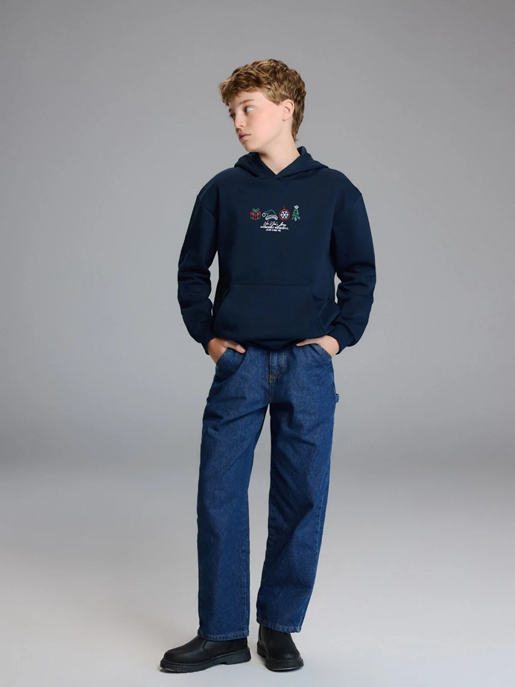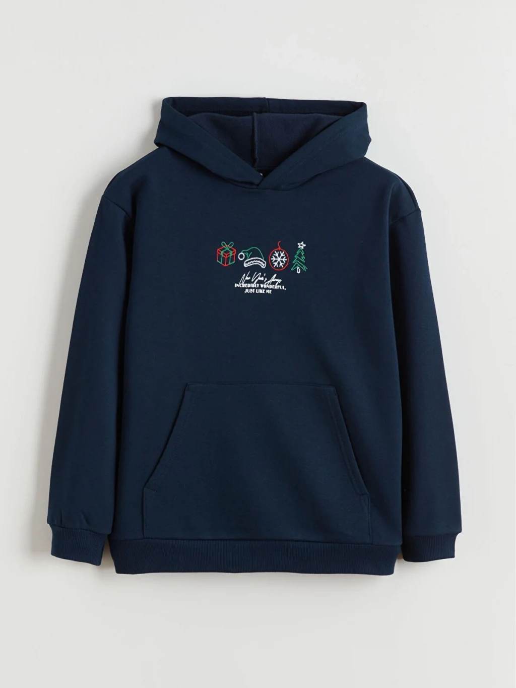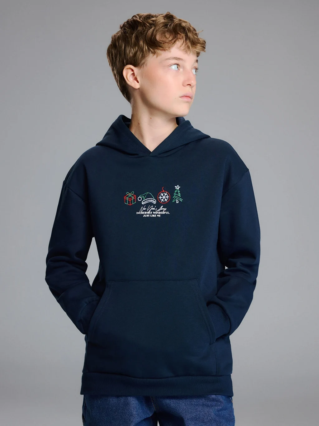 Kapüşonlu, uzun kollu erkek çocuk sweatshirt, kalın 3 iplik kumaştan üretilmiştir. Önü kanguru cepli olup, göğsünde işlemeli desenler bulunur.