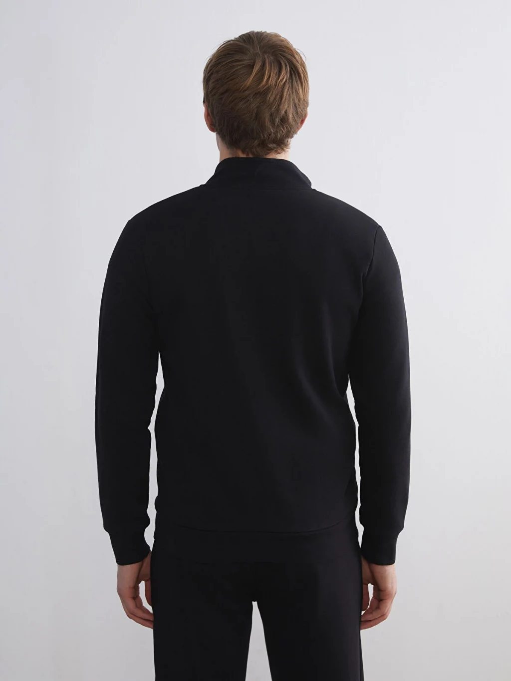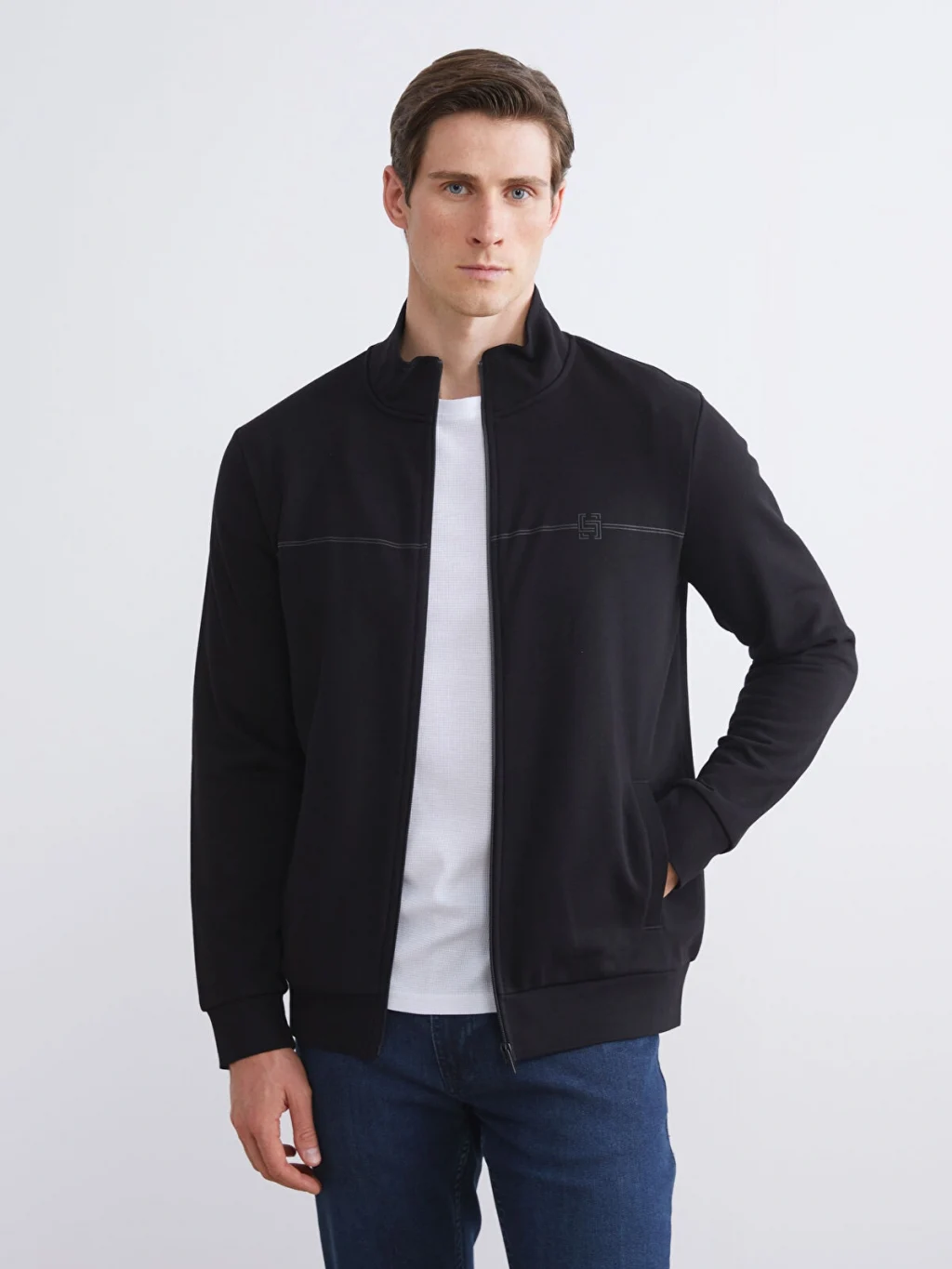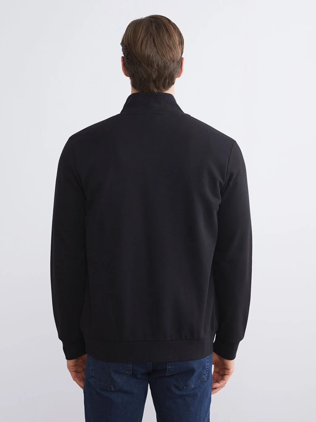 Dik yaka, uzun kollu erkek sweatshirt, 3 iplik şardonlu kalın kumaştan üretilmiştir. Önden fermuar kapamalıdır ve yan ceplere sahiptir.