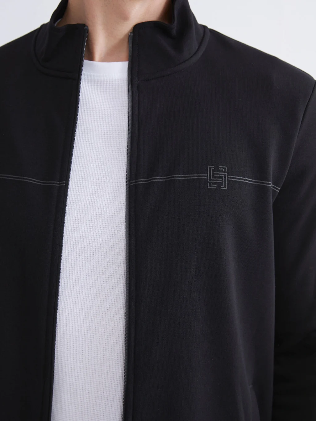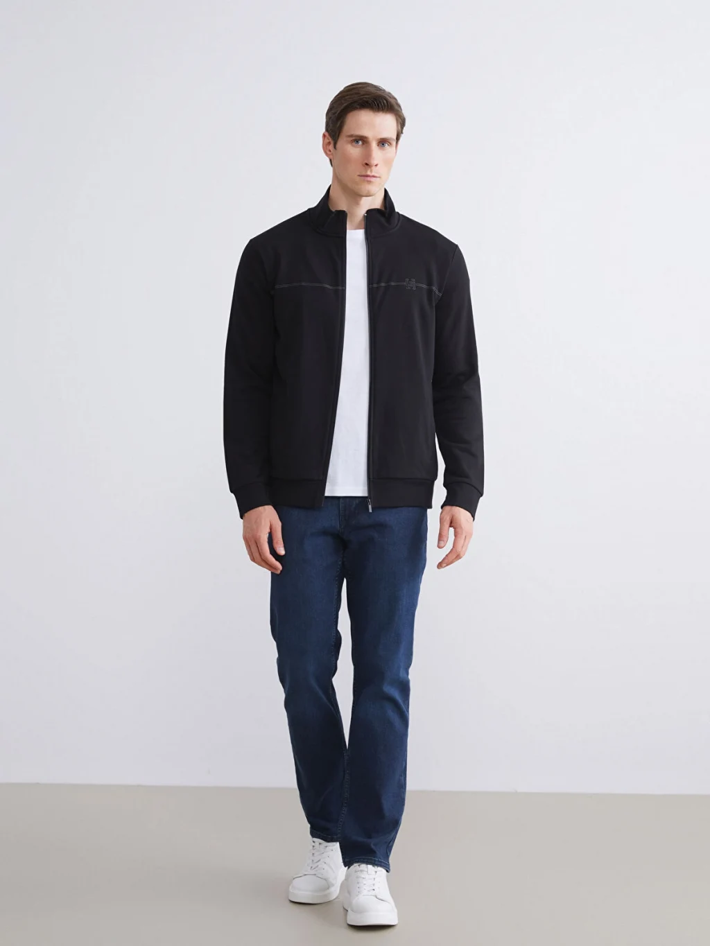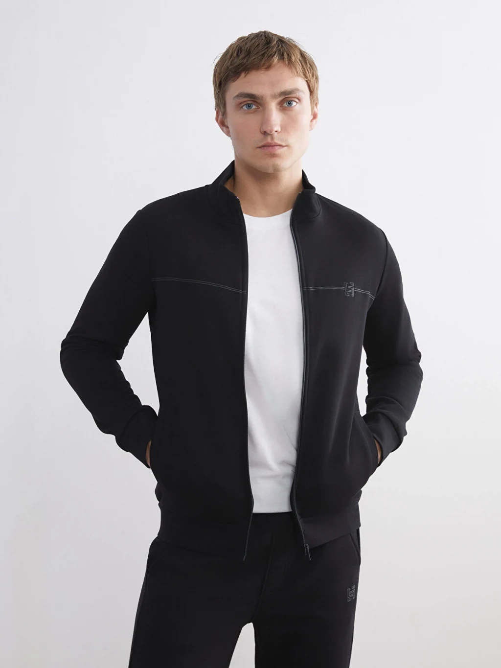 Dik yaka, uzun kollu erkek sweatshirt, 3 iplik şardonlu kalın kumaştan üretilmiştir. Önden fermuar kapamalıdır ve yan ceplere sahiptir.