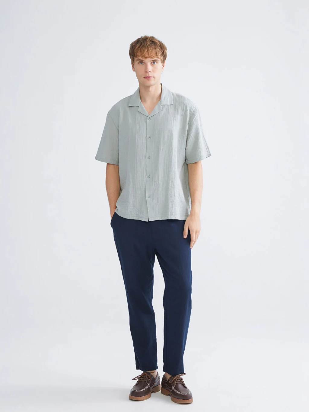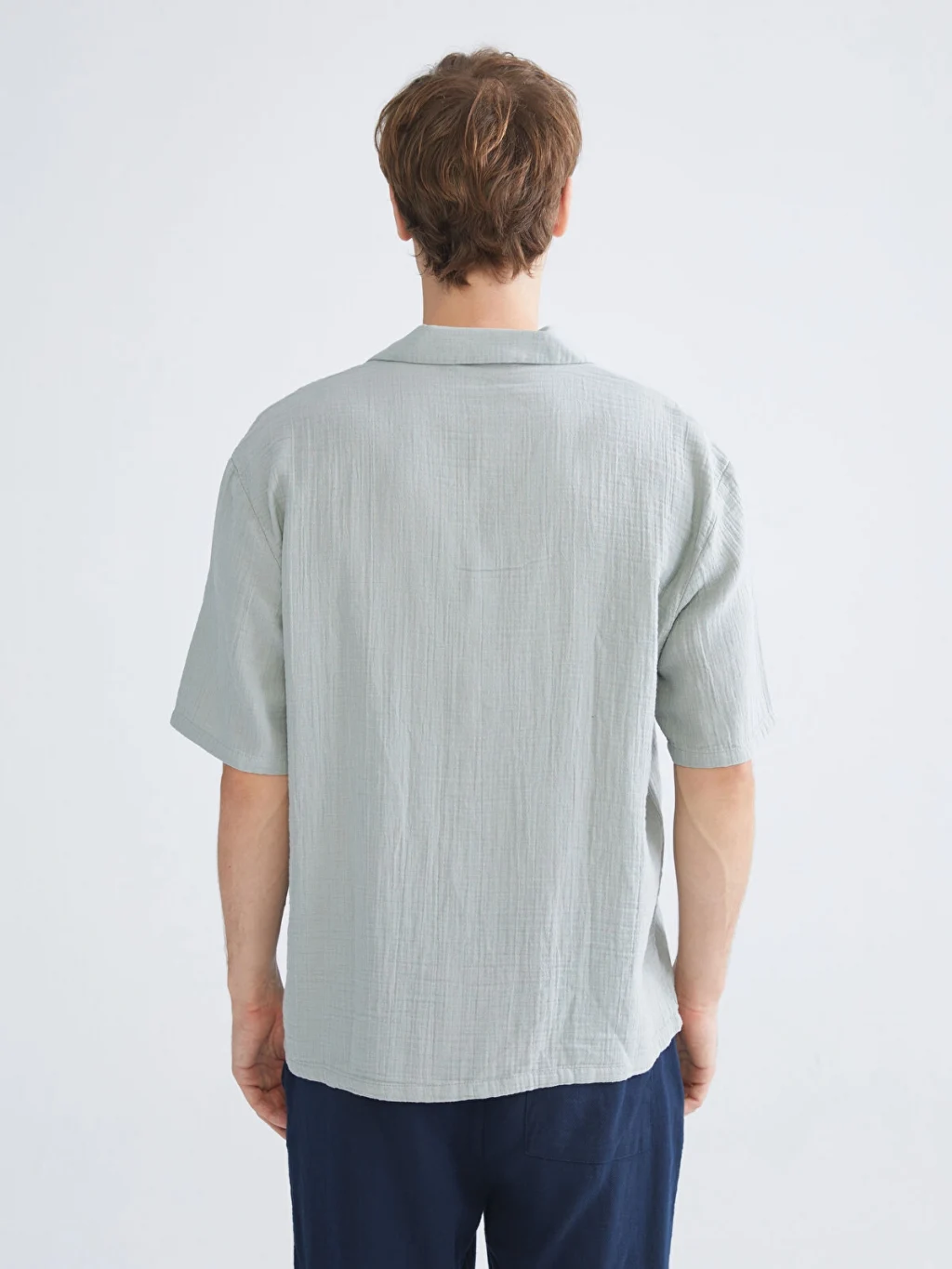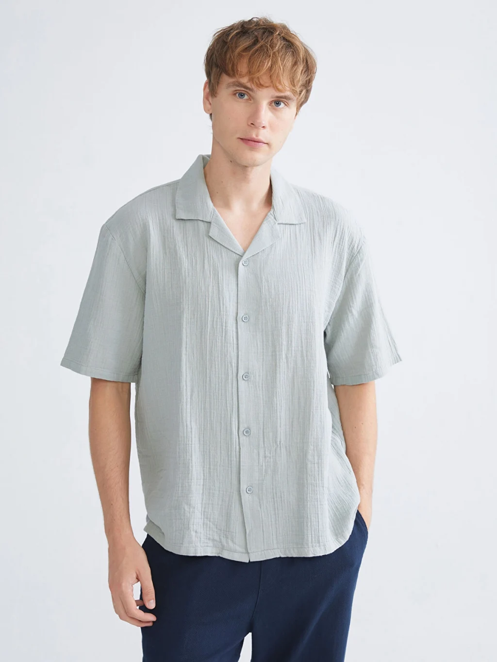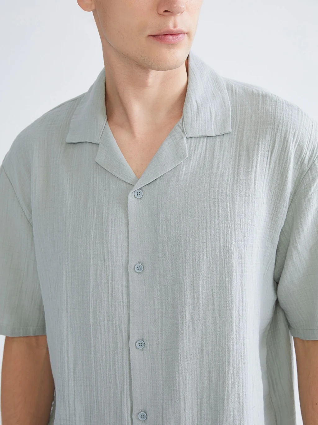 Rahat kalıp kesime sahip erkek gömlek, resort yaka ve kısa kollu olarak tasarlanmış olup müslin kumaştan üretilmiştir.