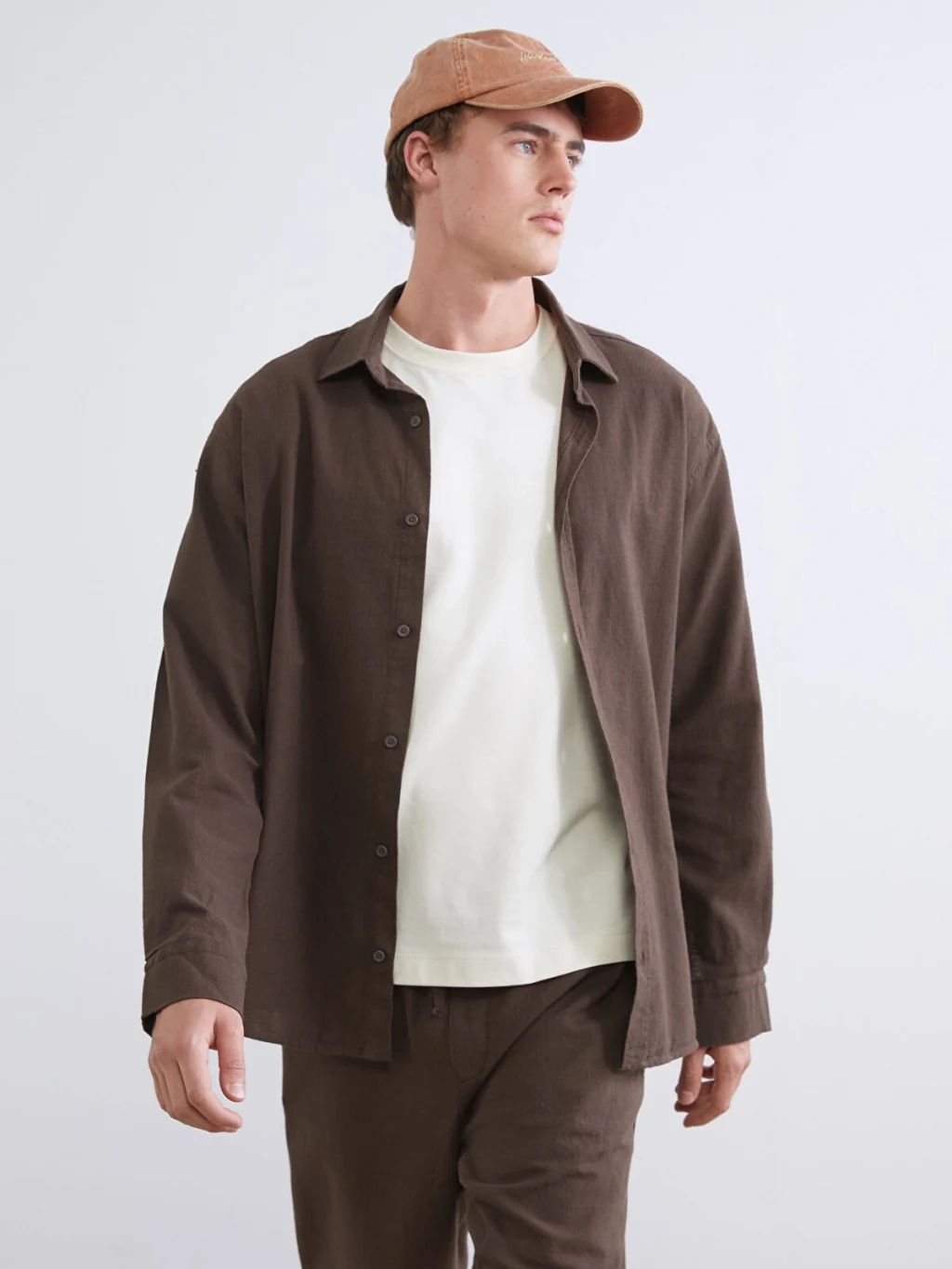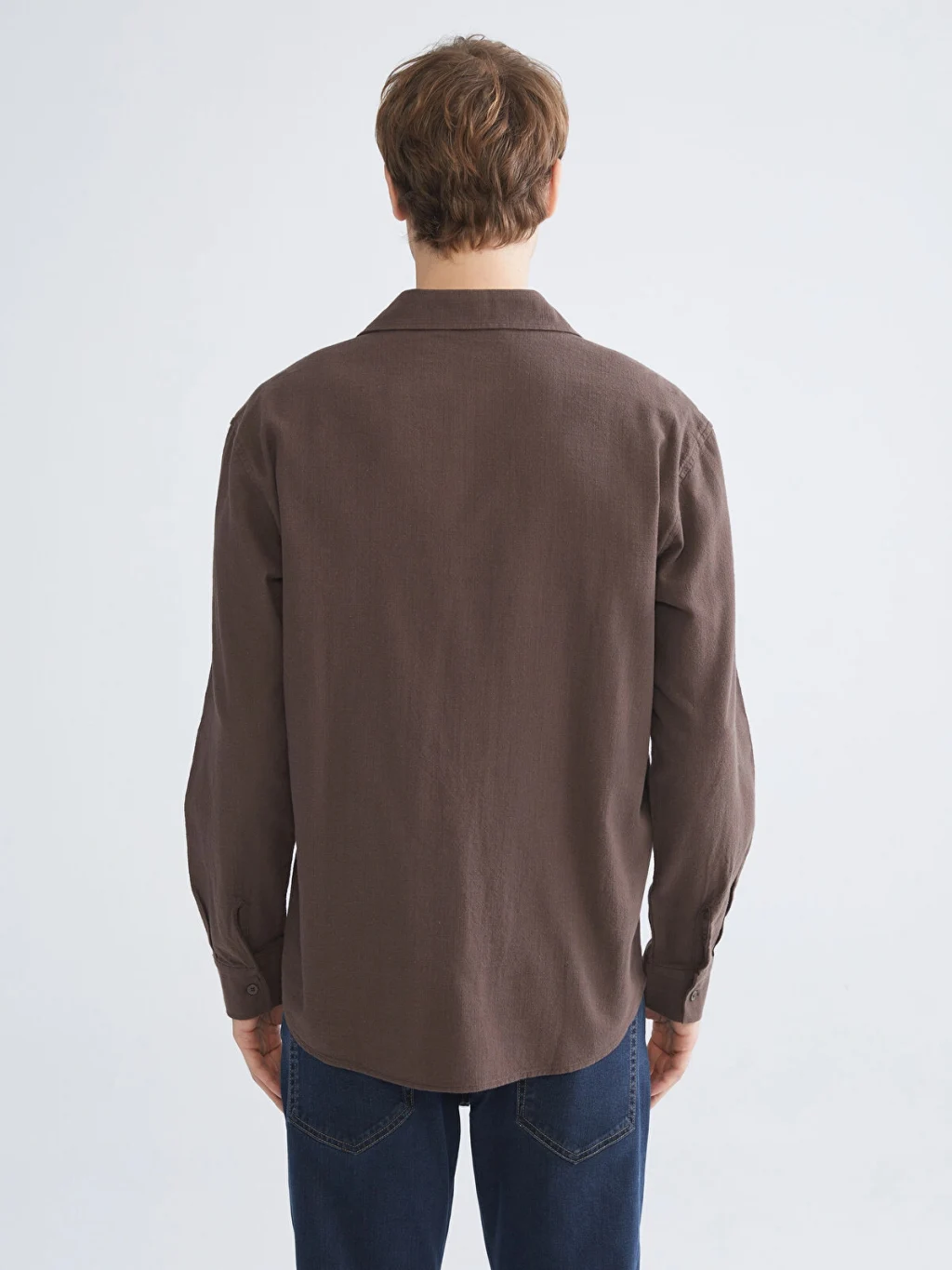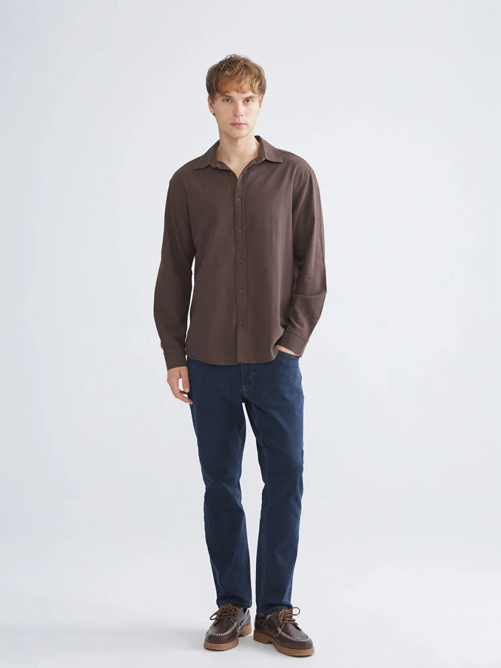 Regular fit kesime sahip erkek gömlek, uzun kollu olarak tasarlanmış olup keten görünümlü kumaştan üretilmiştir.