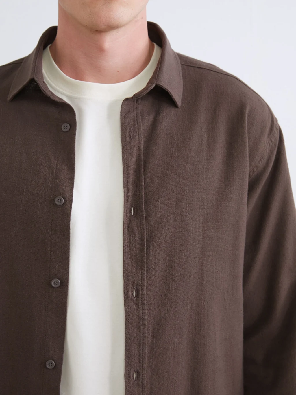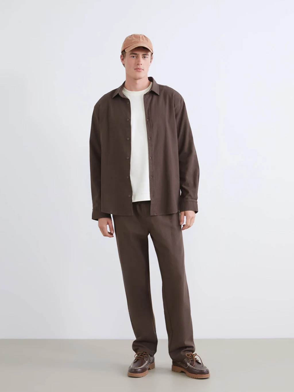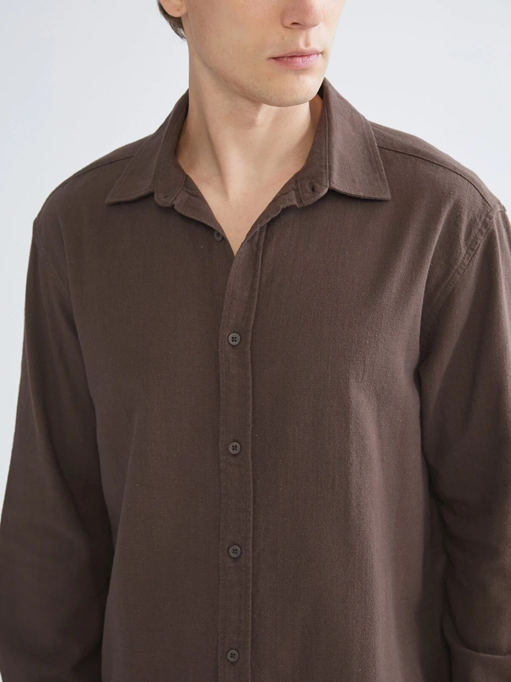 Regular fit kesime sahip erkek gömlek, uzun kollu olarak tasarlanmış olup keten görünümlü kumaştan üretilmiştir.