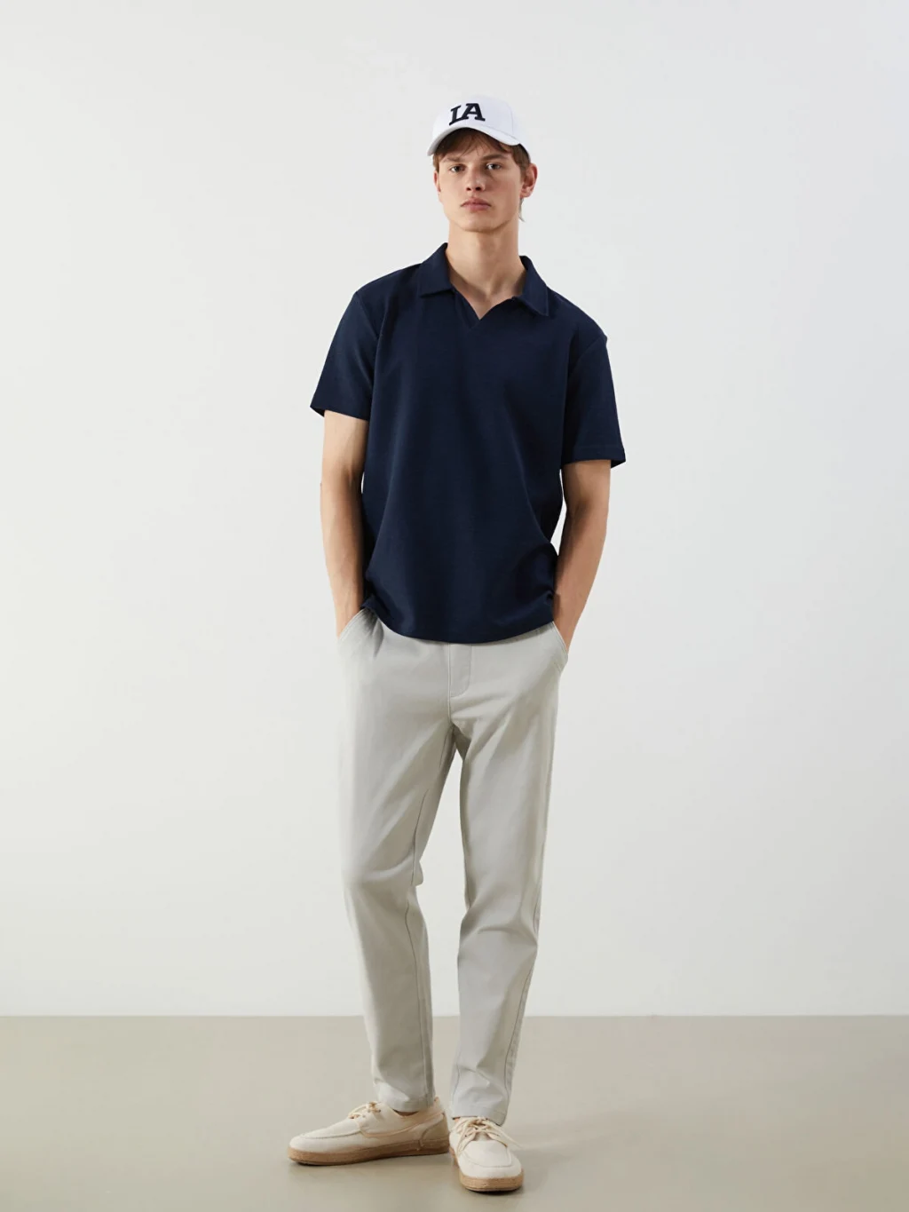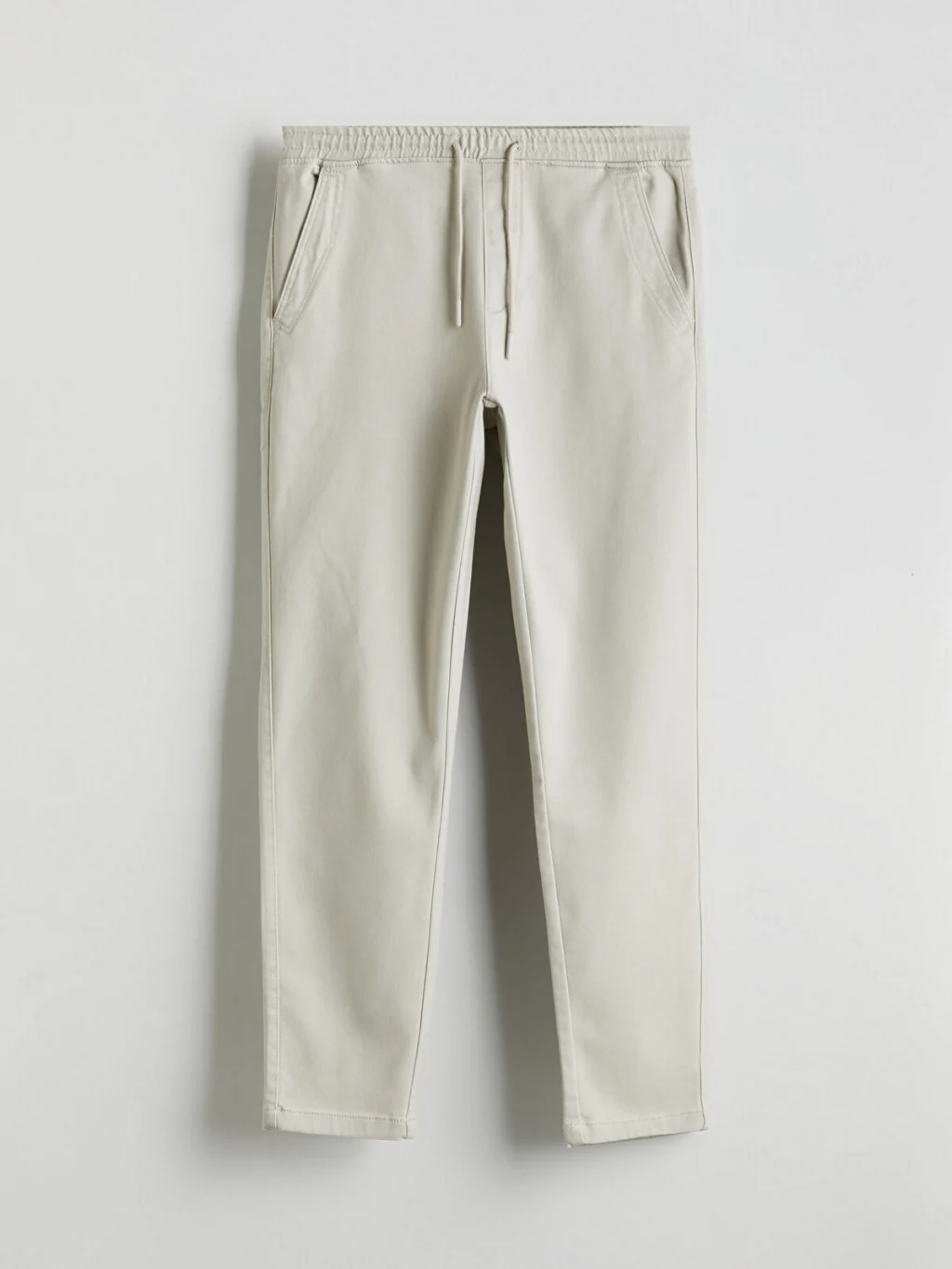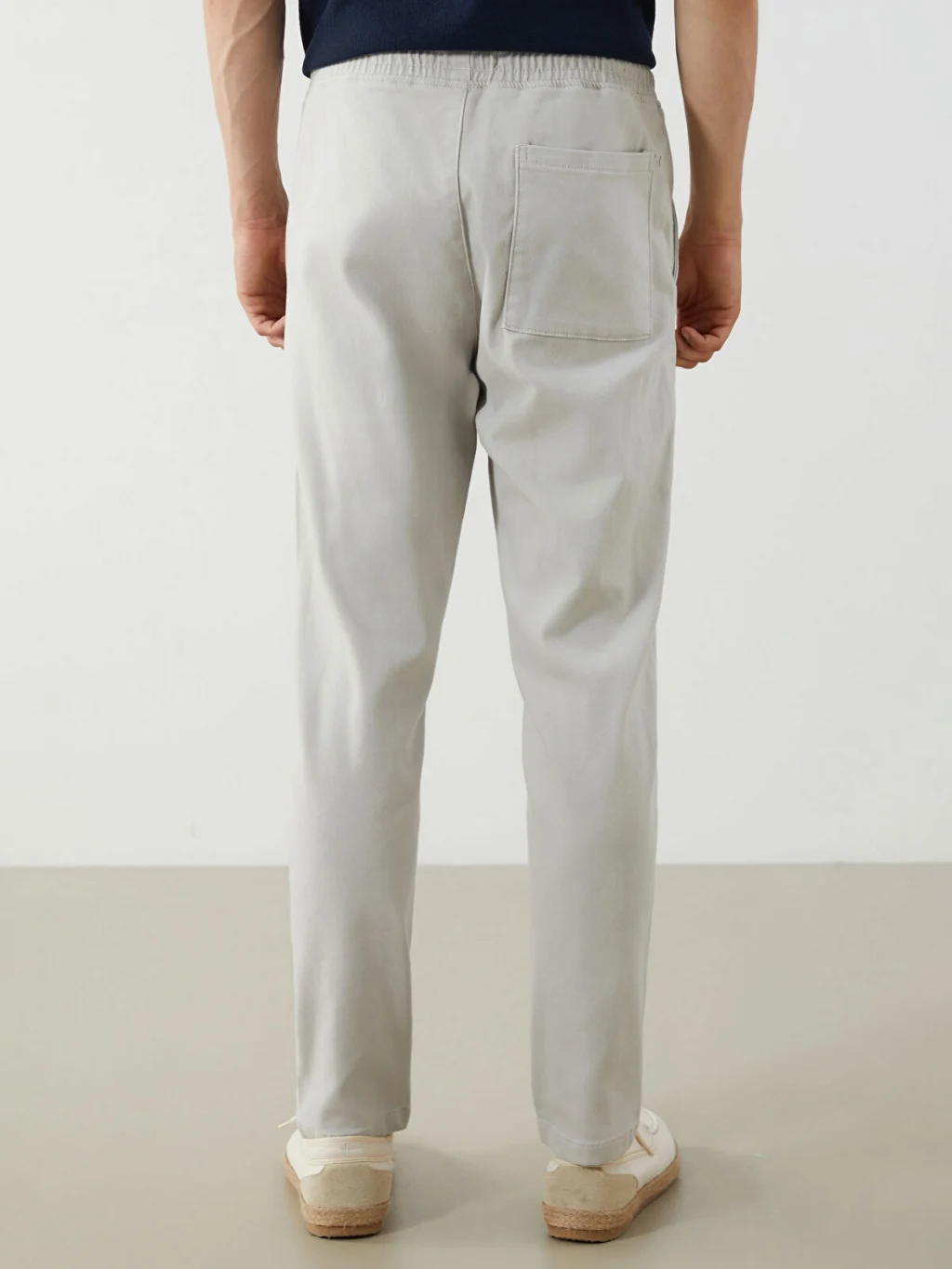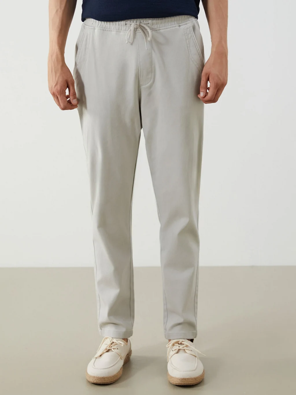 Dar kalıp erkek pantolon, beli lastikli ve ayarlanabilir bağcıklıdır. Yan cepleri ve düz paçaları bulunur.