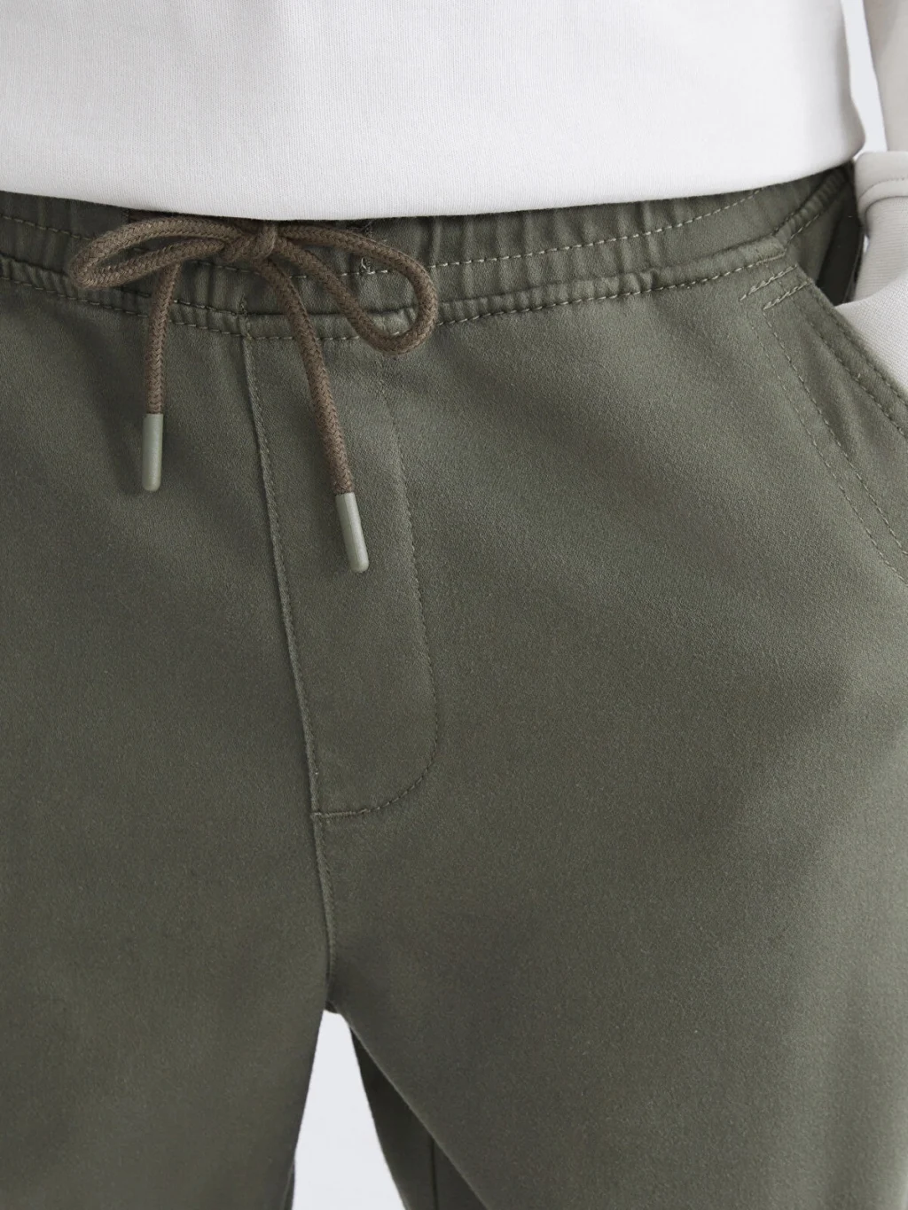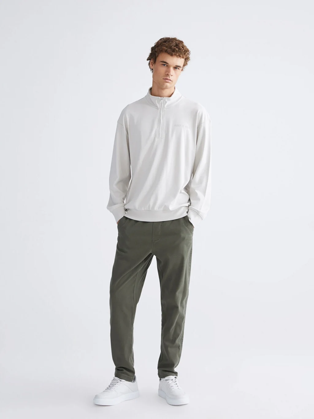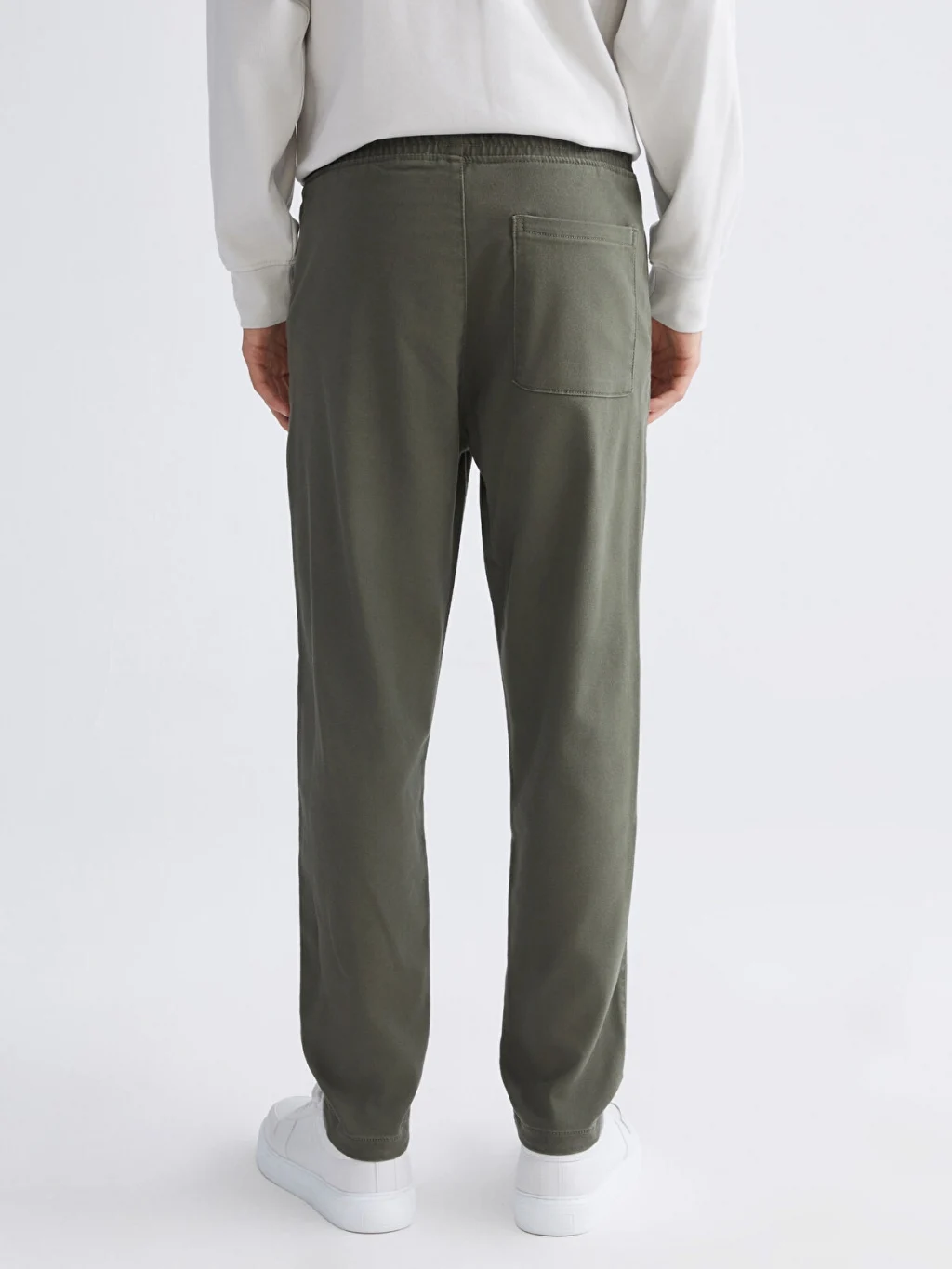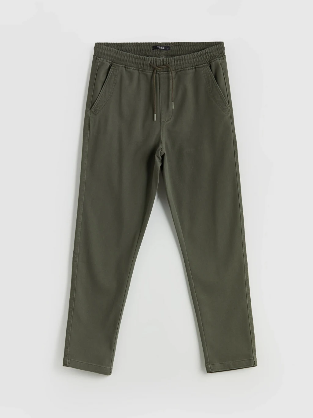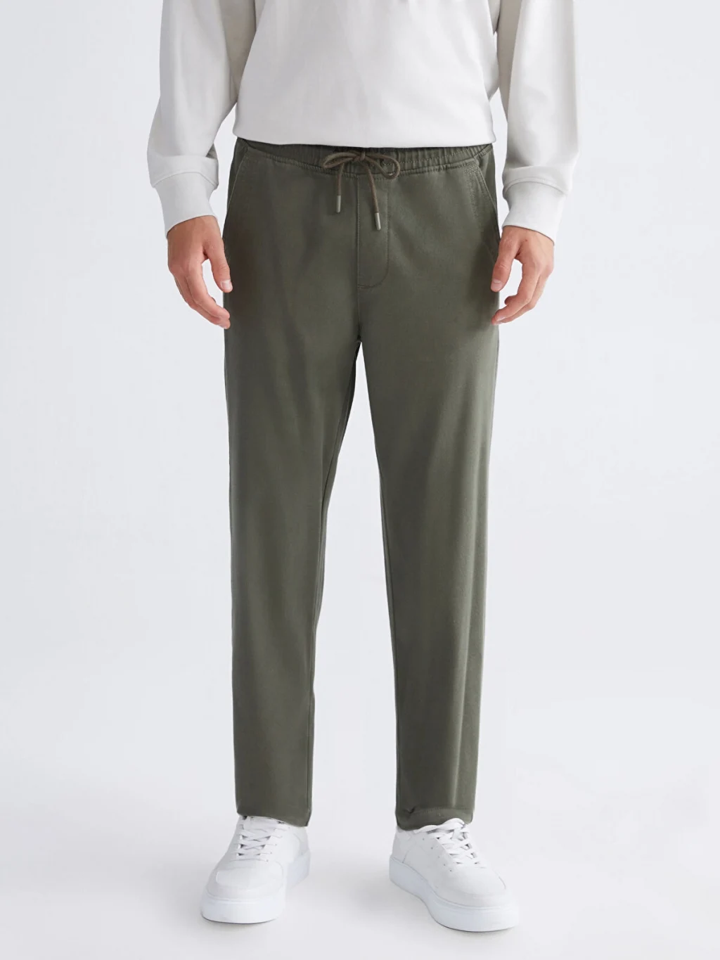 Dar kalıp erkek pantolon, beli lastikli ve ayarlanabilir bağcıklıdır. Yan cepleri ve düz paçaları bulunur.