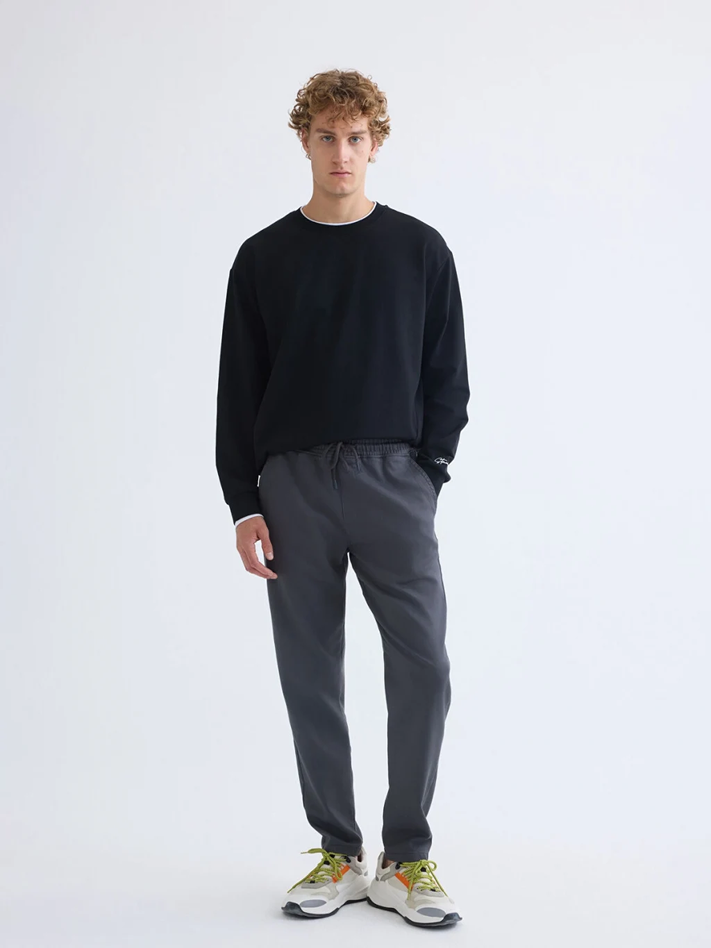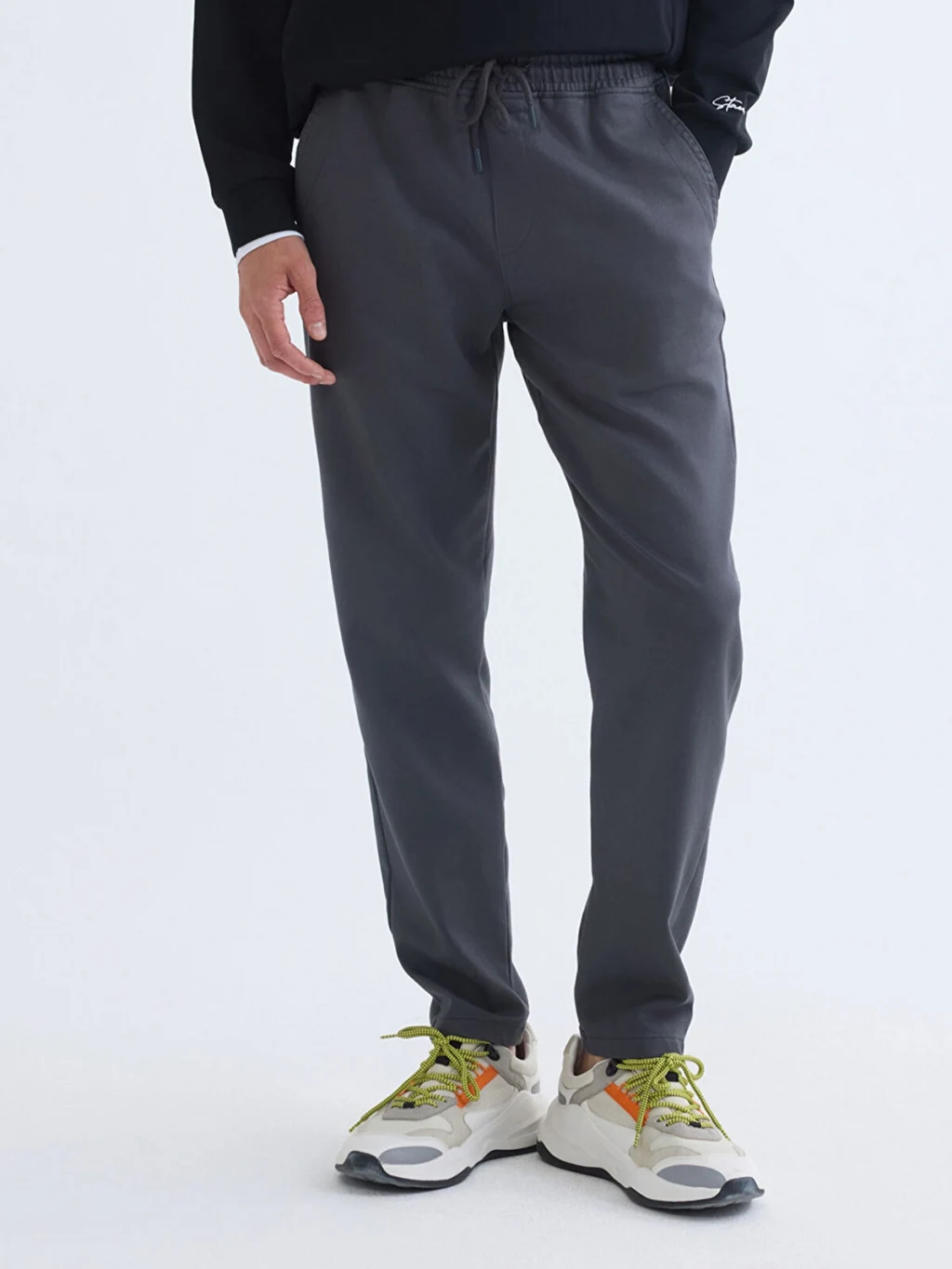 Dar kalıplı erkek pantolon, beli lastikli ve bağcıklıdır. Yan cepleri bulunur.