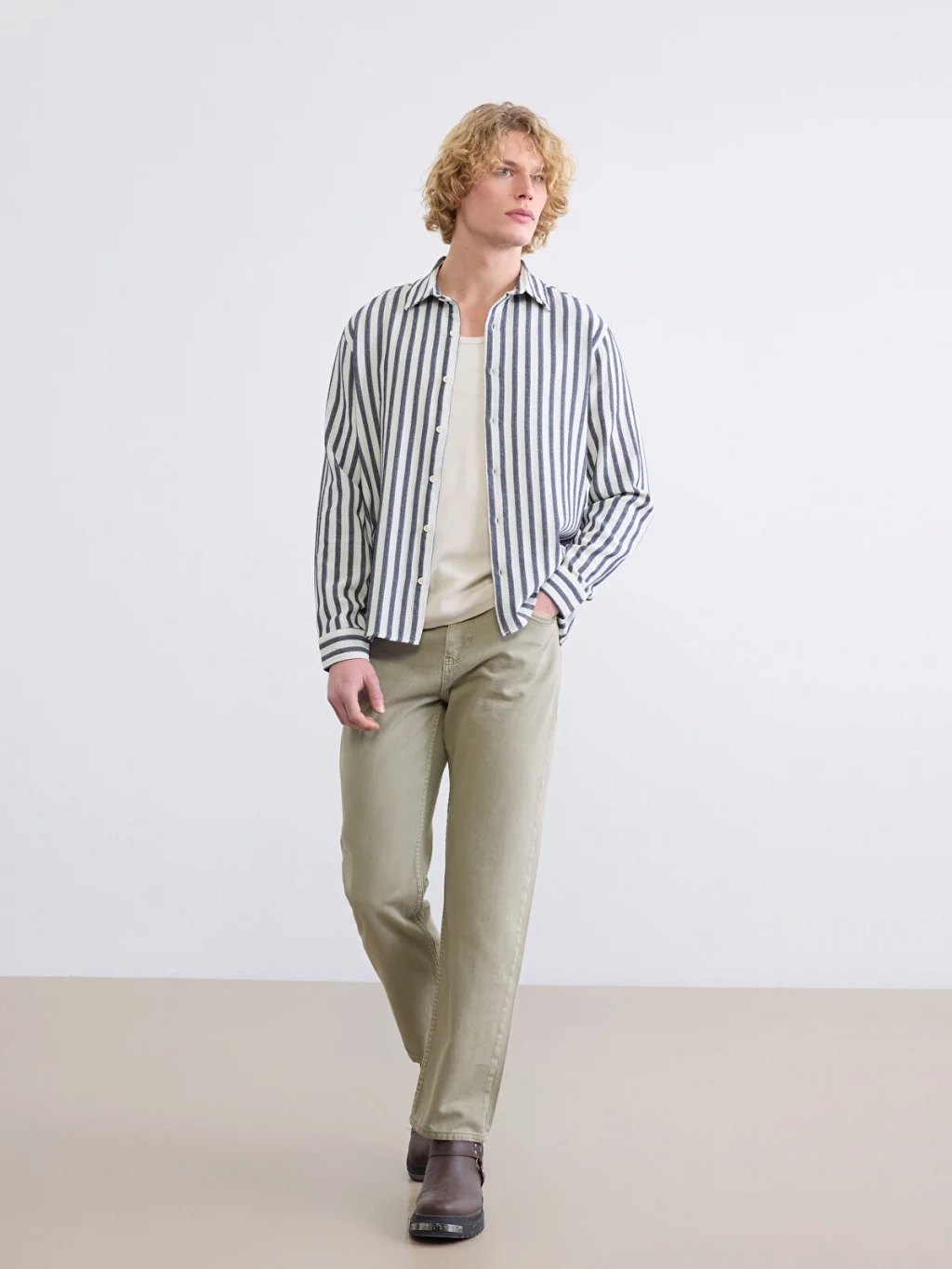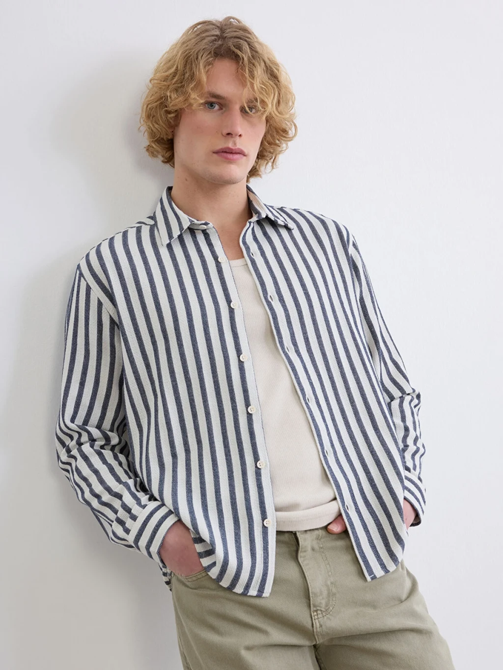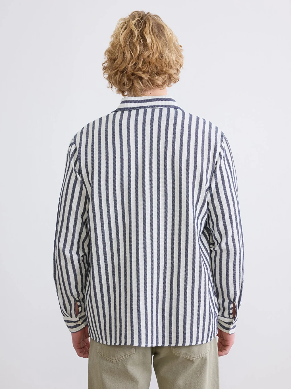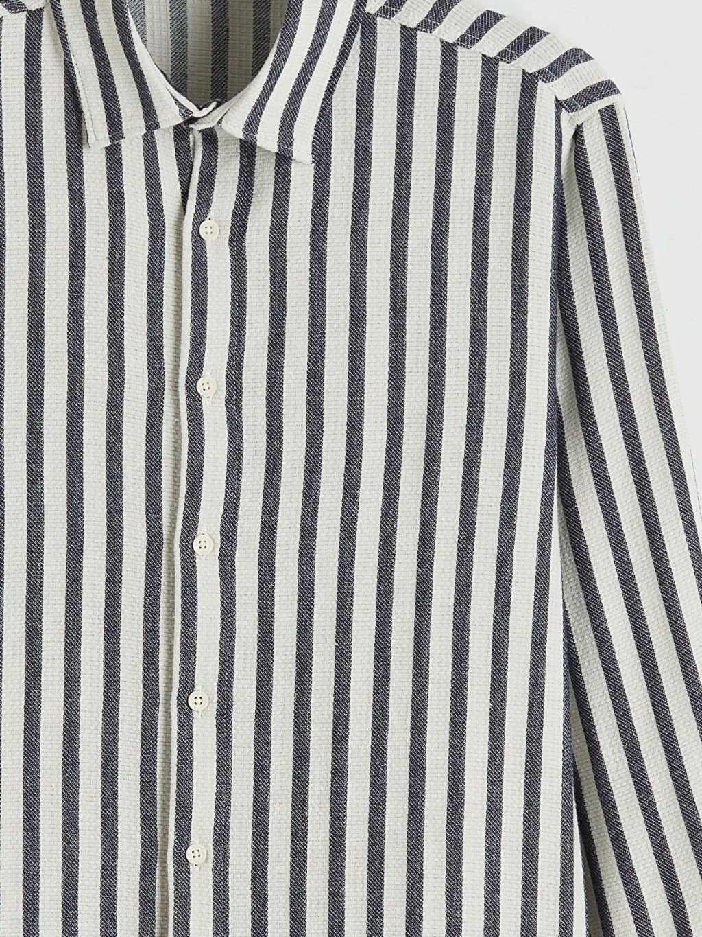 Çizgili desenli, uzun kollu erkek gömlek, dokulu kumaştan üretilmiştir ve önden düğme kapamalıdır.