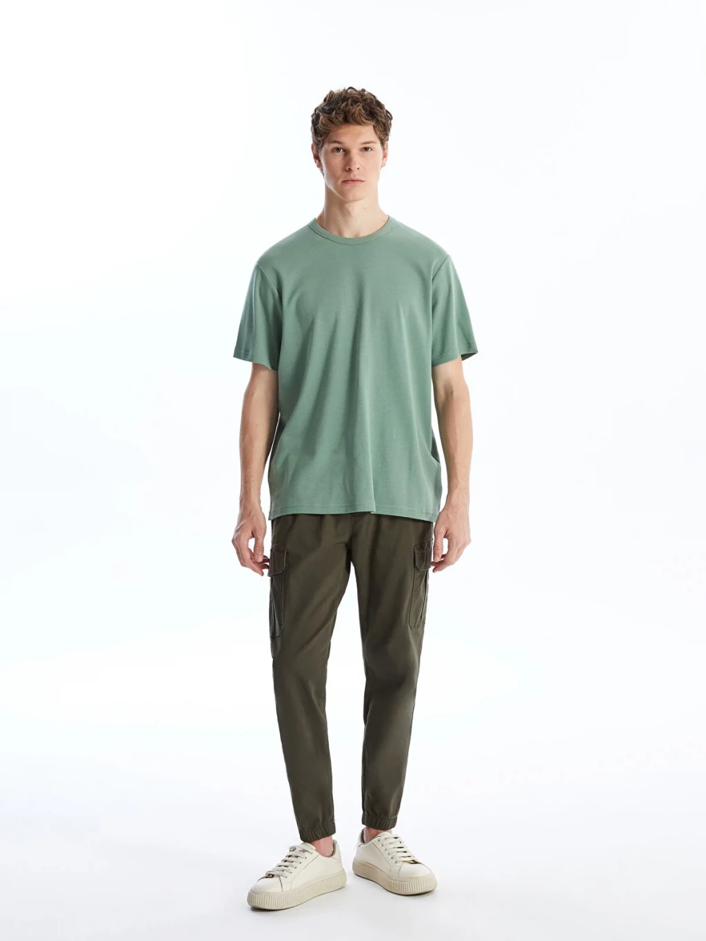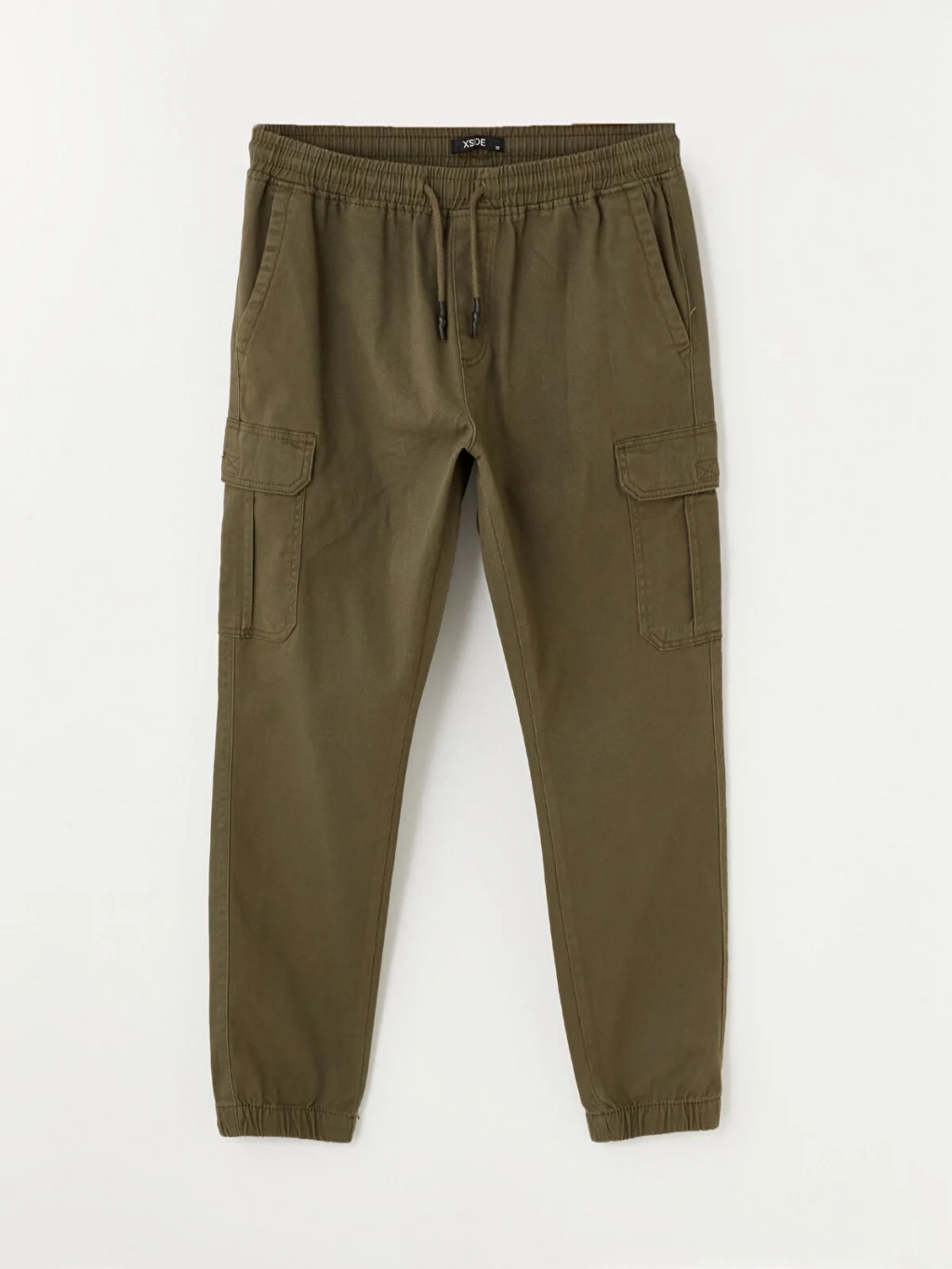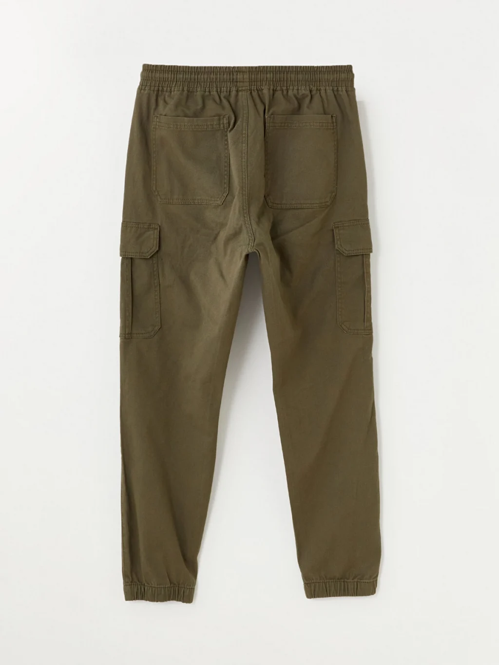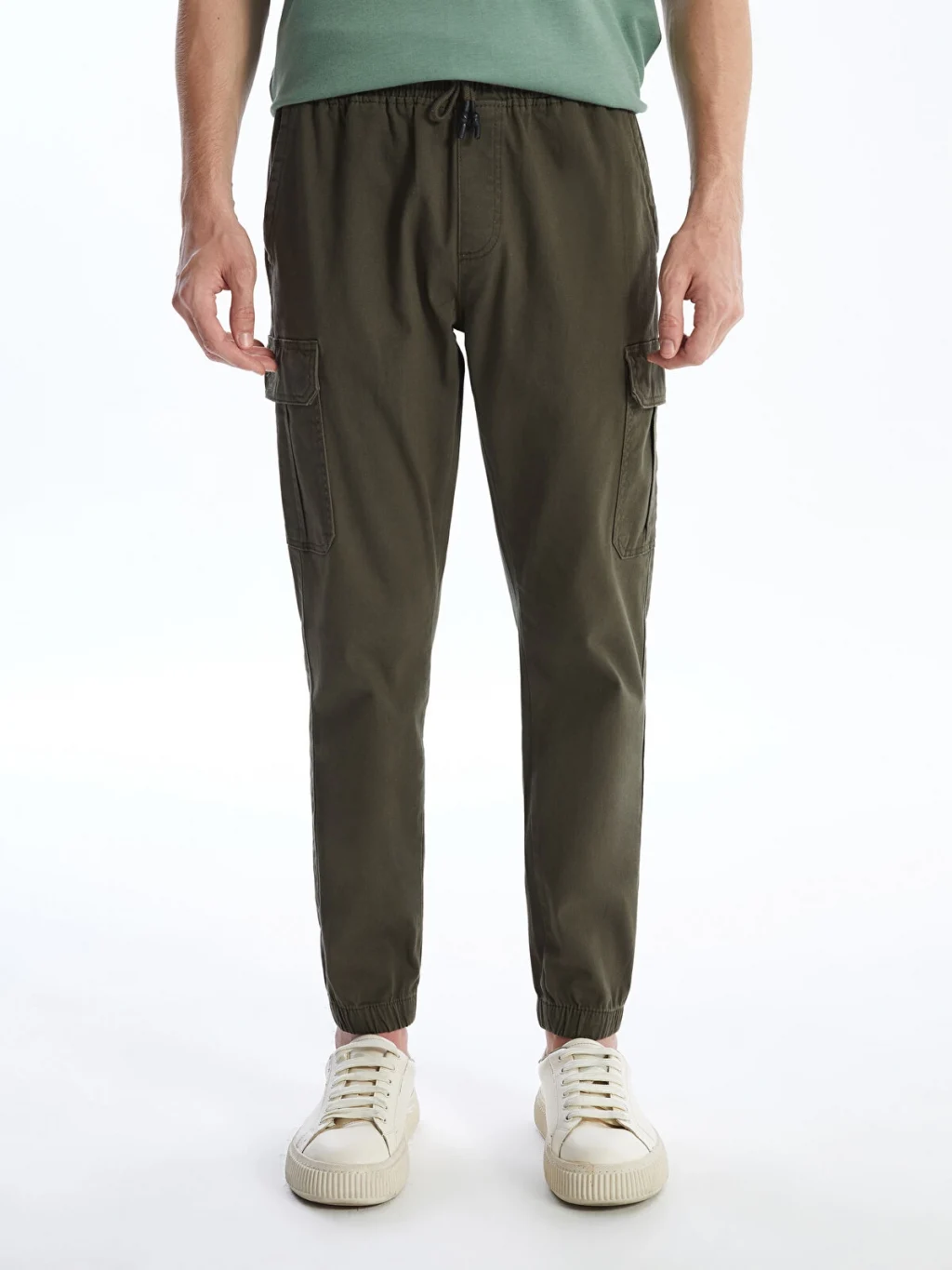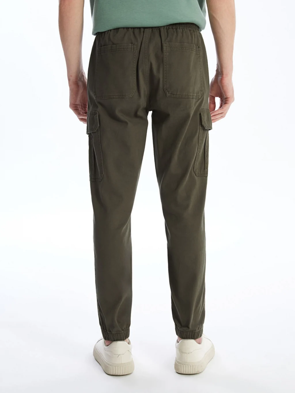 Yüksek pamuk içerikli gabardin kumaştan üretilmiş erkek kargo pantolon, beli ve paçaları lastikli, normal bel ve standart kalıplıdır.