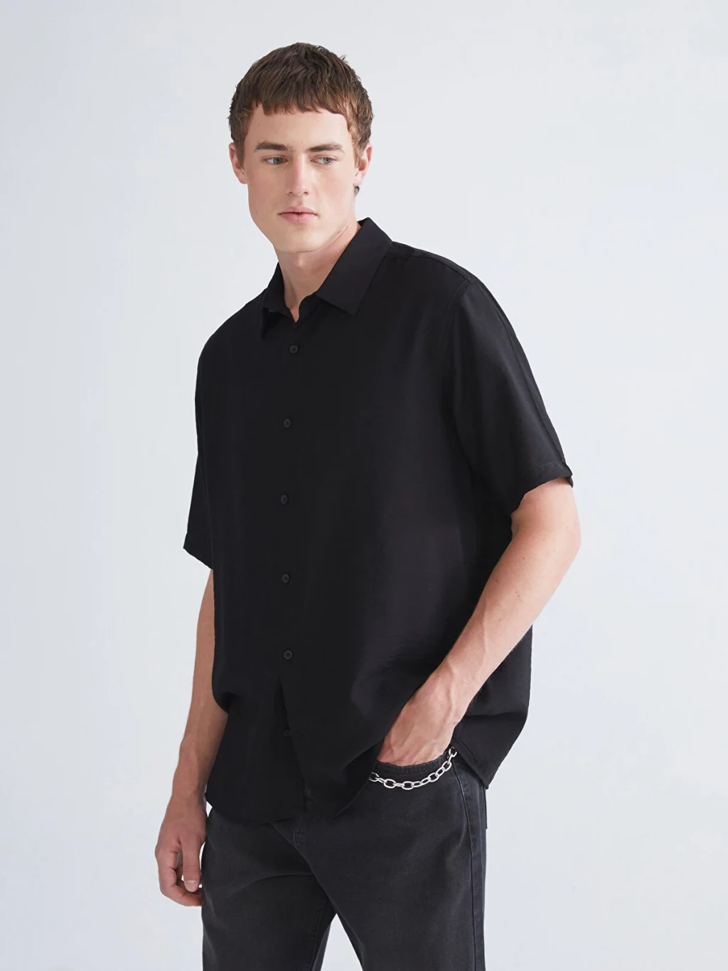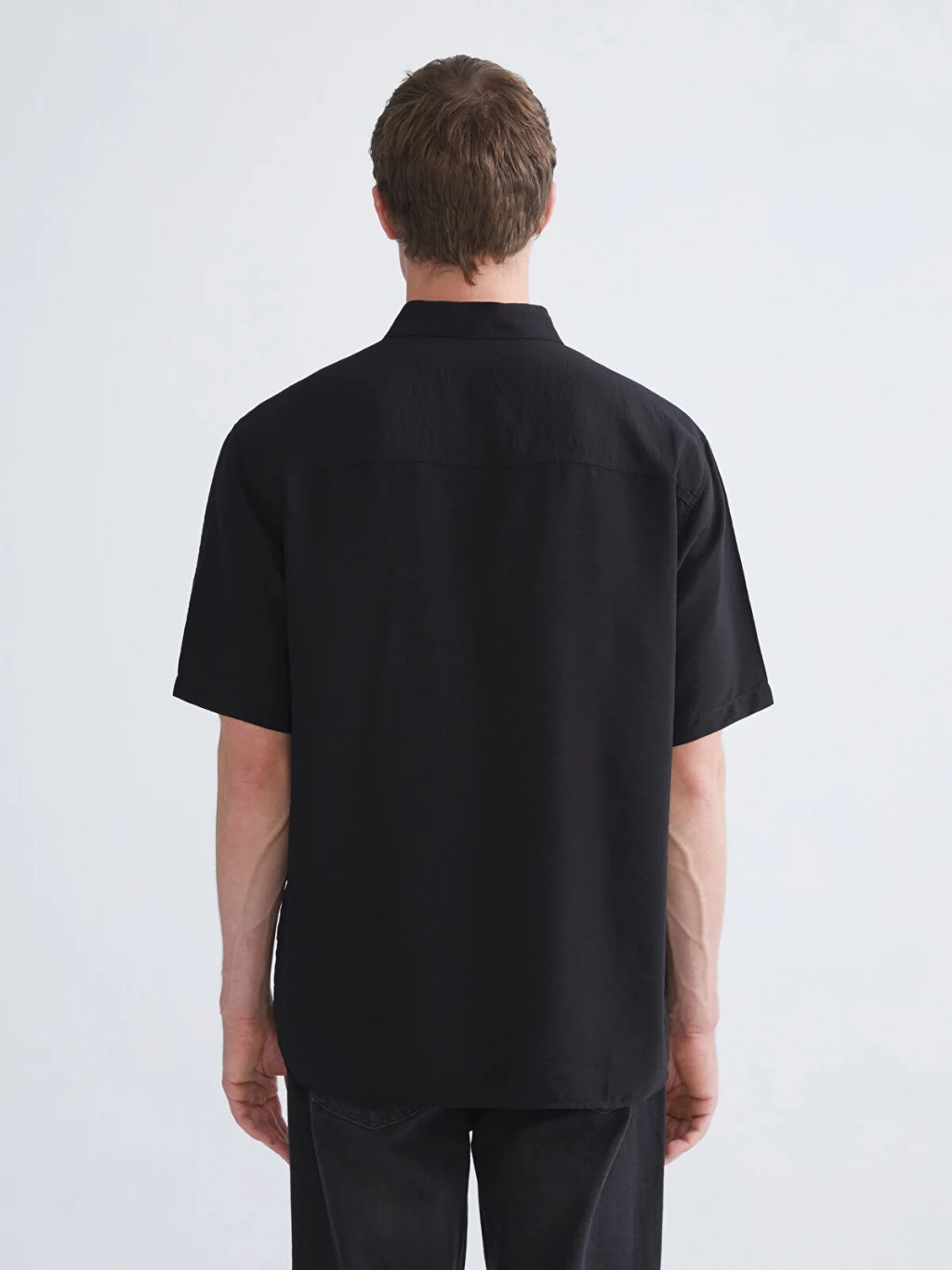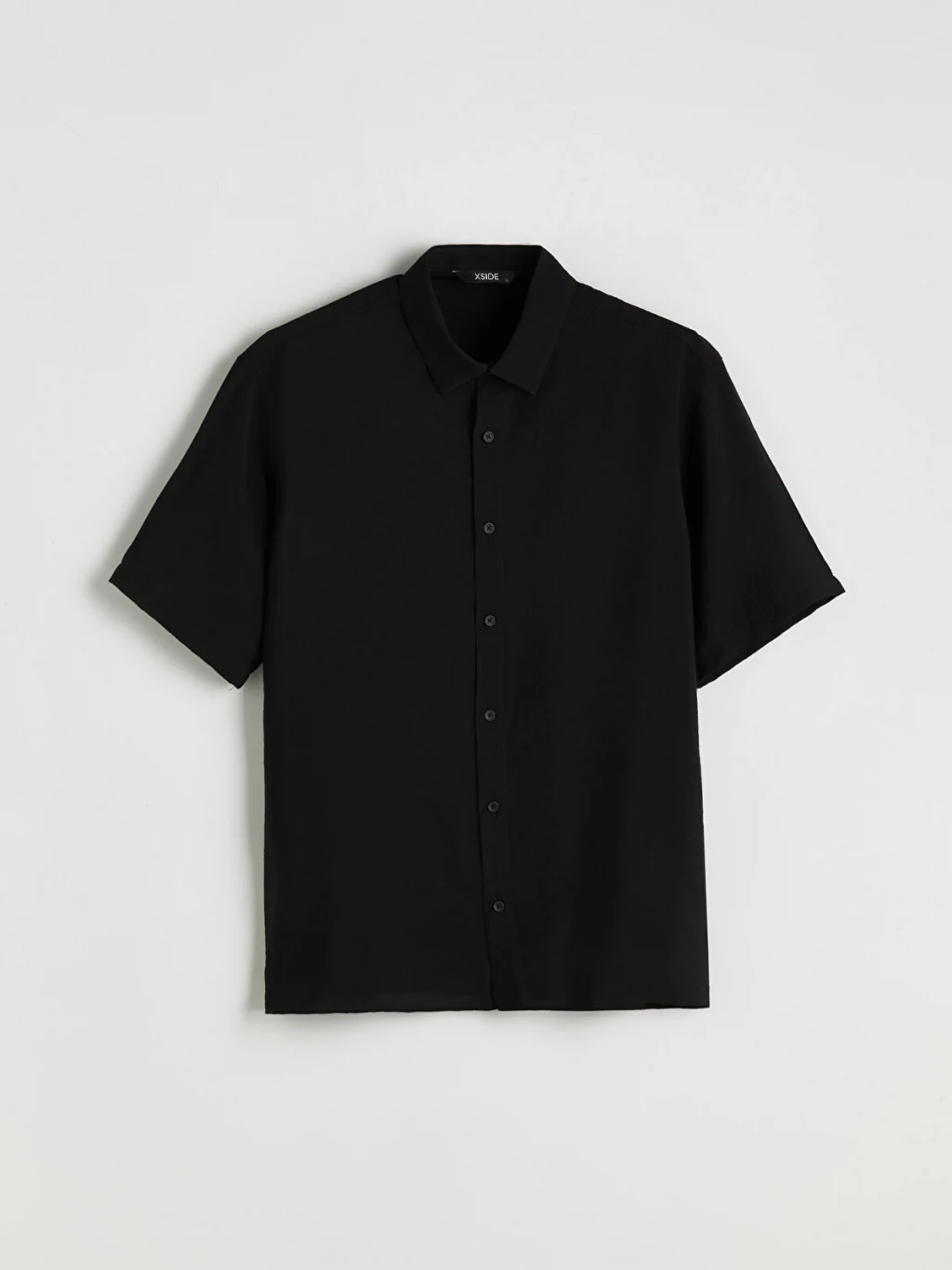 Gömlek yakalı ve kısa kollu erkek gömlek, viskon kumaştan üretilmiştir. Önden düğme kapamalıdır.