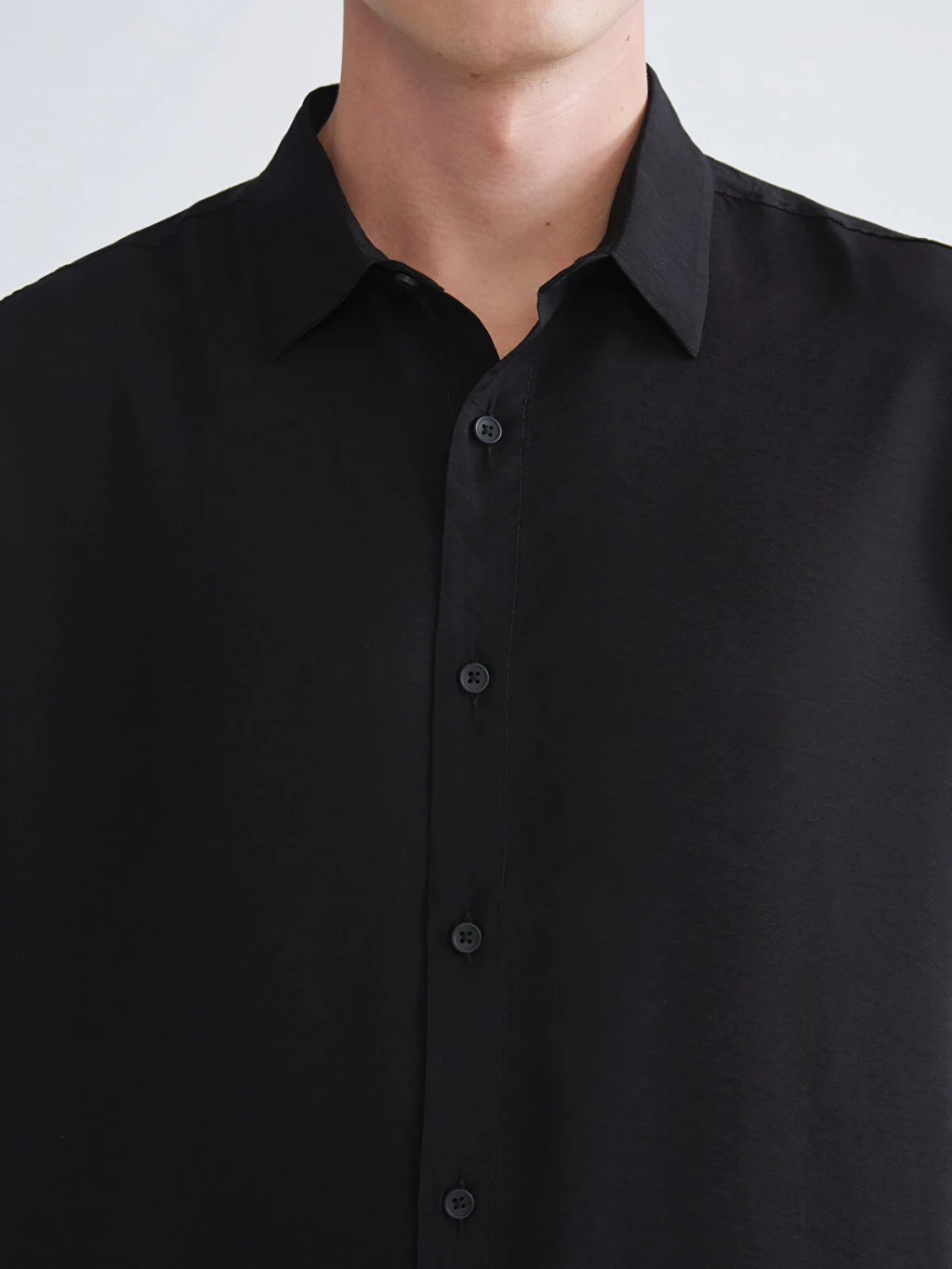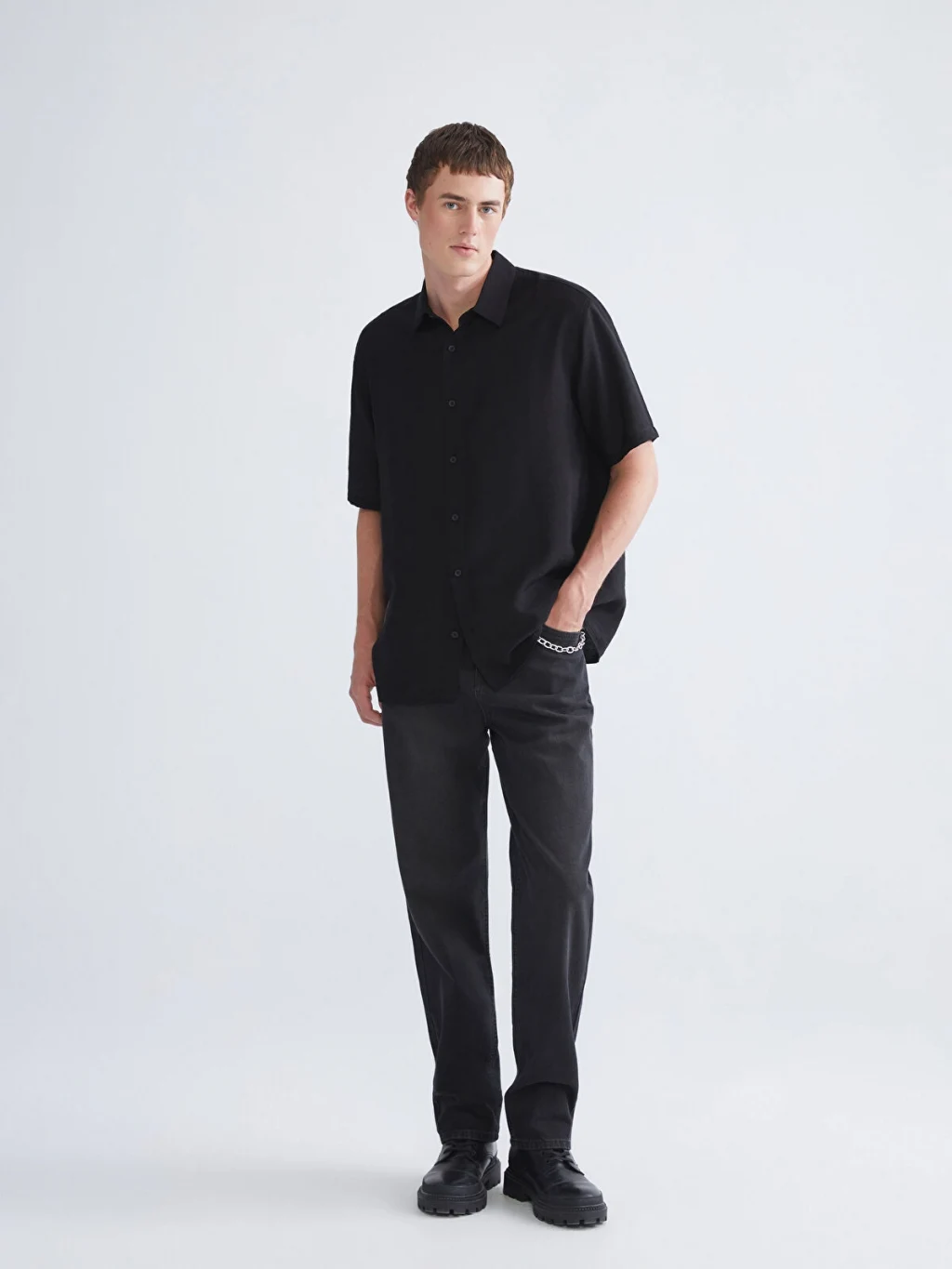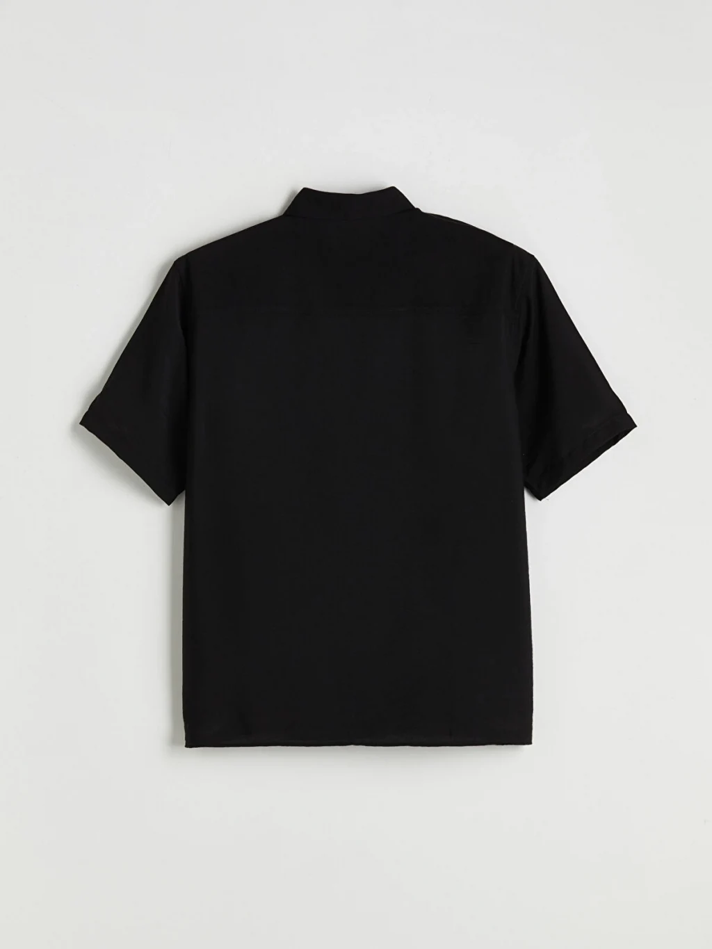 Gömlek yakalı ve kısa kollu erkek gömlek, viskon kumaştan üretilmiştir. Önden düğme kapamalıdır.