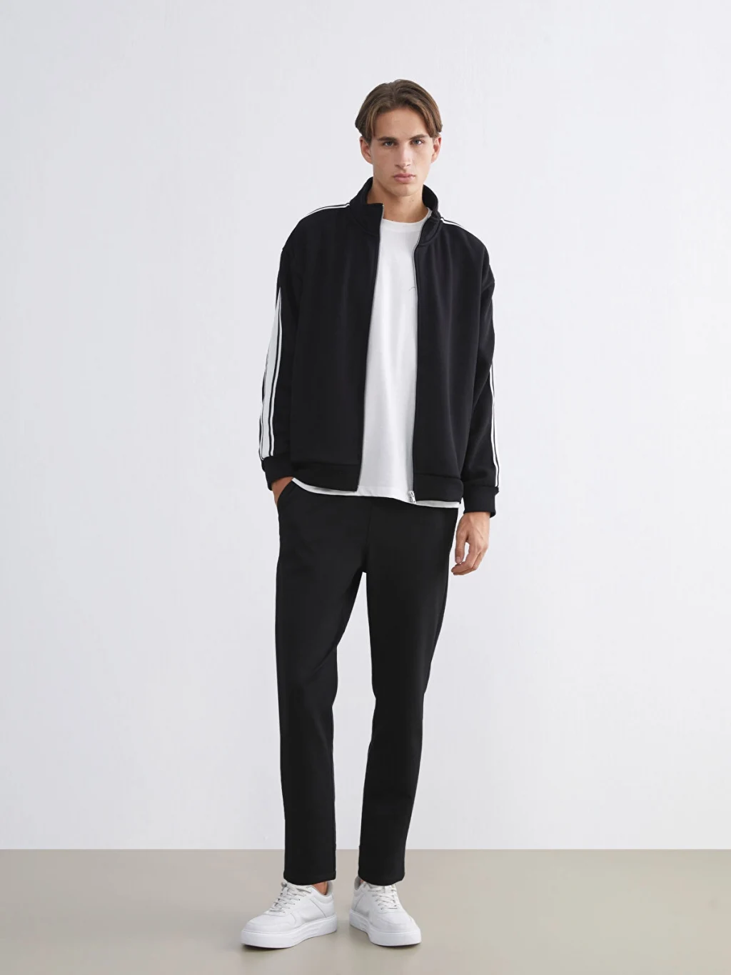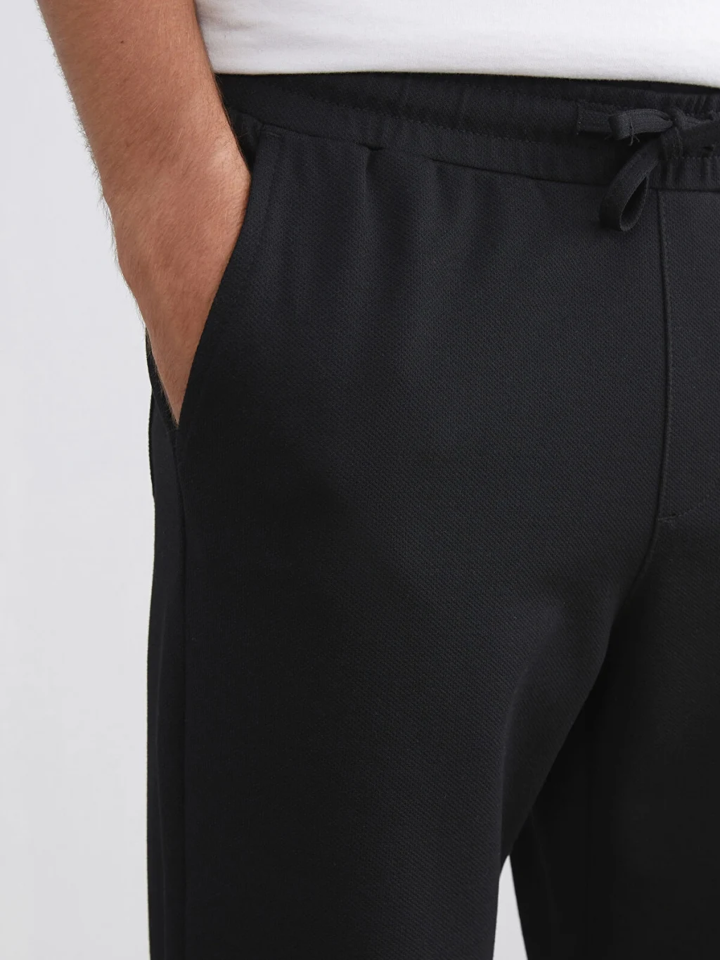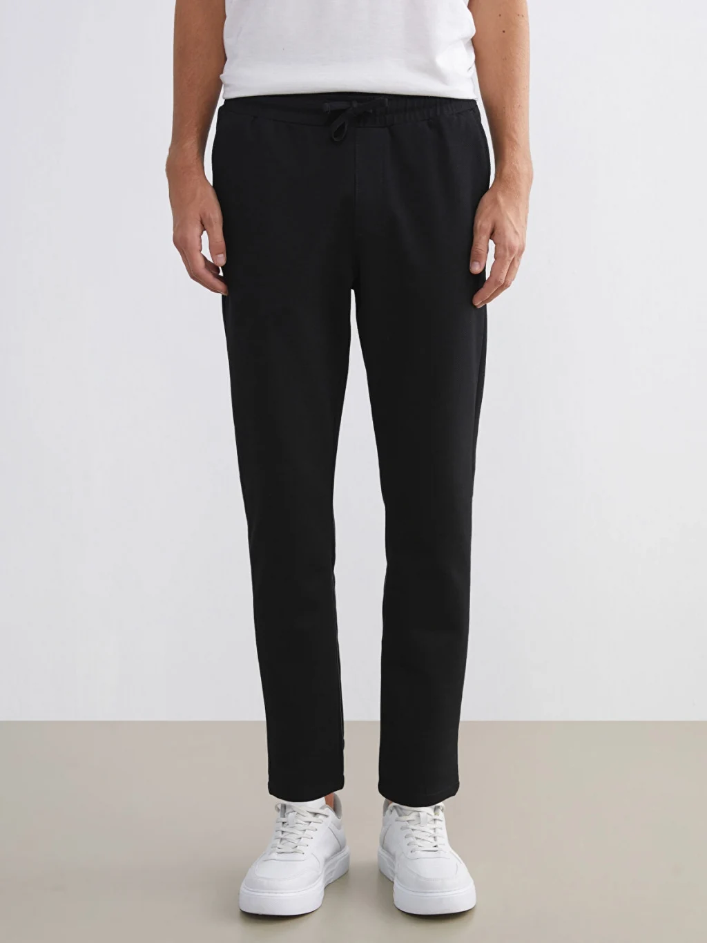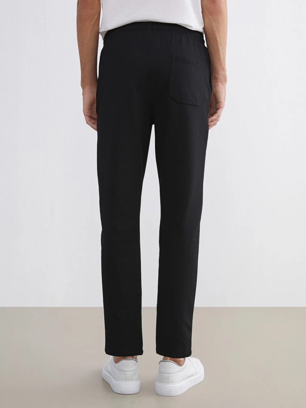 Standart kalıp erkek pantolon, interlok kumaştan üretilmiştir. Beli lastikli ve ayarlanabilir bağcıklı olup, düz paçalıdır.