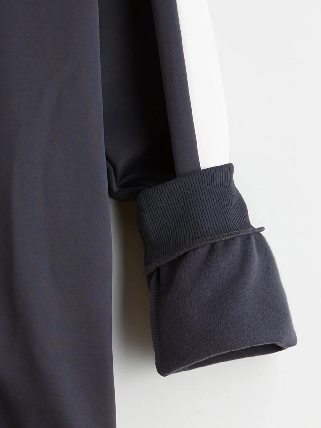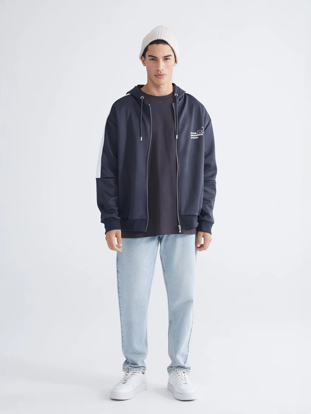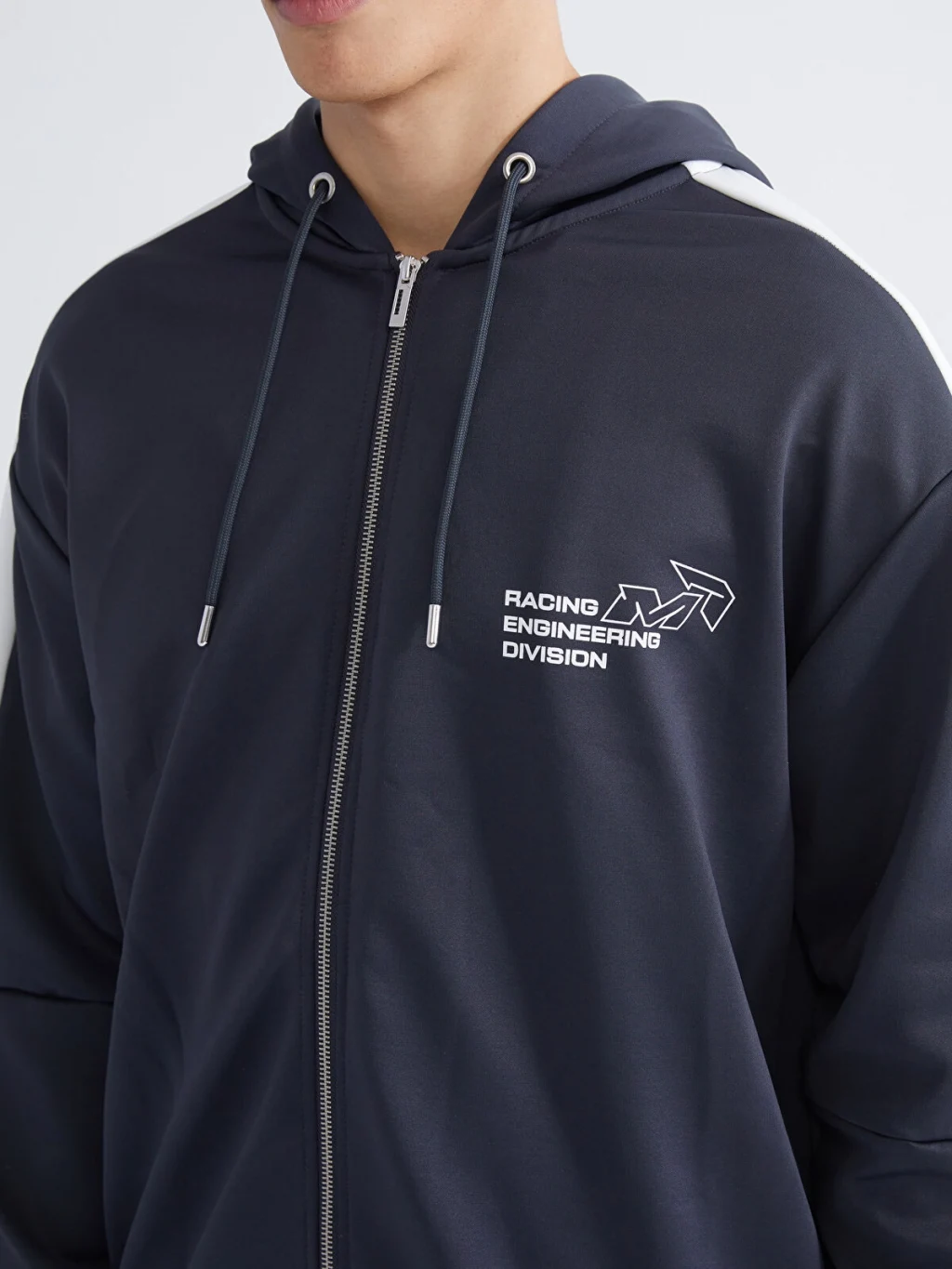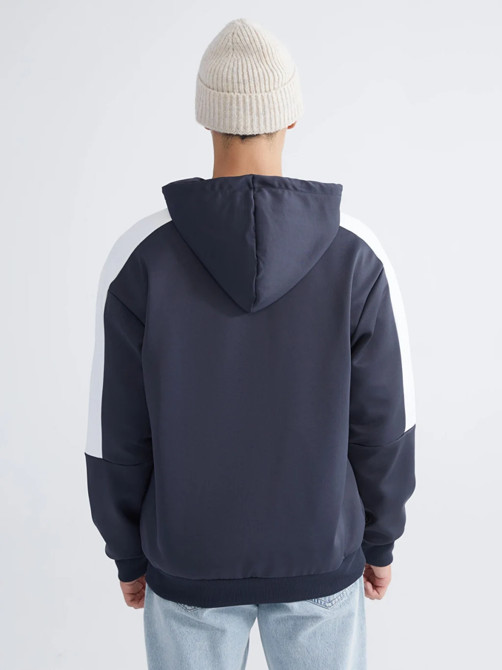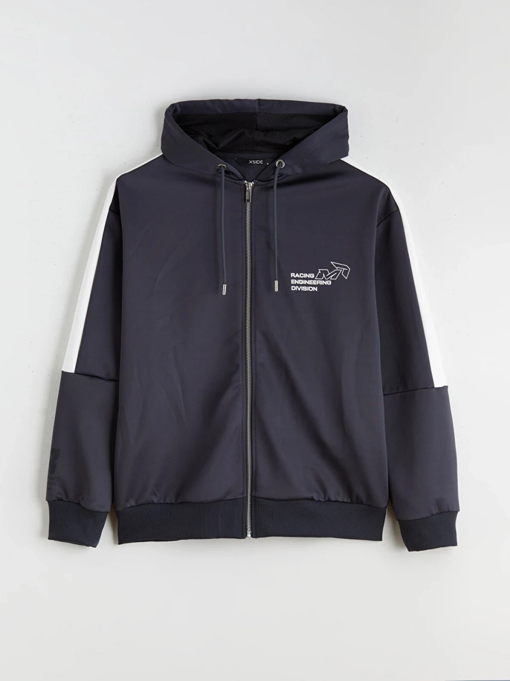 Kalın kumaşlı, kapüşonlu ve fermuar kapamalı erkek sweatshirt, uzun kolludur. Renk bloklu modelin göğüs ve kol kısmında baskı detayı bulunur.
