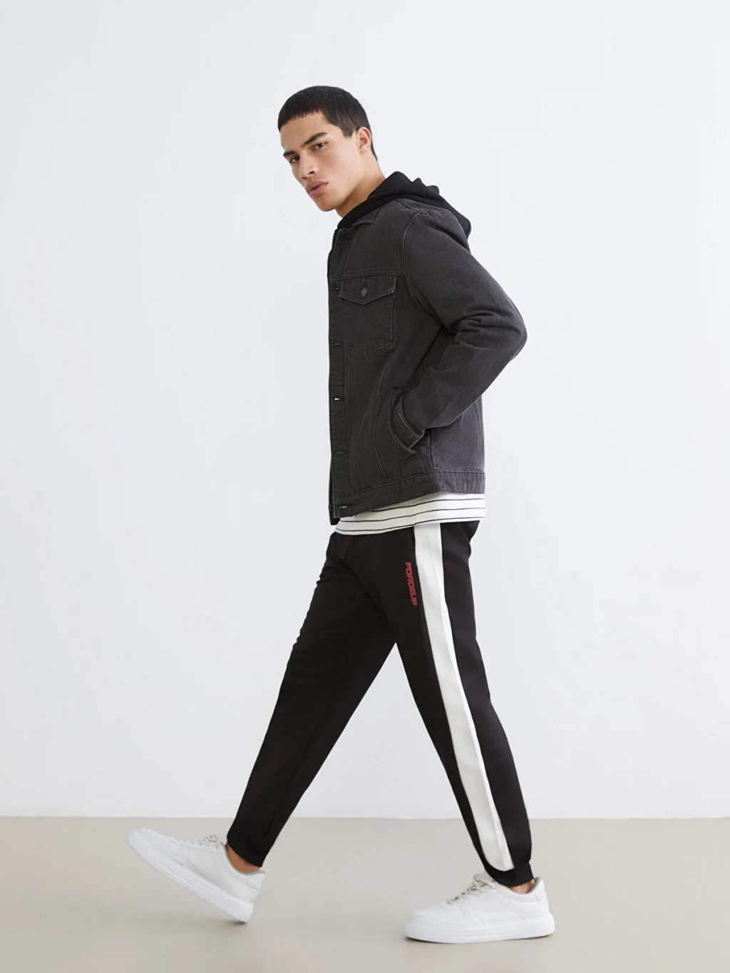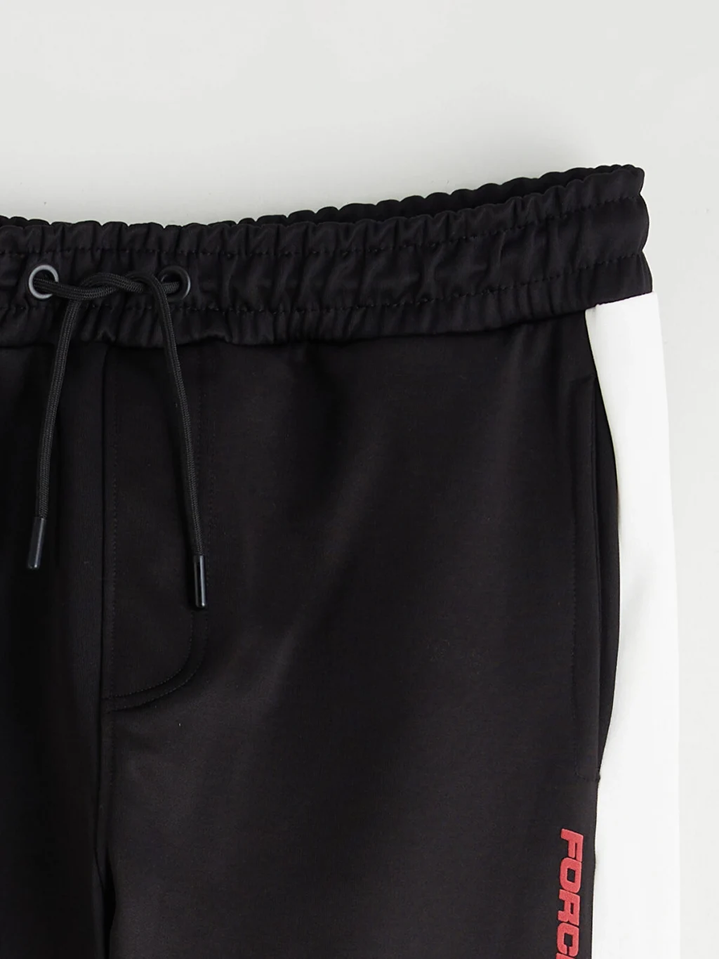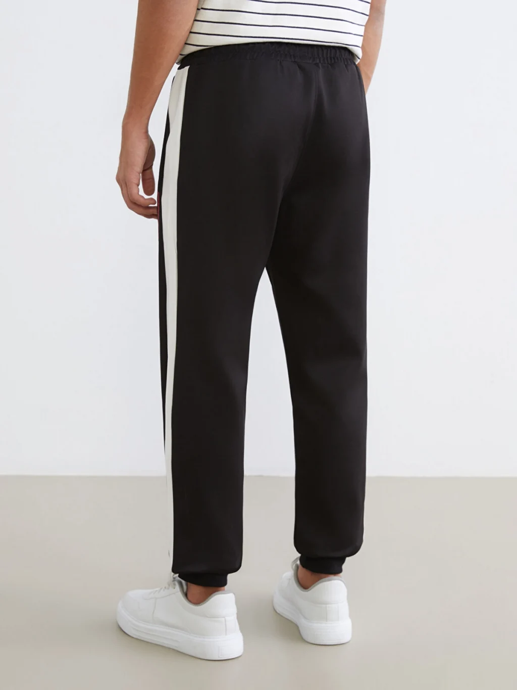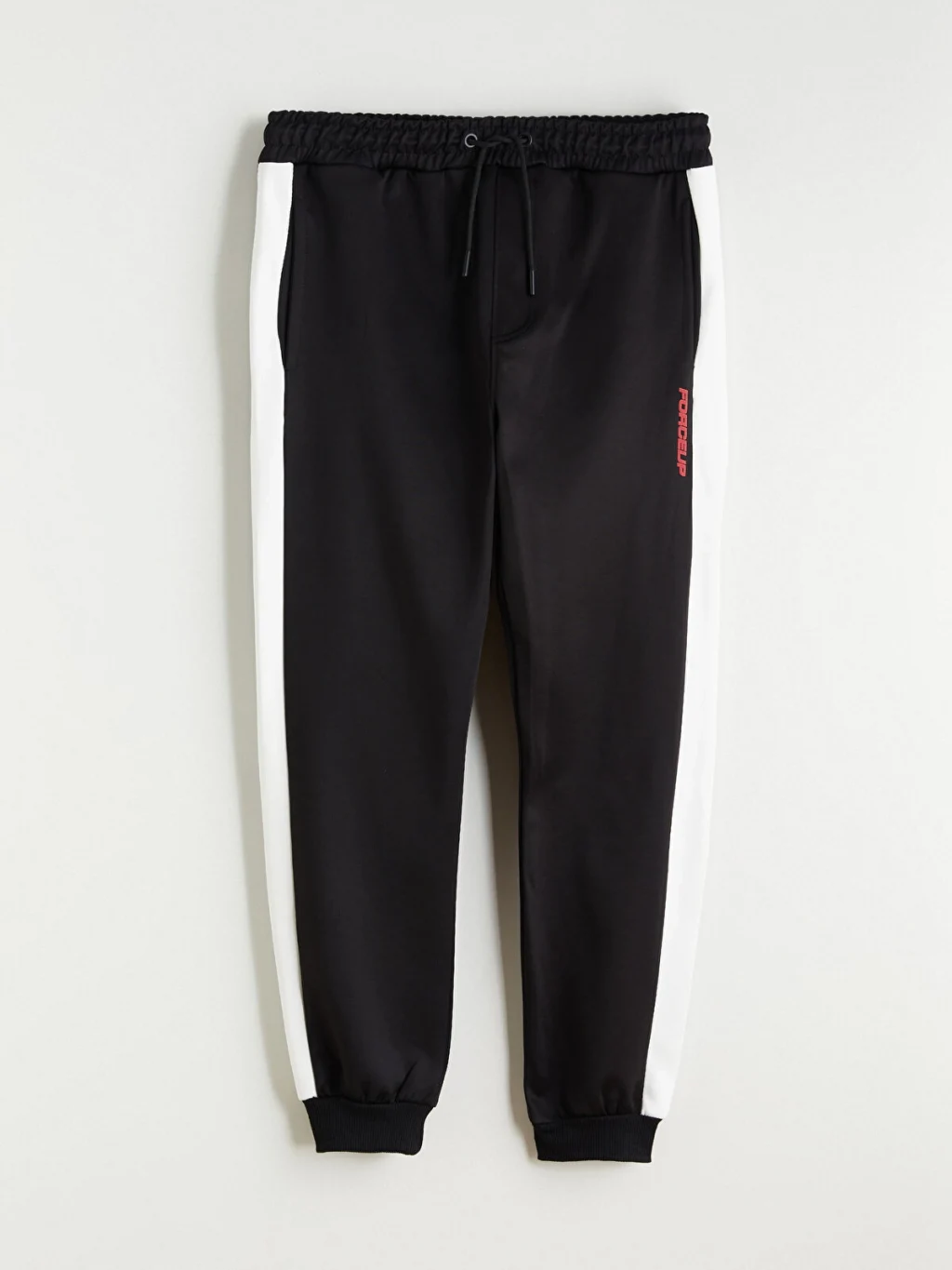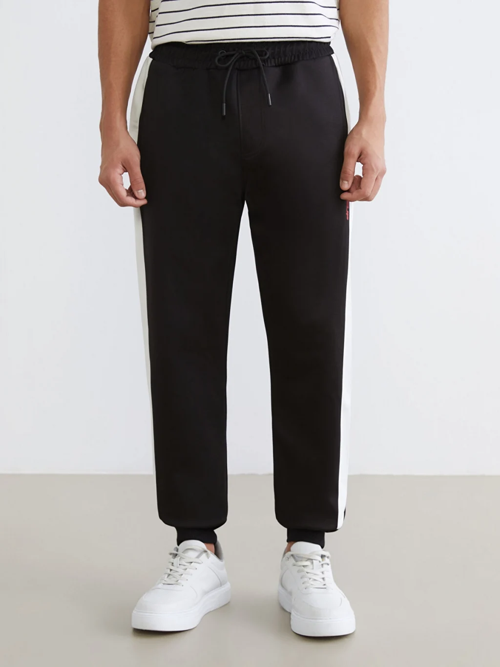 Beli lastikli ve ayarlanabilir bağcıklı erkek eşofman altı, yanları cepli ve kontrast şeritlidir. Paçaları ribanalıdır.
