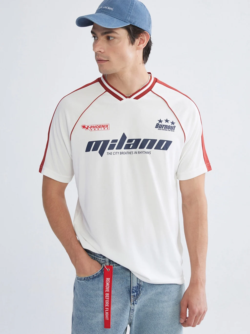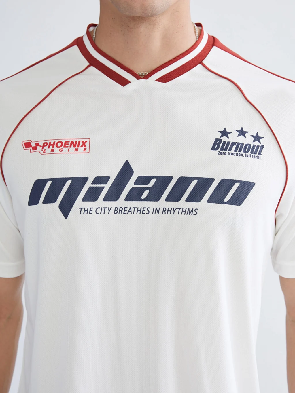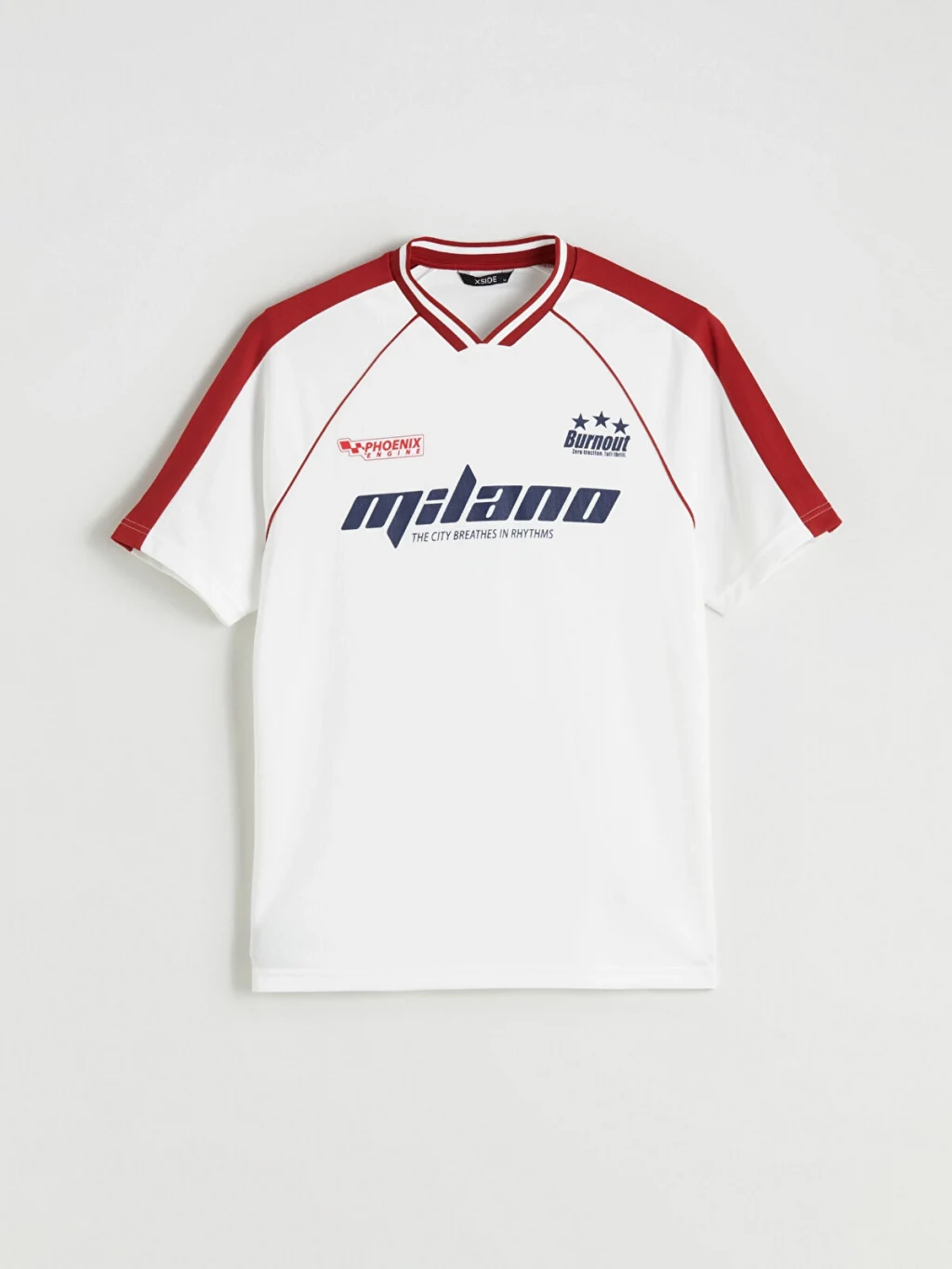 Standart kalıp, V yakalı, kısa kollu ve önü baskılı erkek tişört. Omuzlarında ve kollarında şerit detayı bulunur.