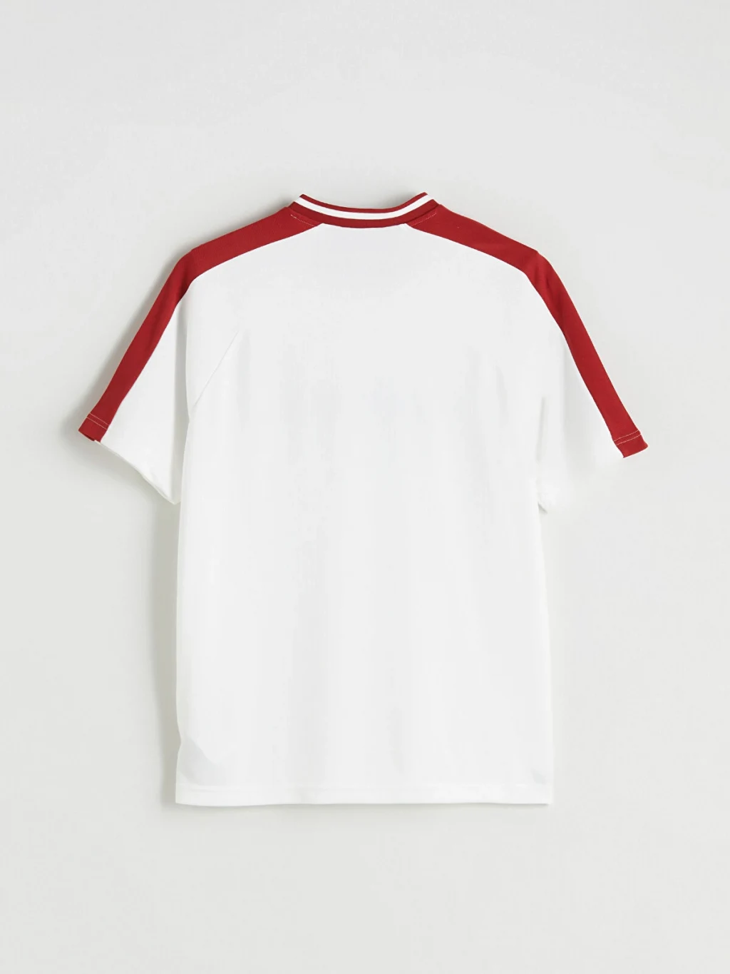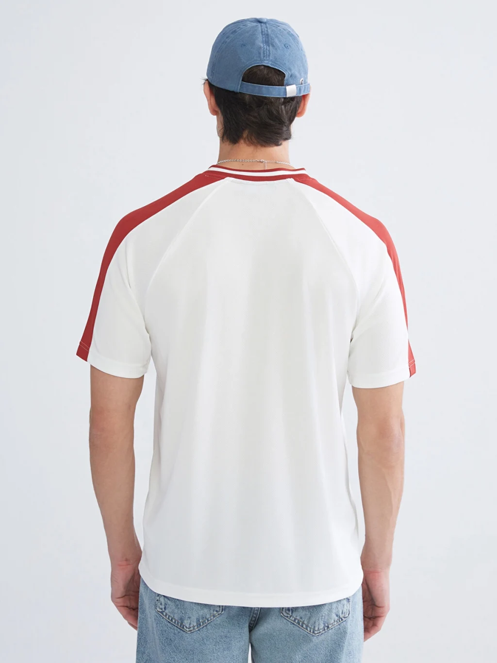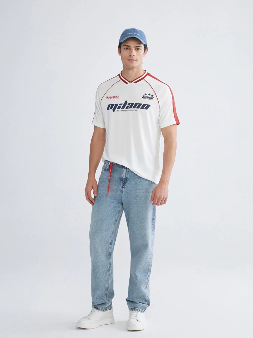 Standart kalıp, V yakalı, kısa kollu ve önü baskılı erkek tişört. Omuzlarında ve kollarında şerit detayı bulunur.