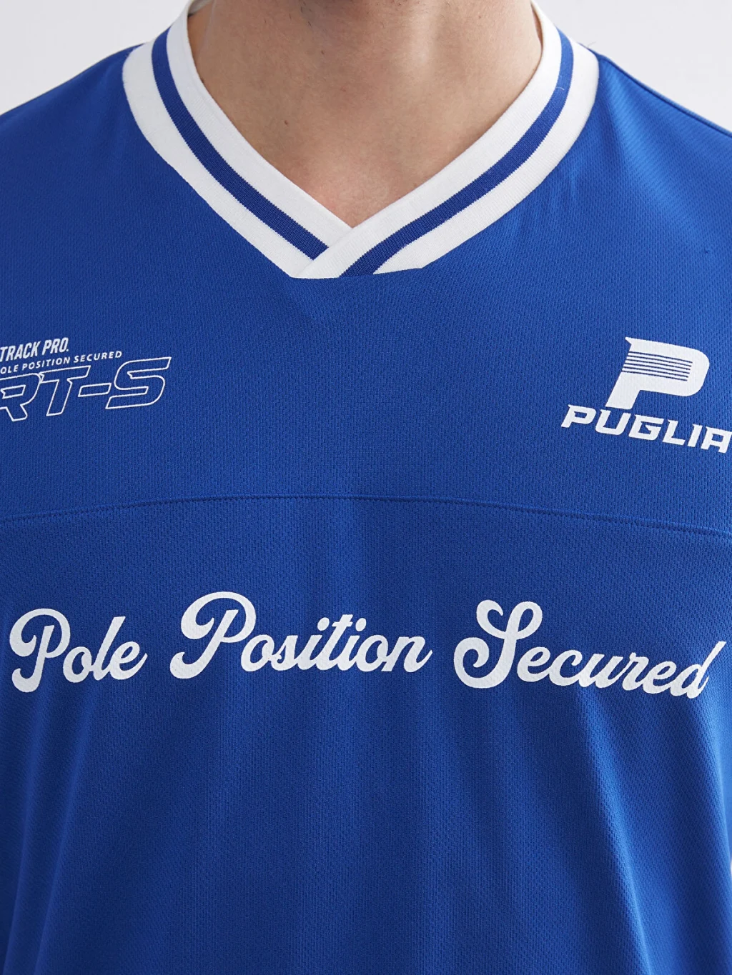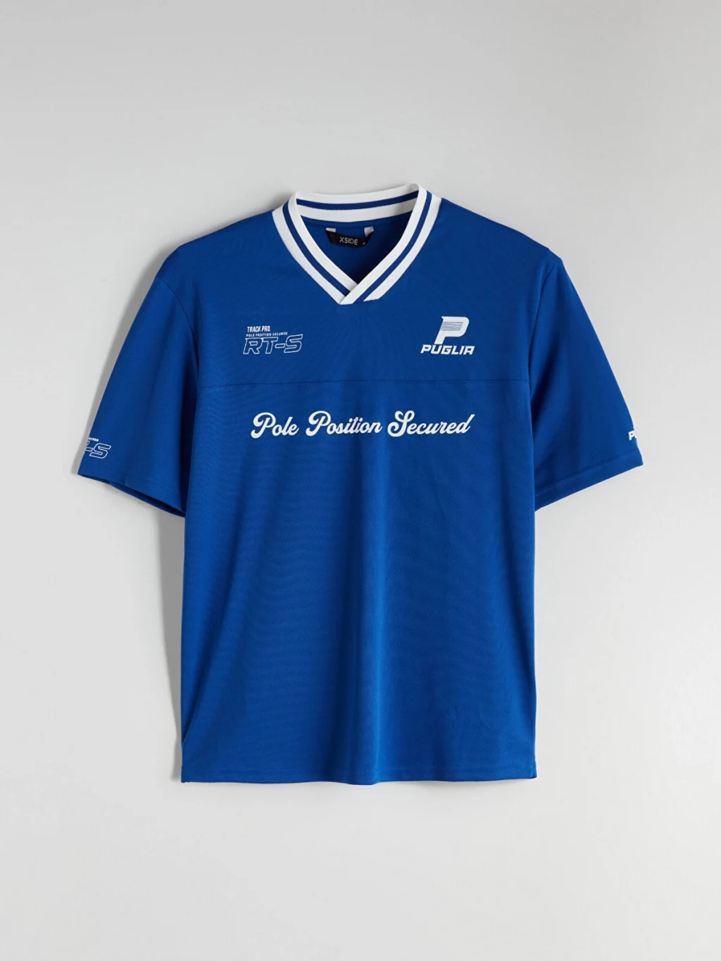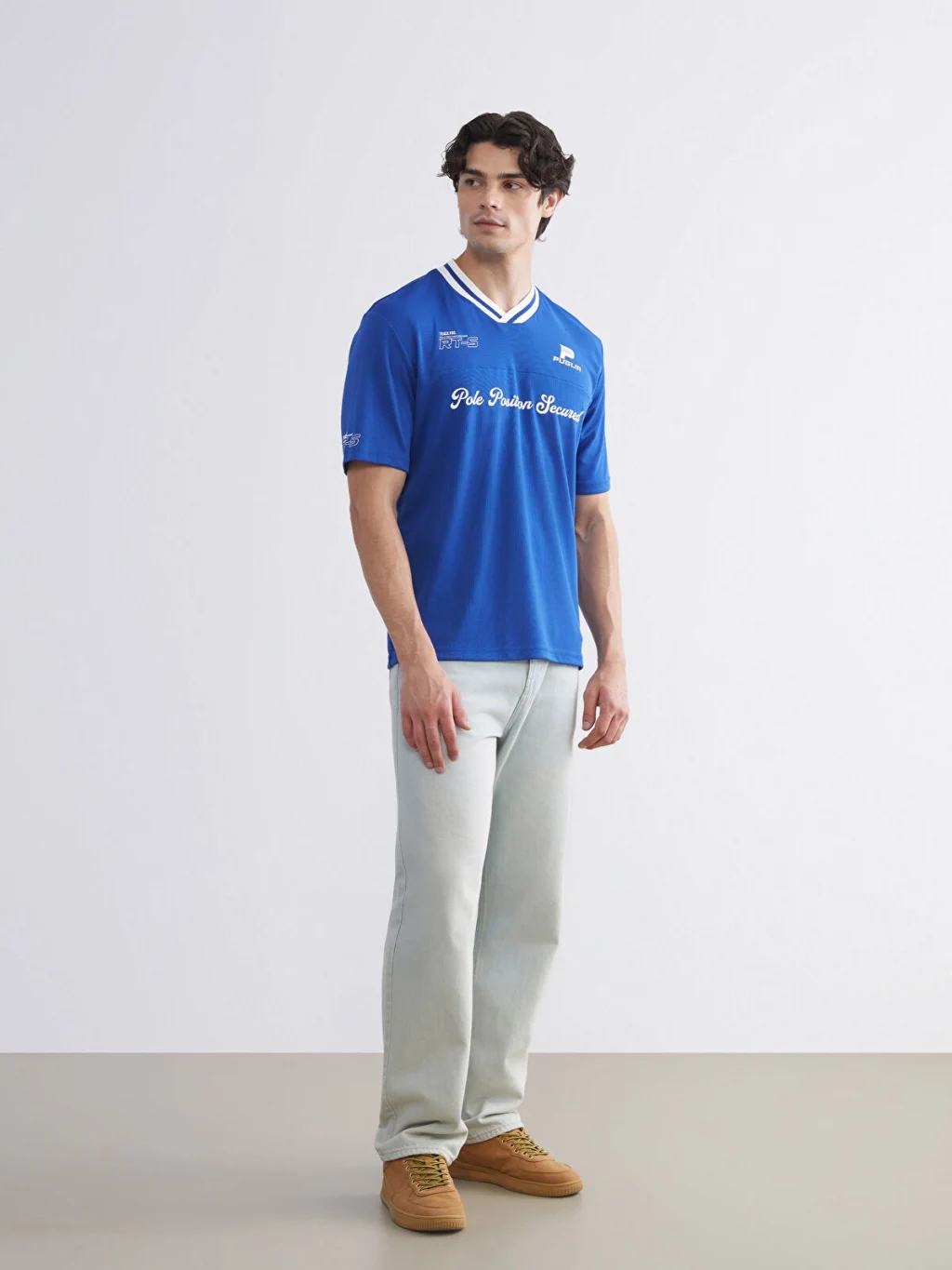 Standart kalıplı erkek tişört, şeritli V yakalı ve kısa kolludur. Önü ve kolları baskı detaylarına sahiptir.