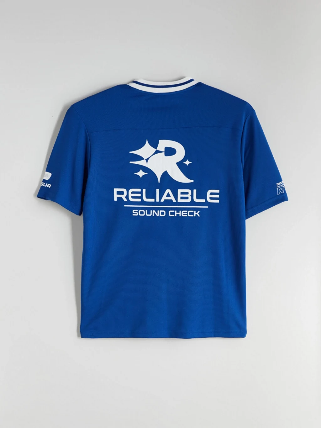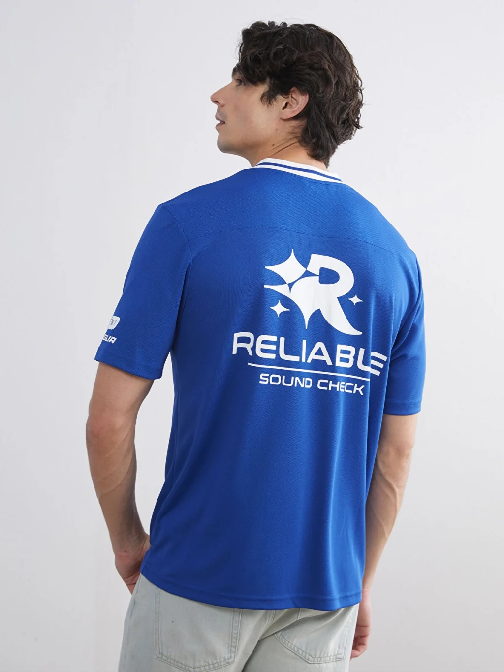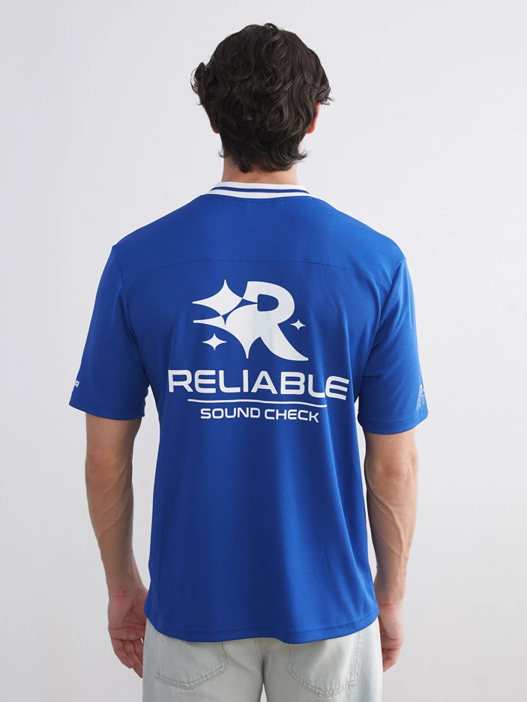 Standart kalıplı erkek tişört, şeritli V yakalı ve kısa kolludur. Önü ve kolları baskı detaylarına sahiptir.