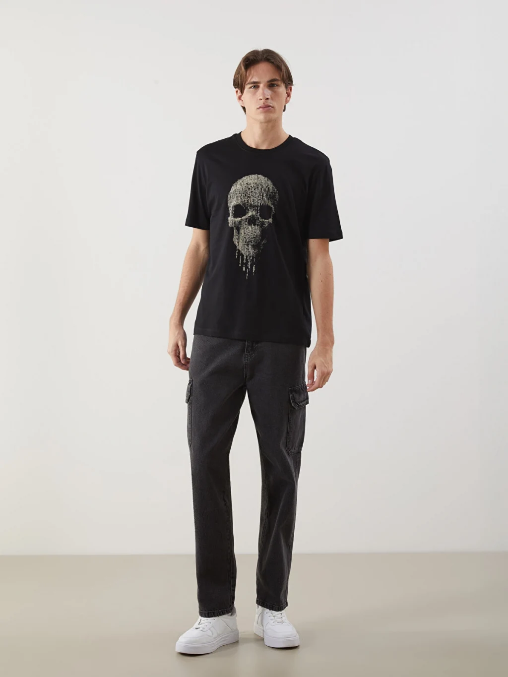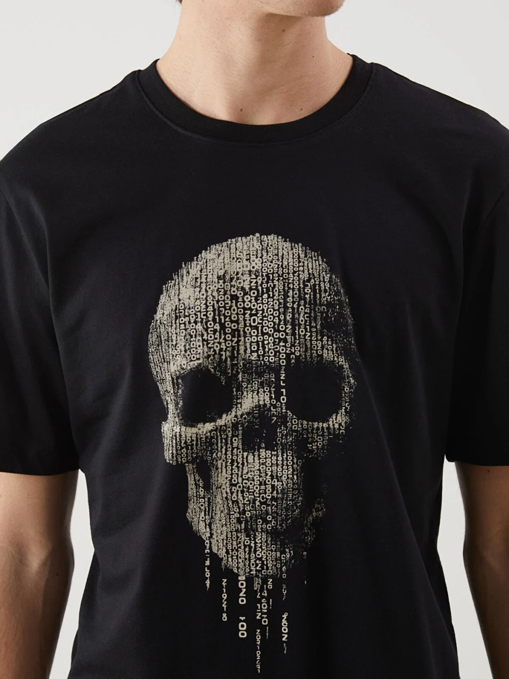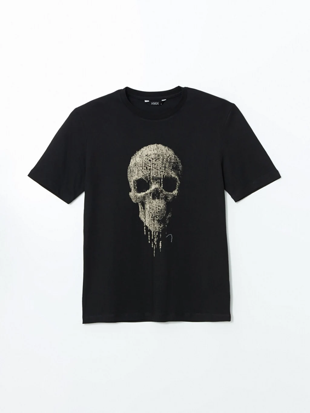 Standart kalıp, bisiklet yaka ve kısa kollu erkek tişört, %100 pamuklu penye kumaştan üretilmiştir. Ön yüzünde kurukafa baskısı bulunur.