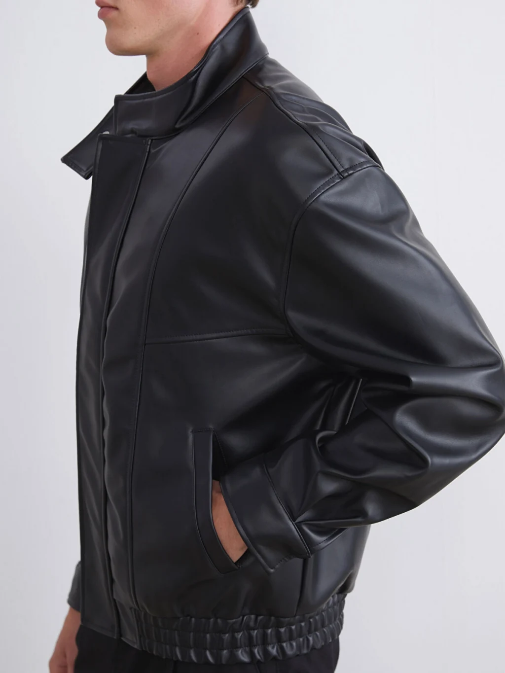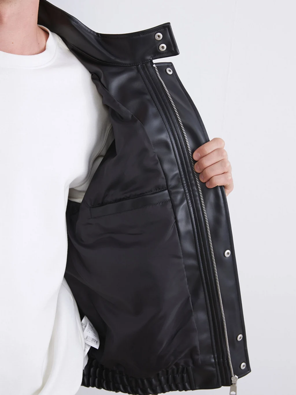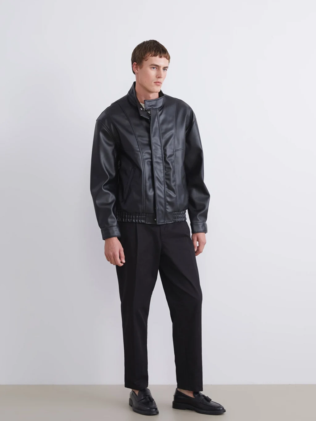 Dik yakalı ve uzun kollu deri görünümlü erkek mont. Fermuar kapamalıdır, yan cepleri bulunur. Etek ucu ve manşetleri lastiklidir.