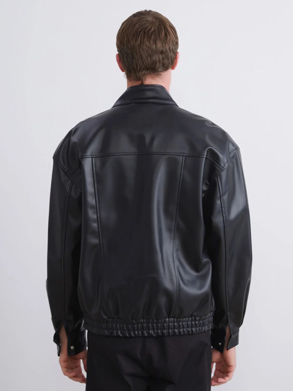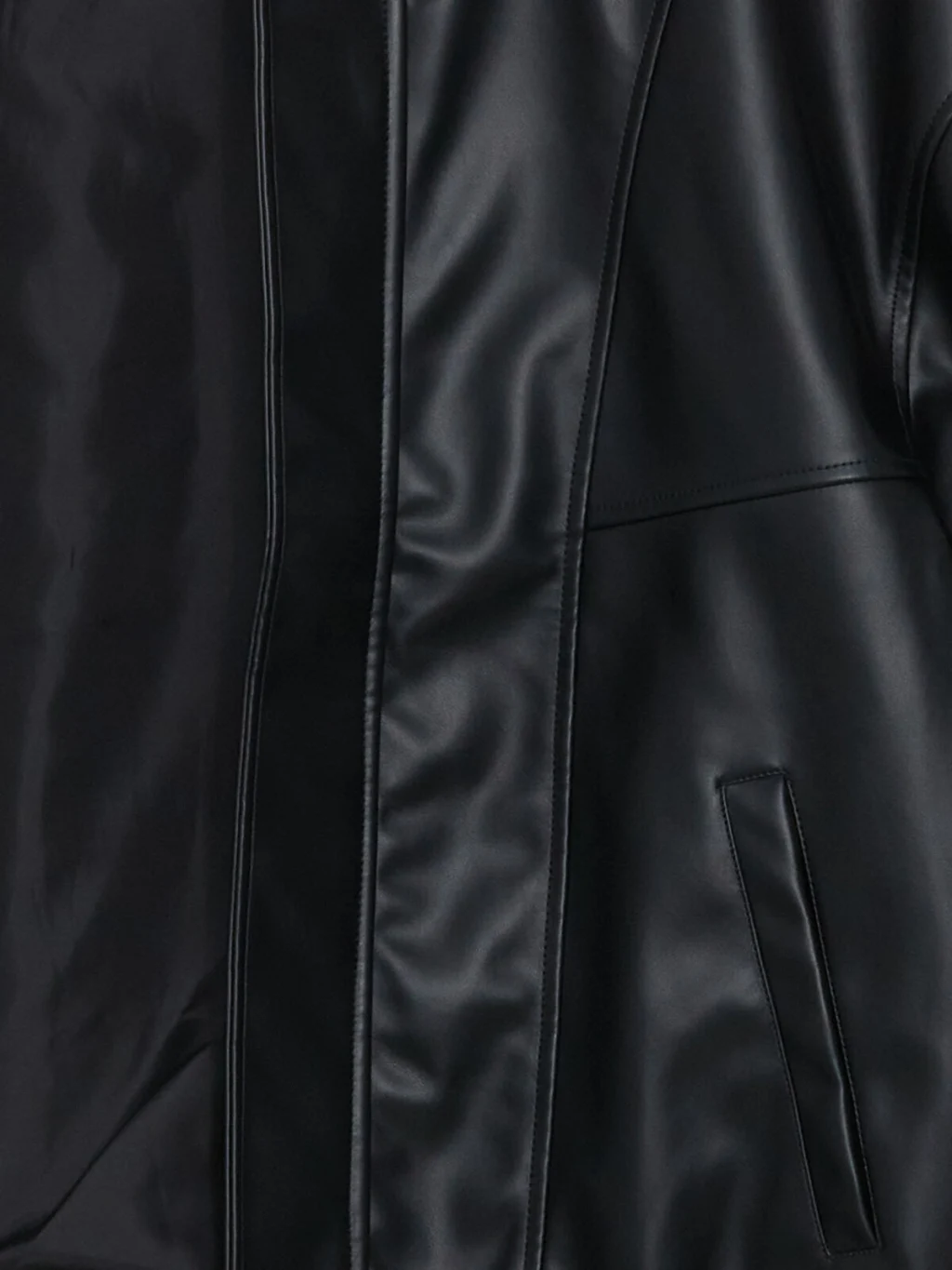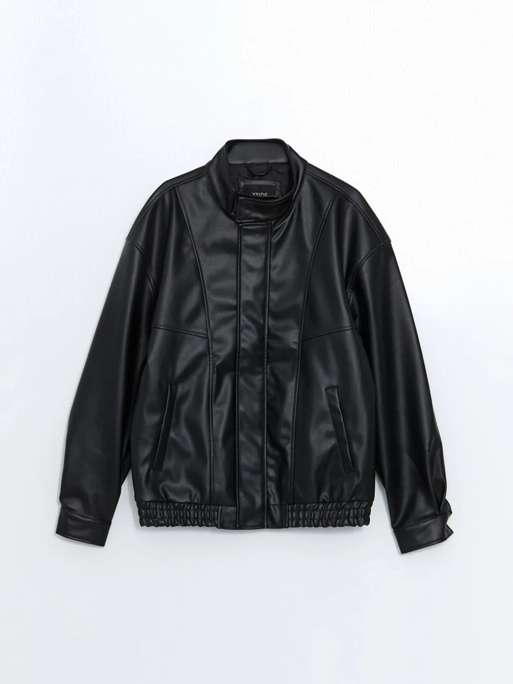 Dik yakalı ve uzun kollu deri görünümlü erkek mont. Fermuar kapamalıdır, yan cepleri bulunur. Etek ucu ve manşetleri lastiklidir.