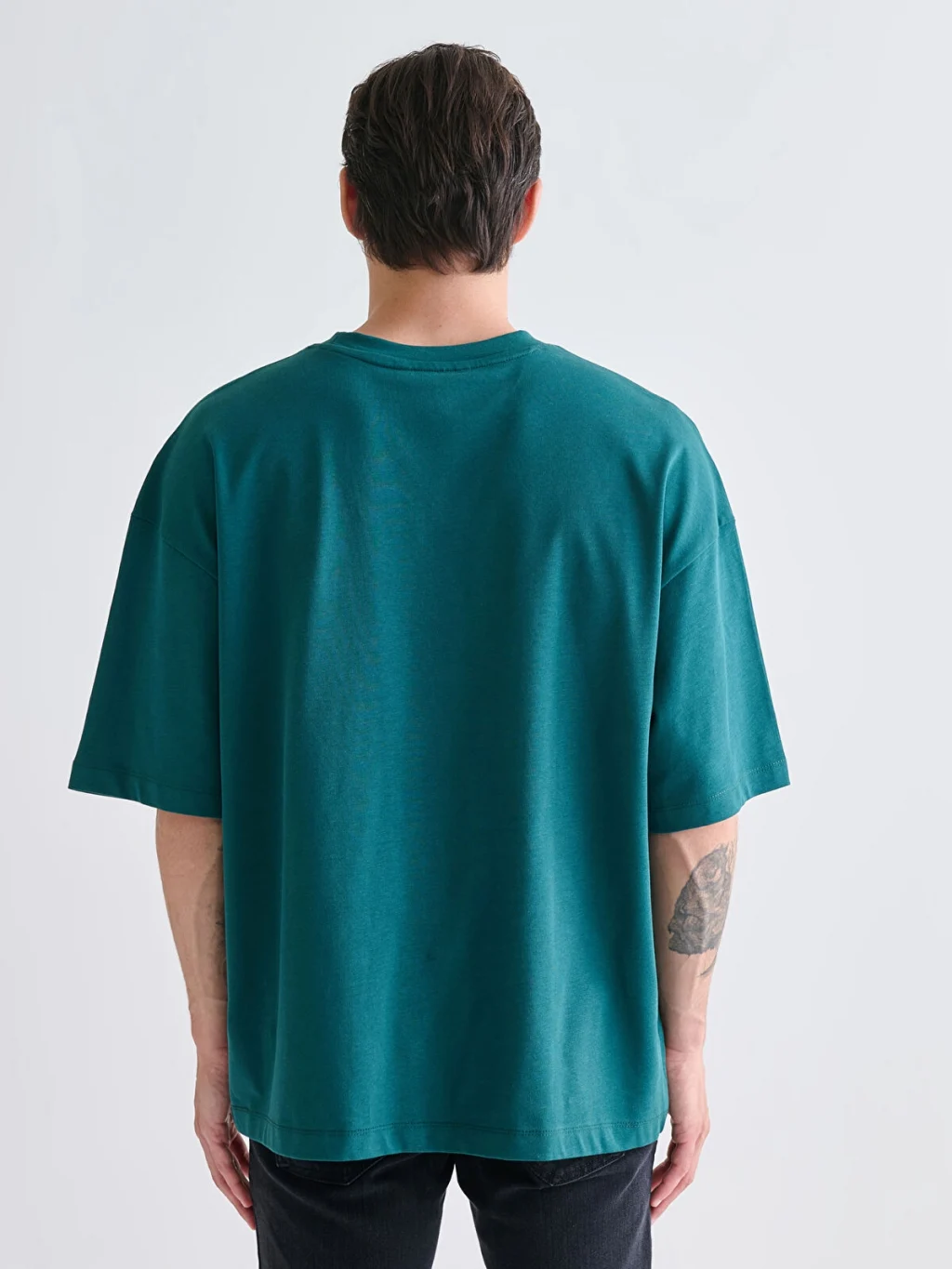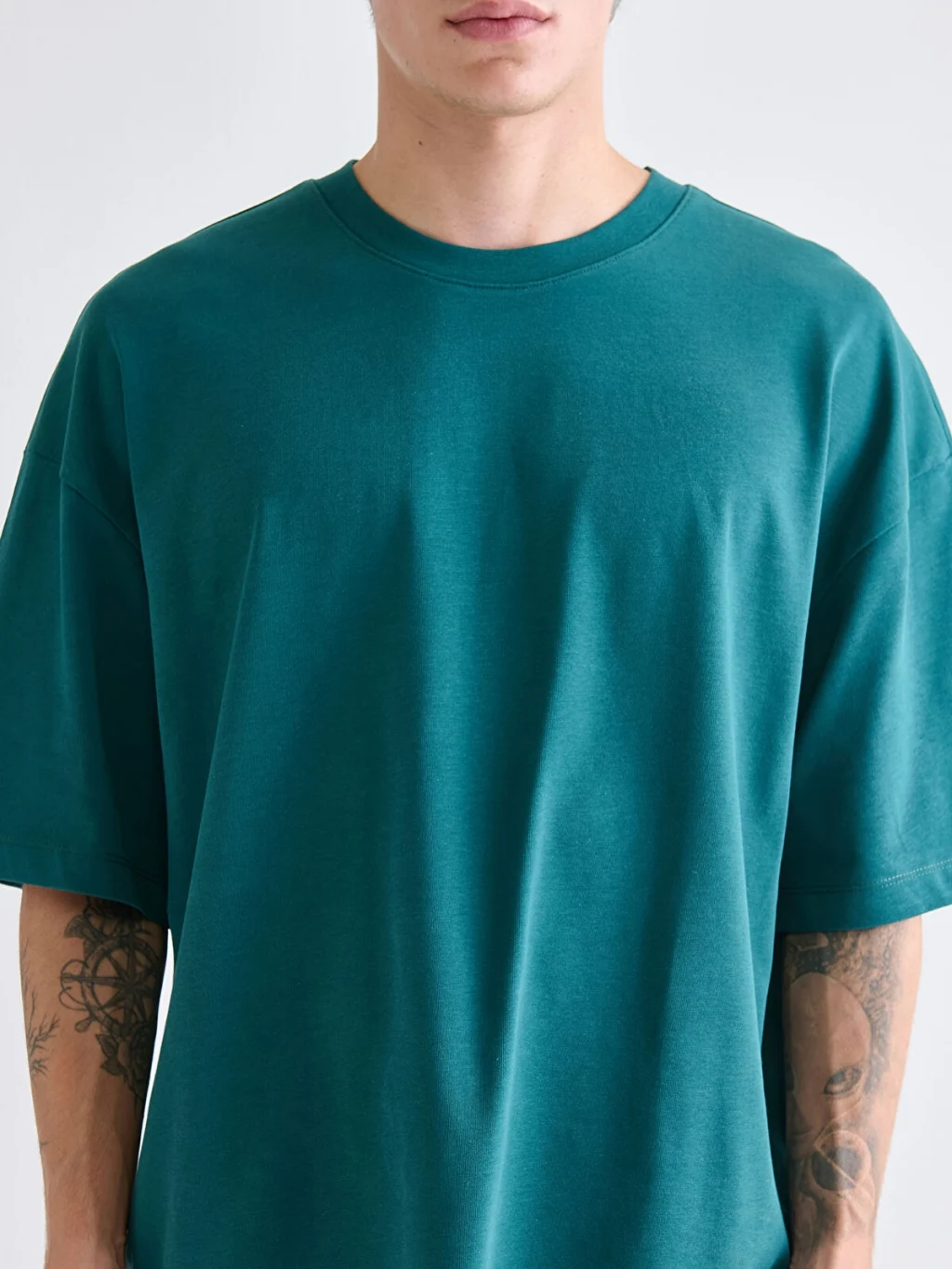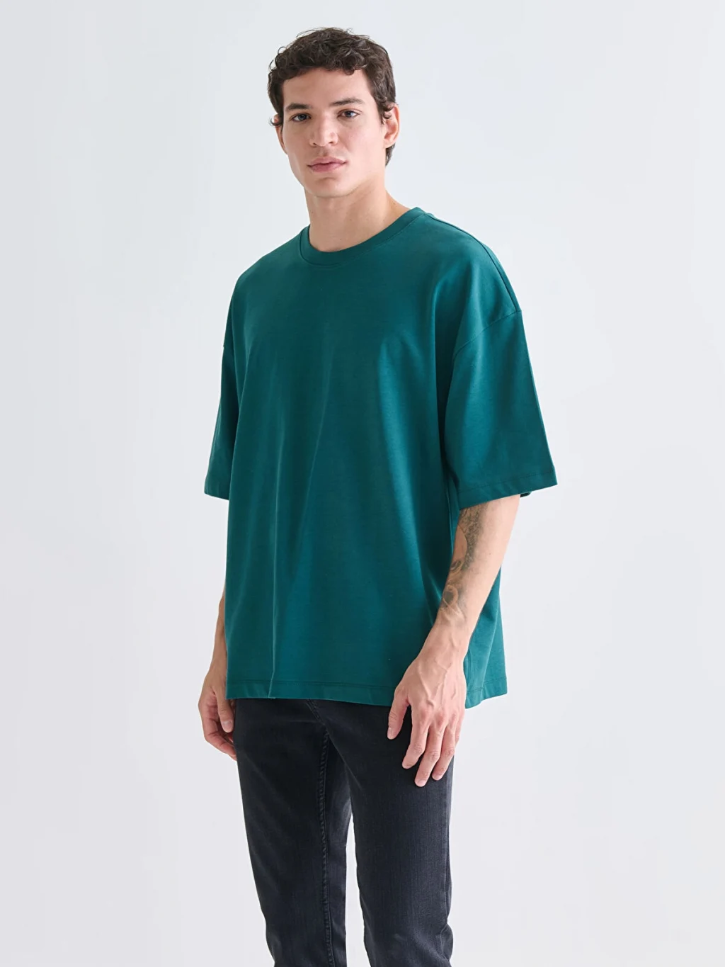 Bisiklet yaka ve kısa kollu erkek tişört, %100 pamuklu penye kumaştan üretilmiştir ve bol kalıplıdır.