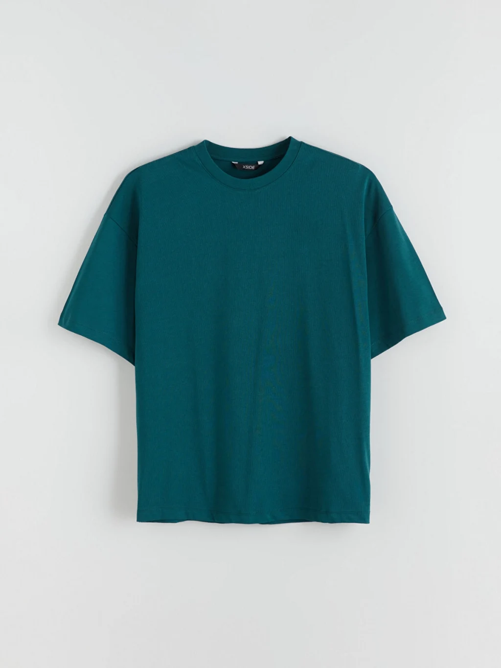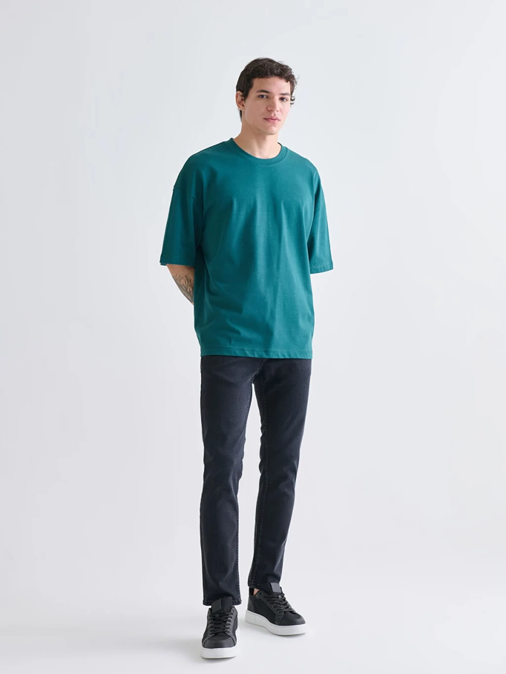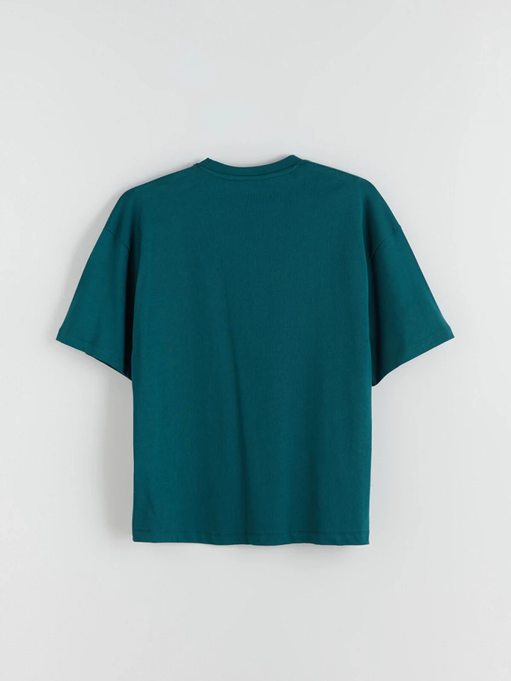 Bisiklet yaka ve kısa kollu erkek tişört, %100 pamuklu penye kumaştan üretilmiştir ve bol kalıplıdır.