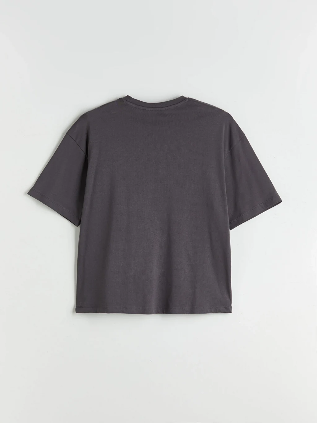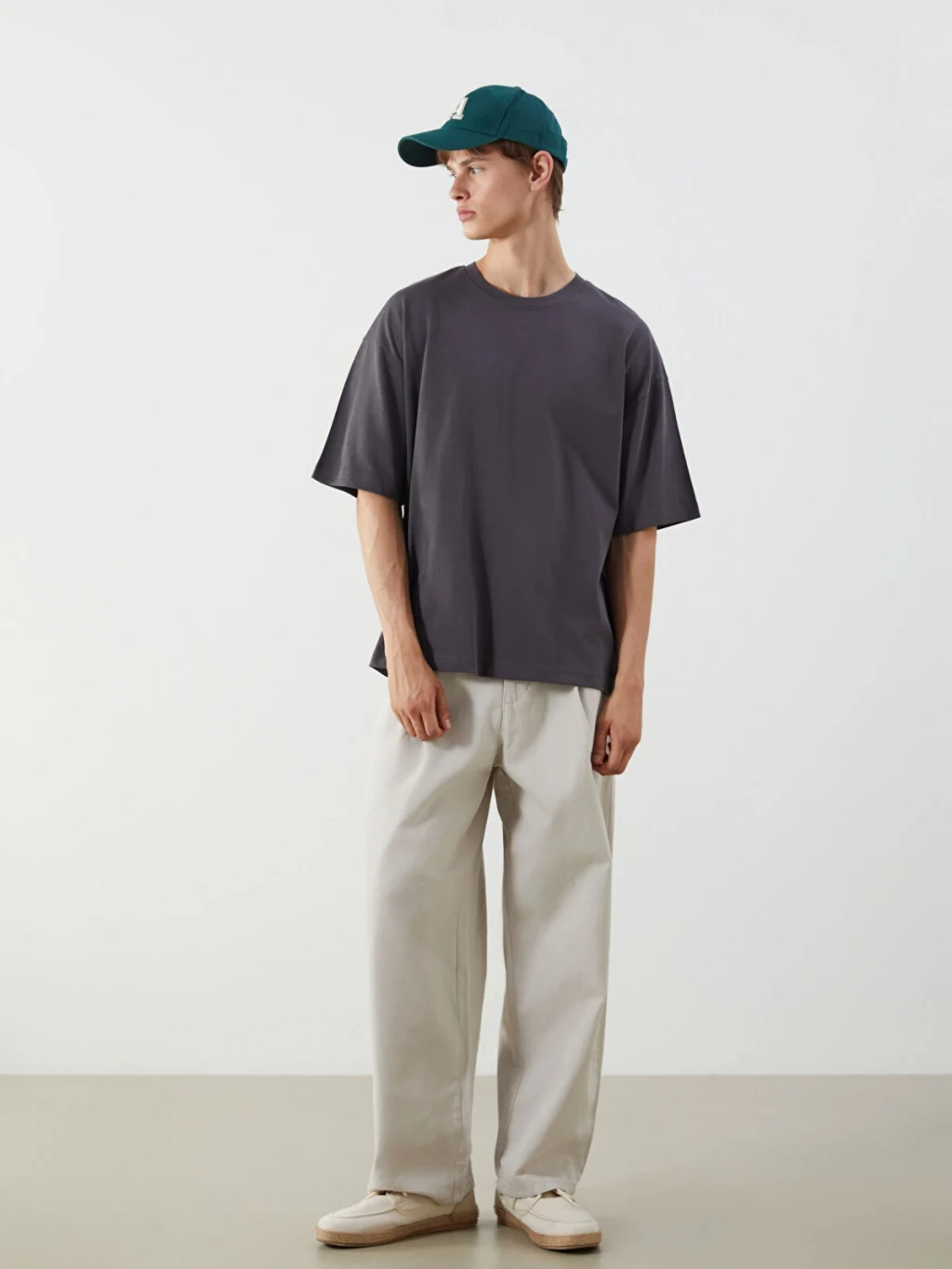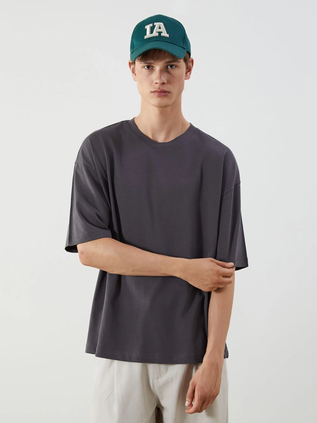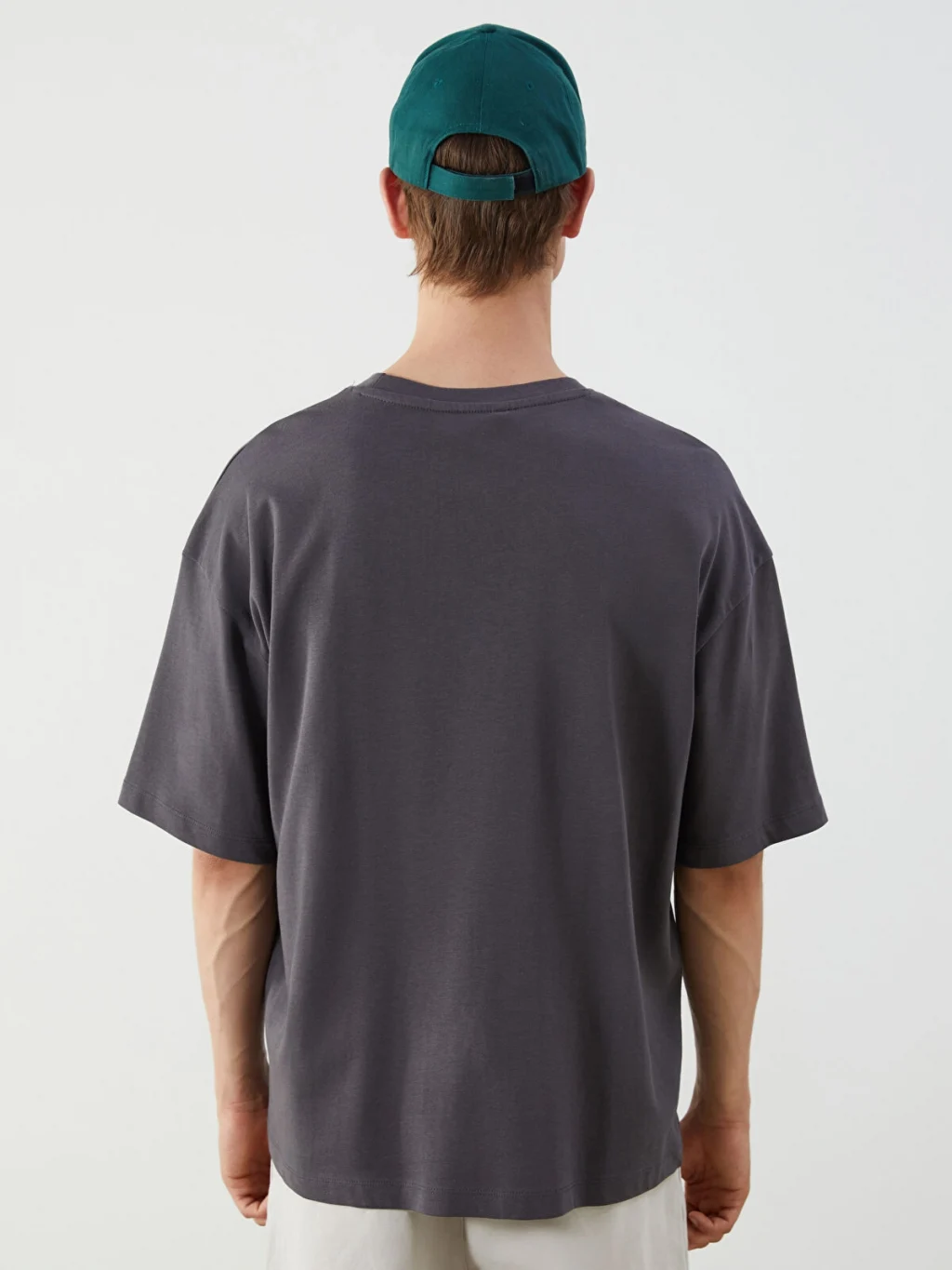 Bisiklet yaka ve kısa kollu erkek tişört, %100 pamuklu penye kumaştan üretilmiştir ve bol kalıplıdır.