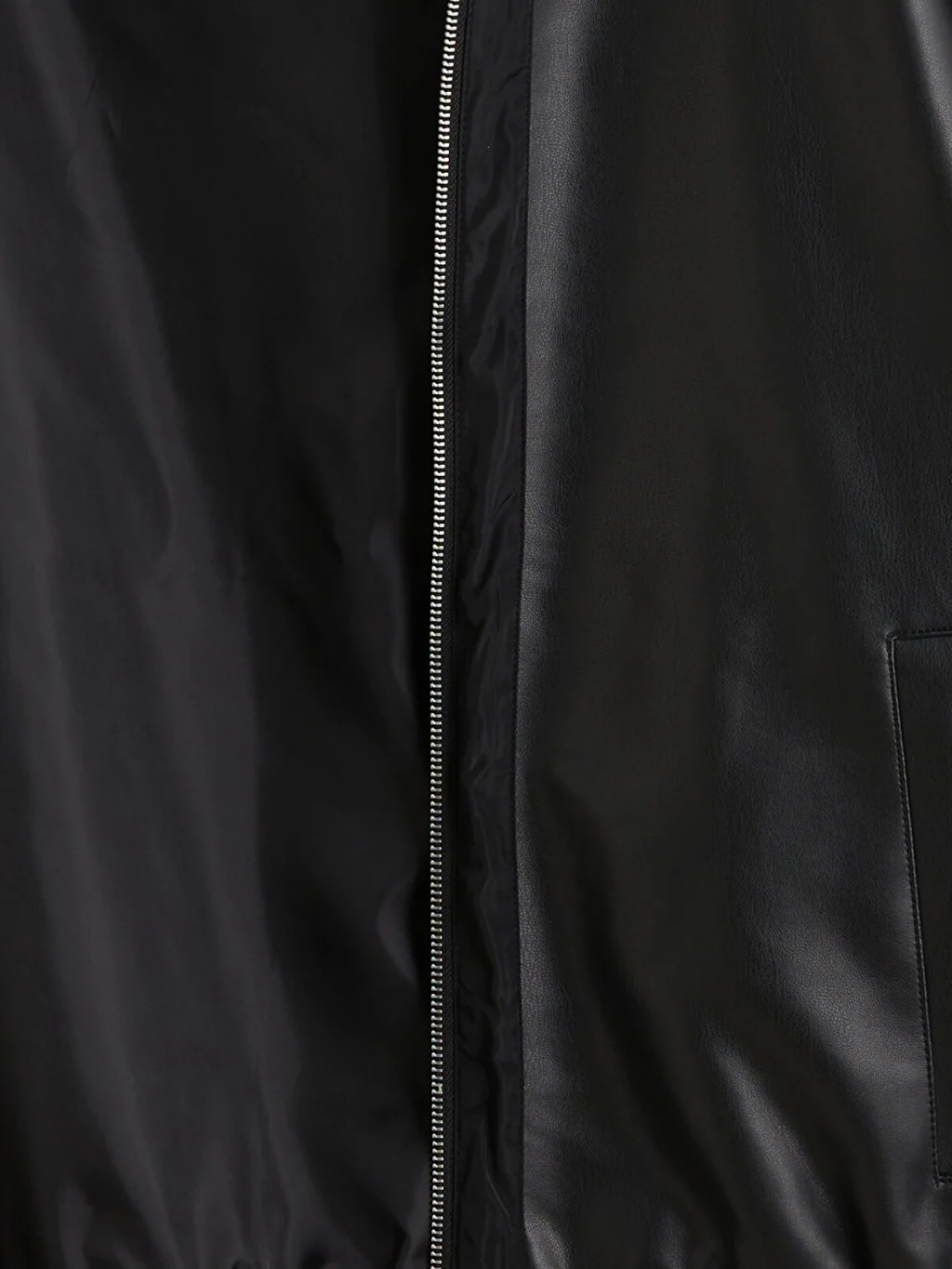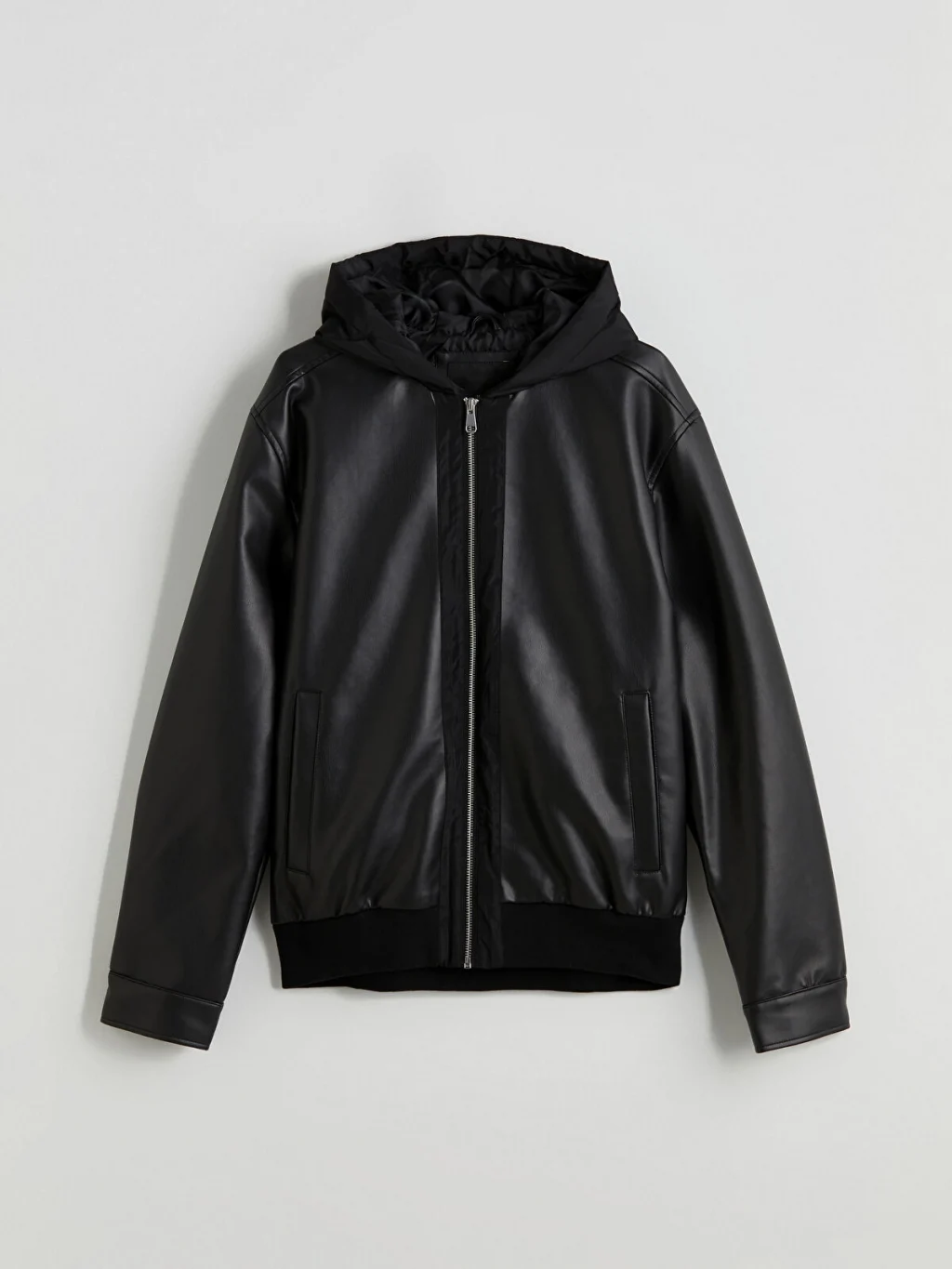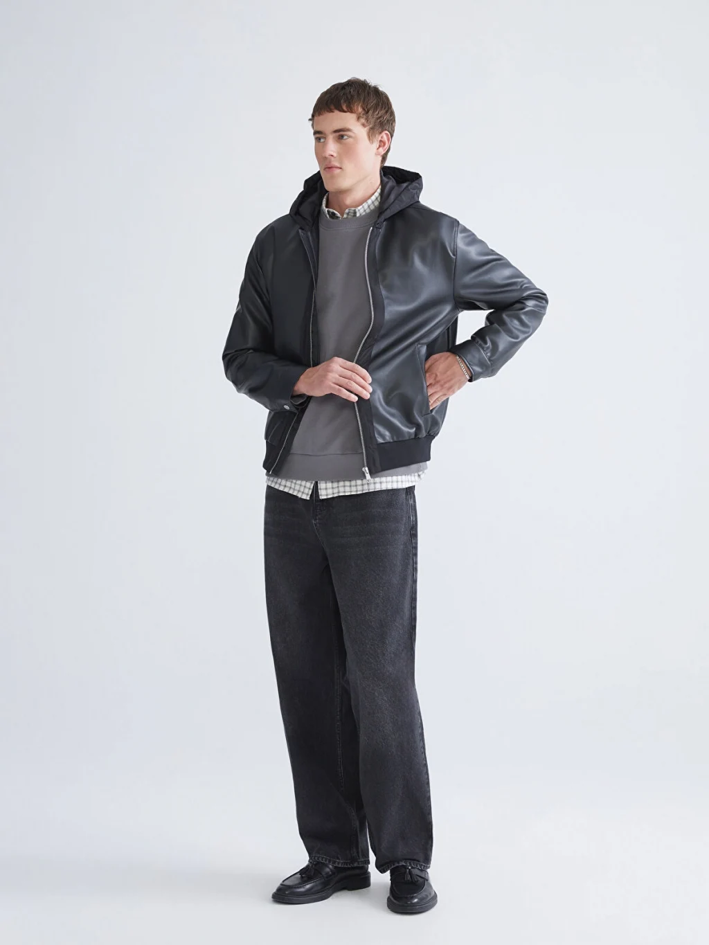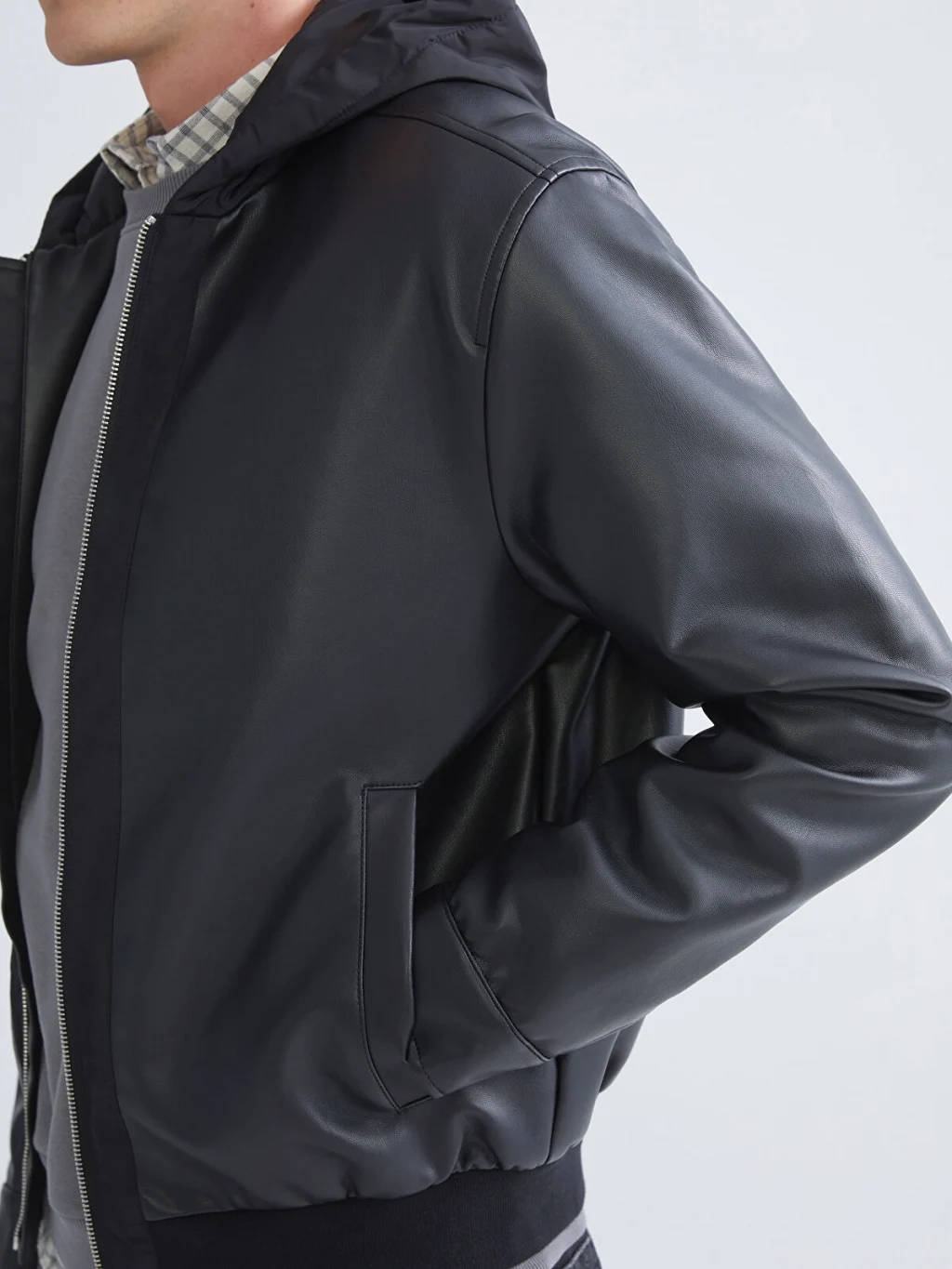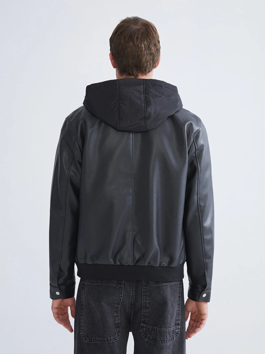 Sabit kapüşonlu, uzun kollu erkek deri görünümlü mont, fermuar kapamalıdır. Etek ucu ve manşetleri ribanalıdır.