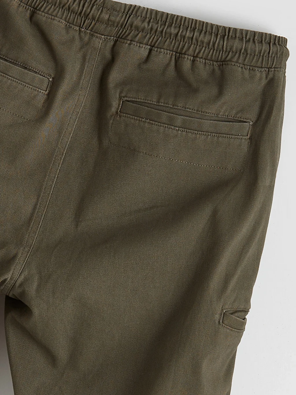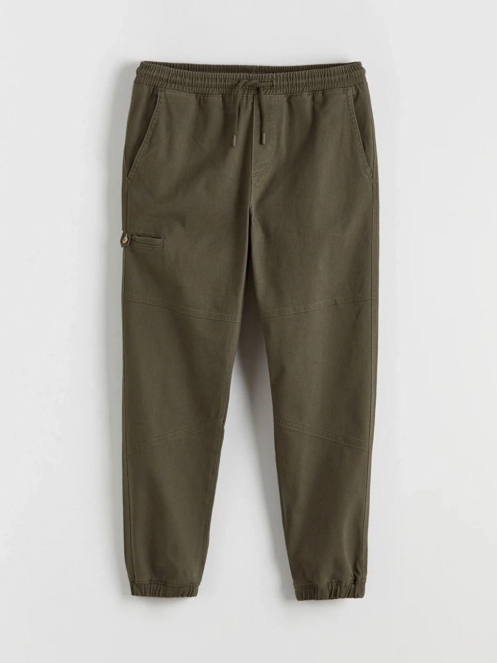 Dar kalıp erkek pantolon, beli lastikli ve ayarlanabilir bağcıklıdır. Yan cepleri ve paçaları lastiklidir.