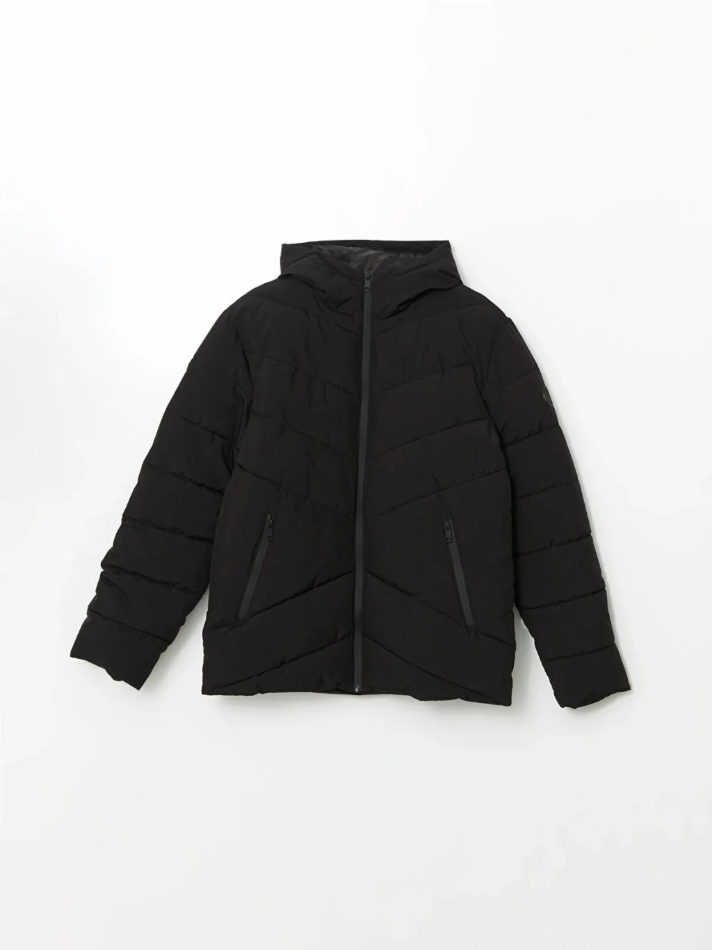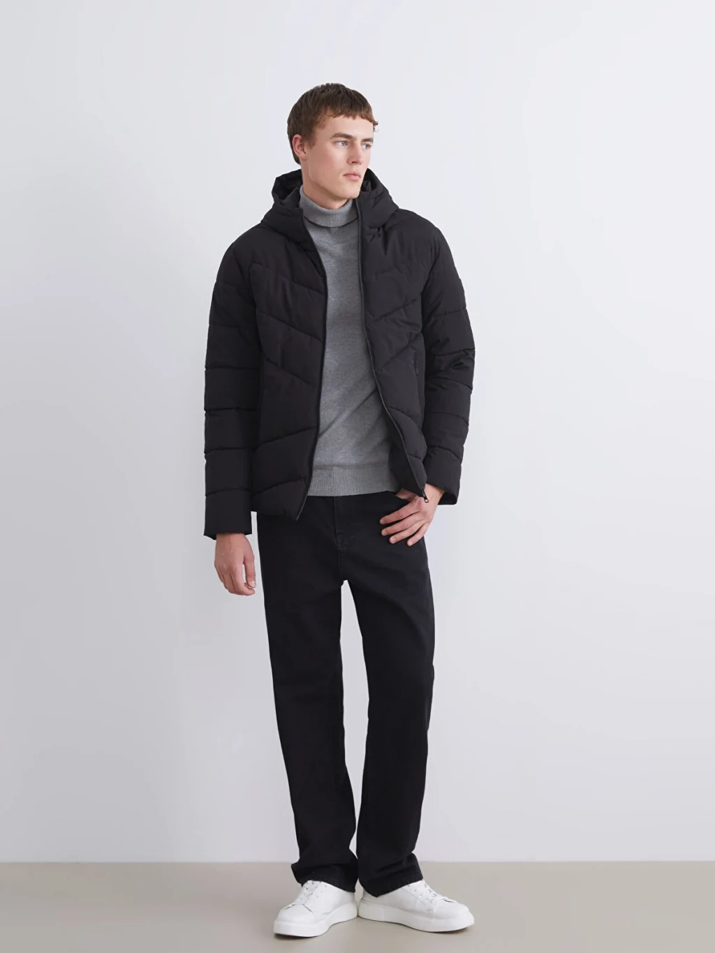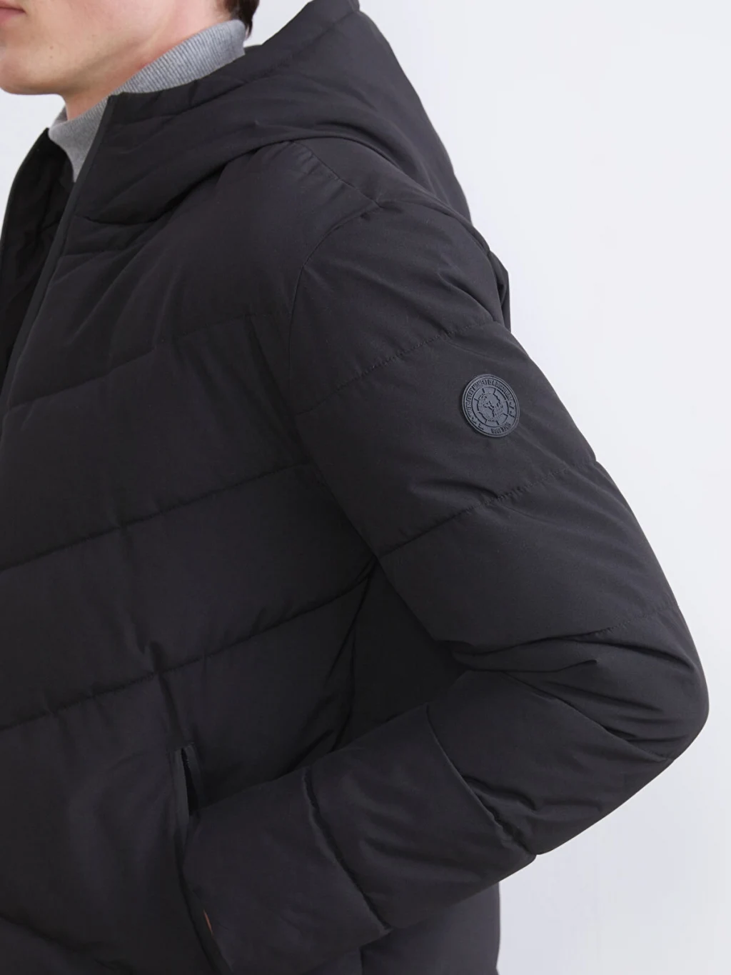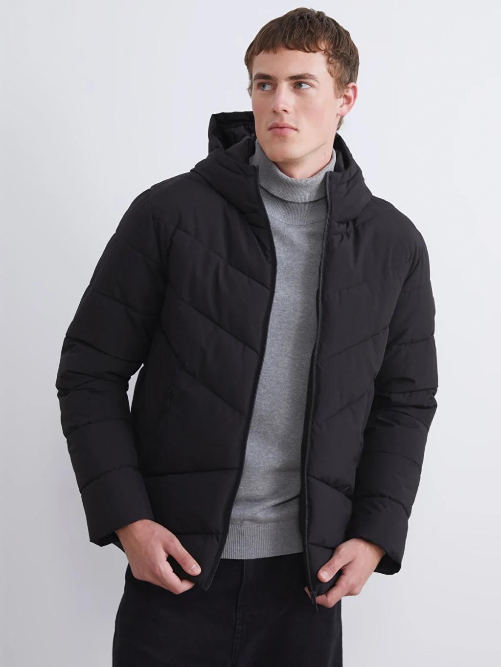Sabit kapüşonlu, fermuar kapamalı, kapitone desenli erkek şişme mont. Uzun kollu ve yanları fermuarlı cepli olup, kalın yapılıdır.